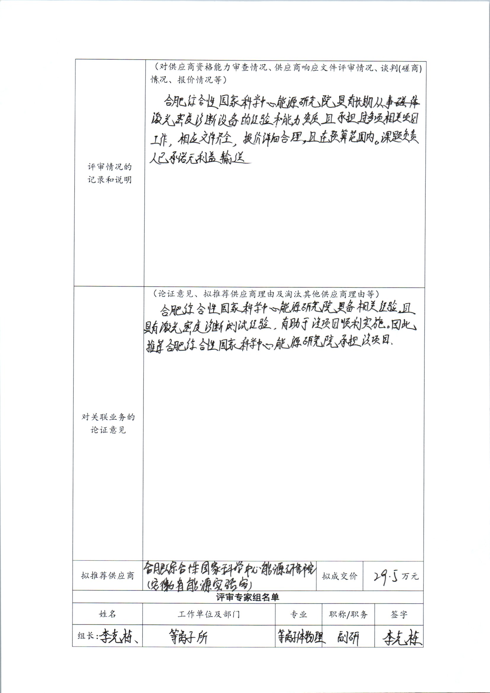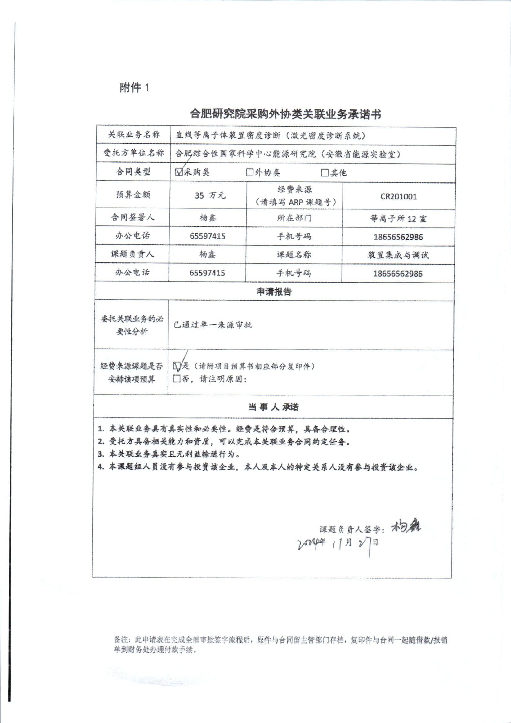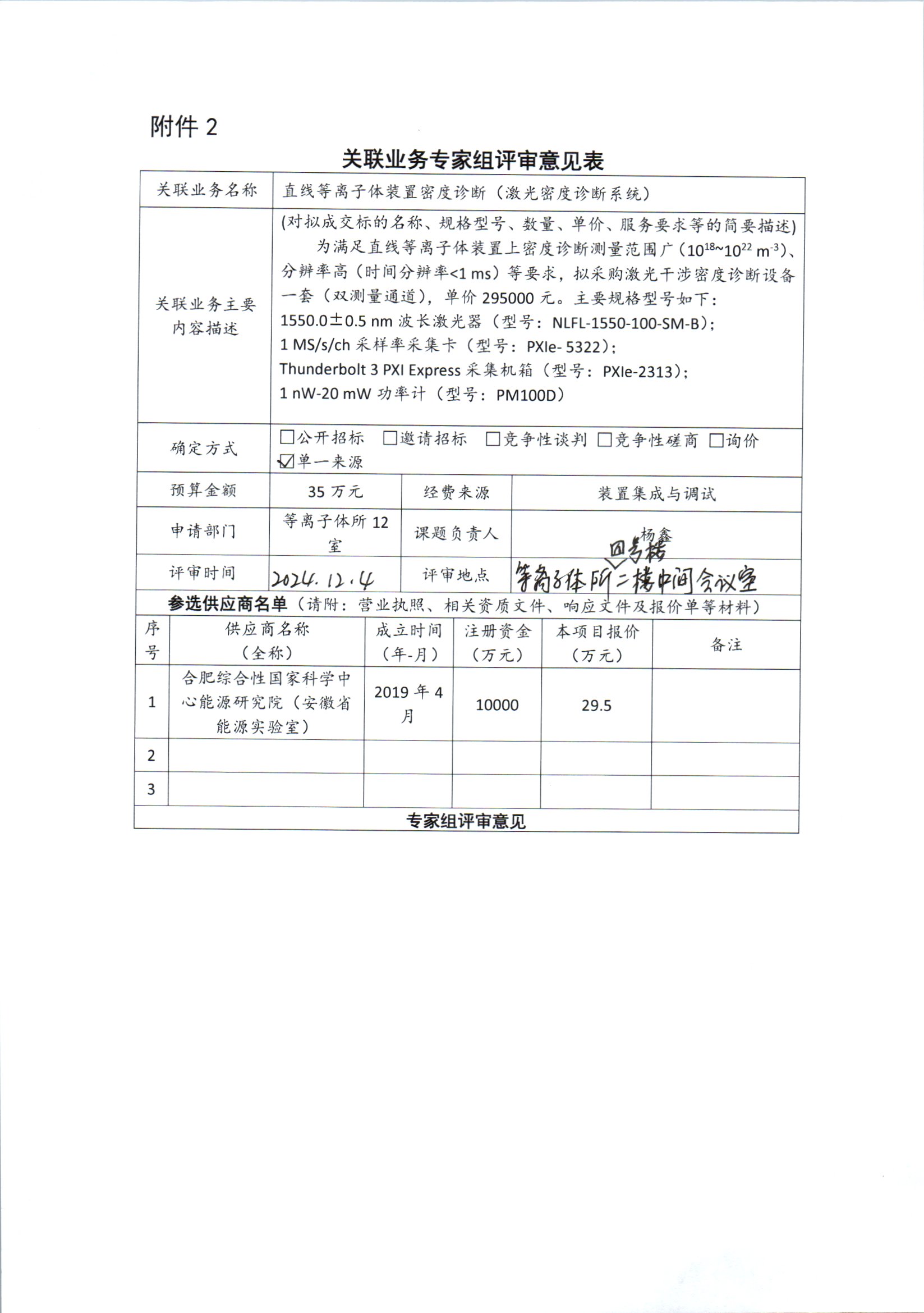 根据《中国科学院关于加强科研项目关联业务管理的暂行规定》(科发条财字〔2015〕125号)、《中国科学院合肥物质科学研究院关于加强科研项目关联业务管理的实施细则》(科合院发资字〔2021〕8号)、《合肥研究院加强关联业务管理暂行办法》(科合院发资字〔2022〕1号)要求,现就我院委托合肥综合性国家科学中心能源研究院(安徽省能源实验室)研制激光密度诊断系统进行关联业务公示。