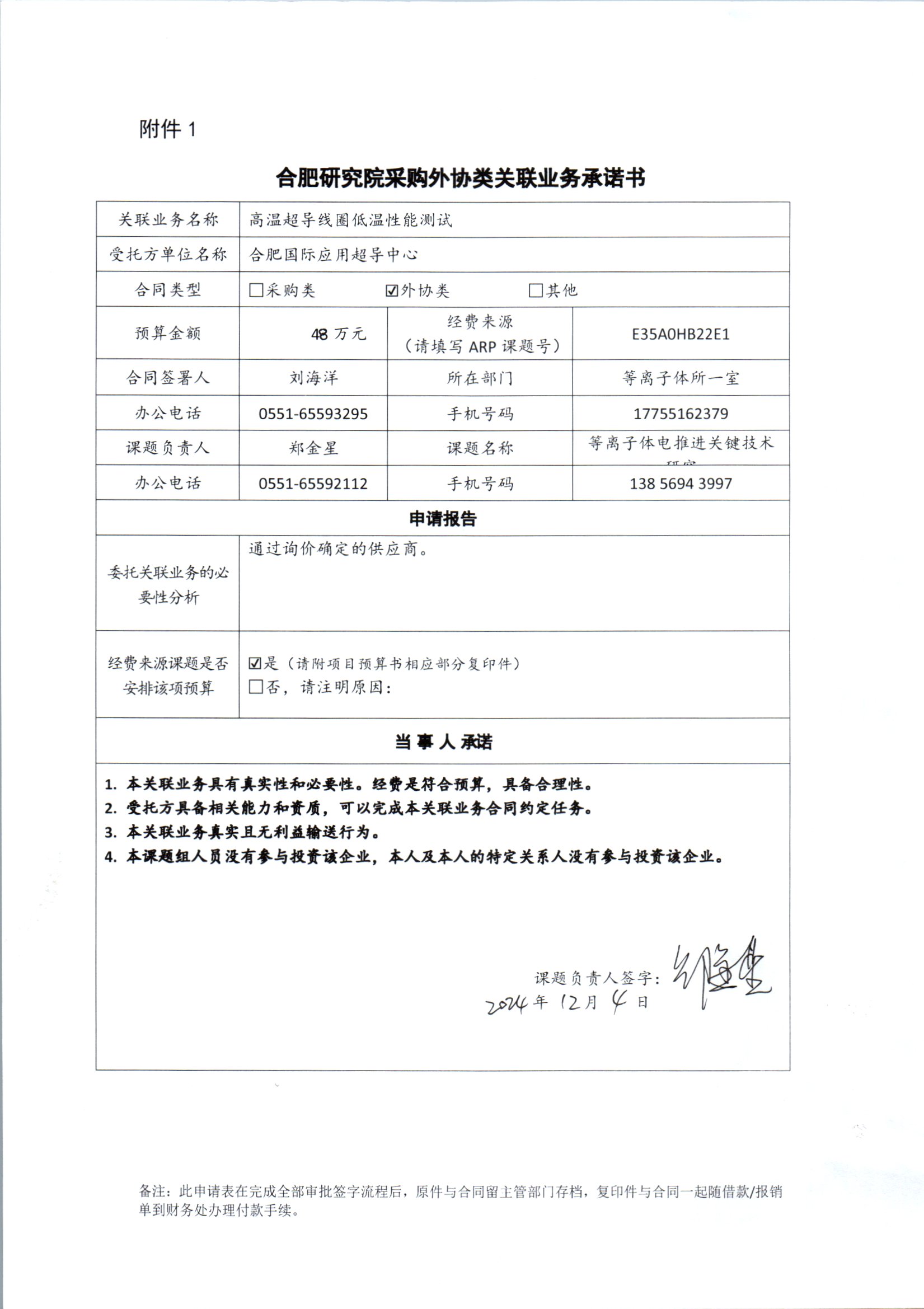 根据《中国科学院关于加强科研项目关联业务管理的暂行规定》(科发条财字〔2015〕125号)、《中国科学院合肥物质科学研究院关于加强科研项目关联业务管理的实施细则》(科合院发资字〔2021〕8号)、《合肥研究院加强关联业务管理暂行办法》(科合院发资字〔2022〕1号)要求,现就我院委托合肥国际应用超导中心进行高温超导线圈低温性能测试项目进行关联业务公示。