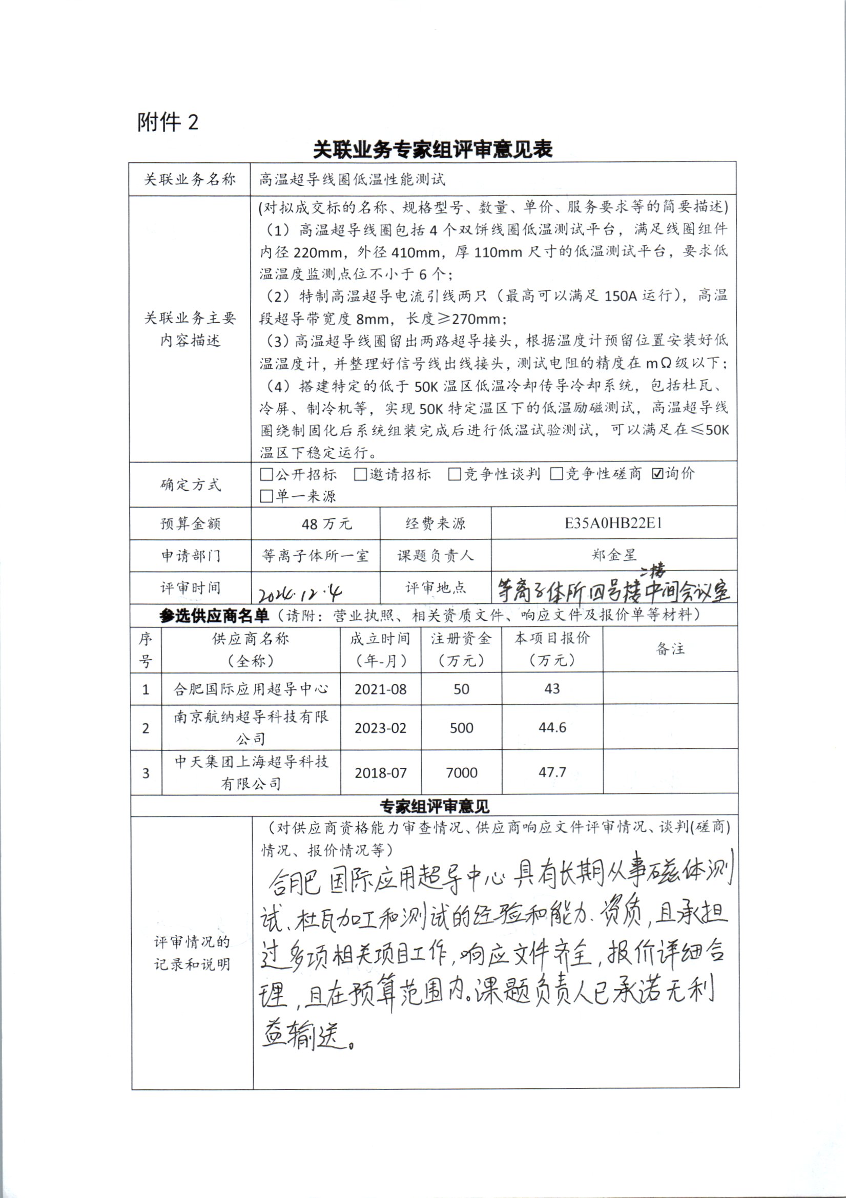 中国科学院合肥物质科学研究院等离子体物理研究所郑金星老师委托合肥国际应用超导中心进行高温超导线圈低温性能测试。该线圈是超导磁体的核心部件,而且采用的传导冷却方式,需要搭建50K多温区下的测试平台和相关的低温测试条件完成低温性能评估。合肥国际应用超导中心由合肥科学岛控股有限公司与合肥经济技术开发区管理委员会共同发起组建,本次服务构成关联业务交易。