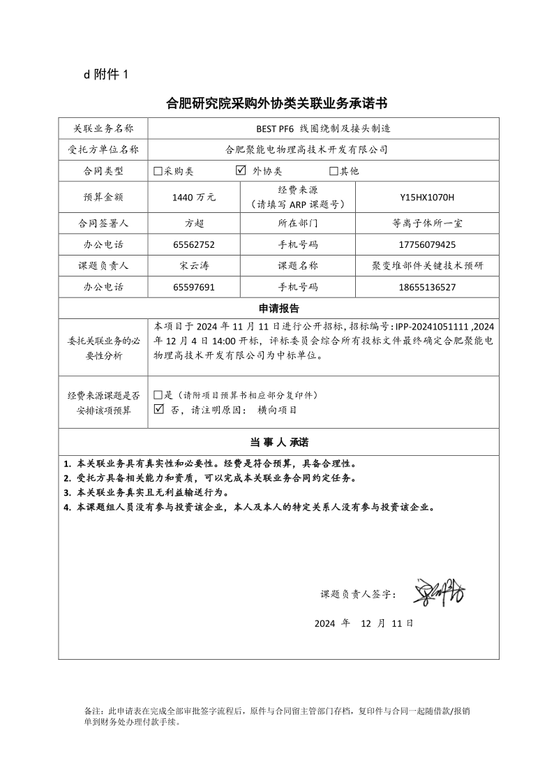 根据《中国科学院关于加强科研项目关联业务管理的暂行规定》(科发条财字〔2015〕125号)、《中国科学院合肥物质科学研究院关于加强科研项目关联业务管理的实施细则》(科合院发资字〔2021〕8号)、《合肥研究院加强关联业务管理暂行办法》(科合院发资字〔2022〕1号)要求,现就我院委托合肥聚能电物理高技术开发有限公司进行BEST PF6 线圈绕制及接头制造项目进行关联业务公示。