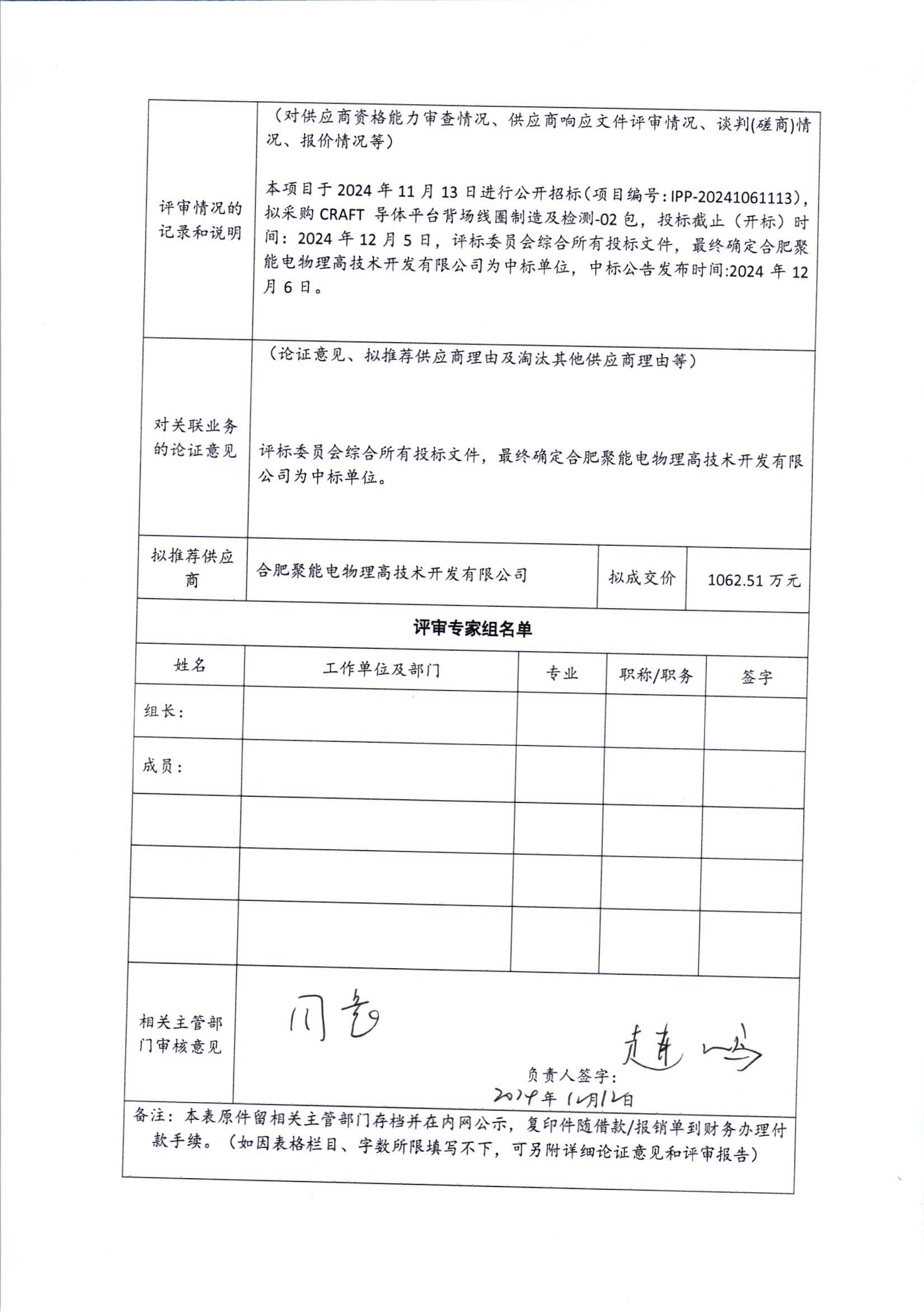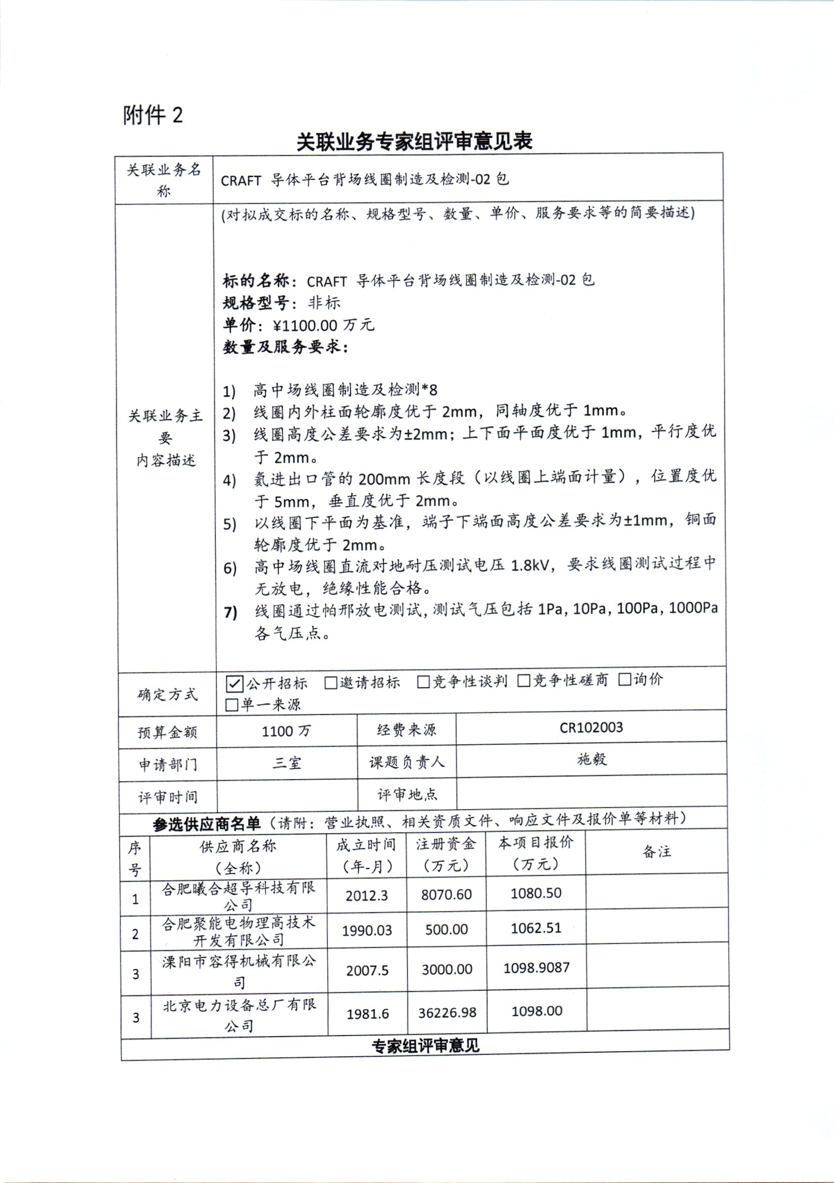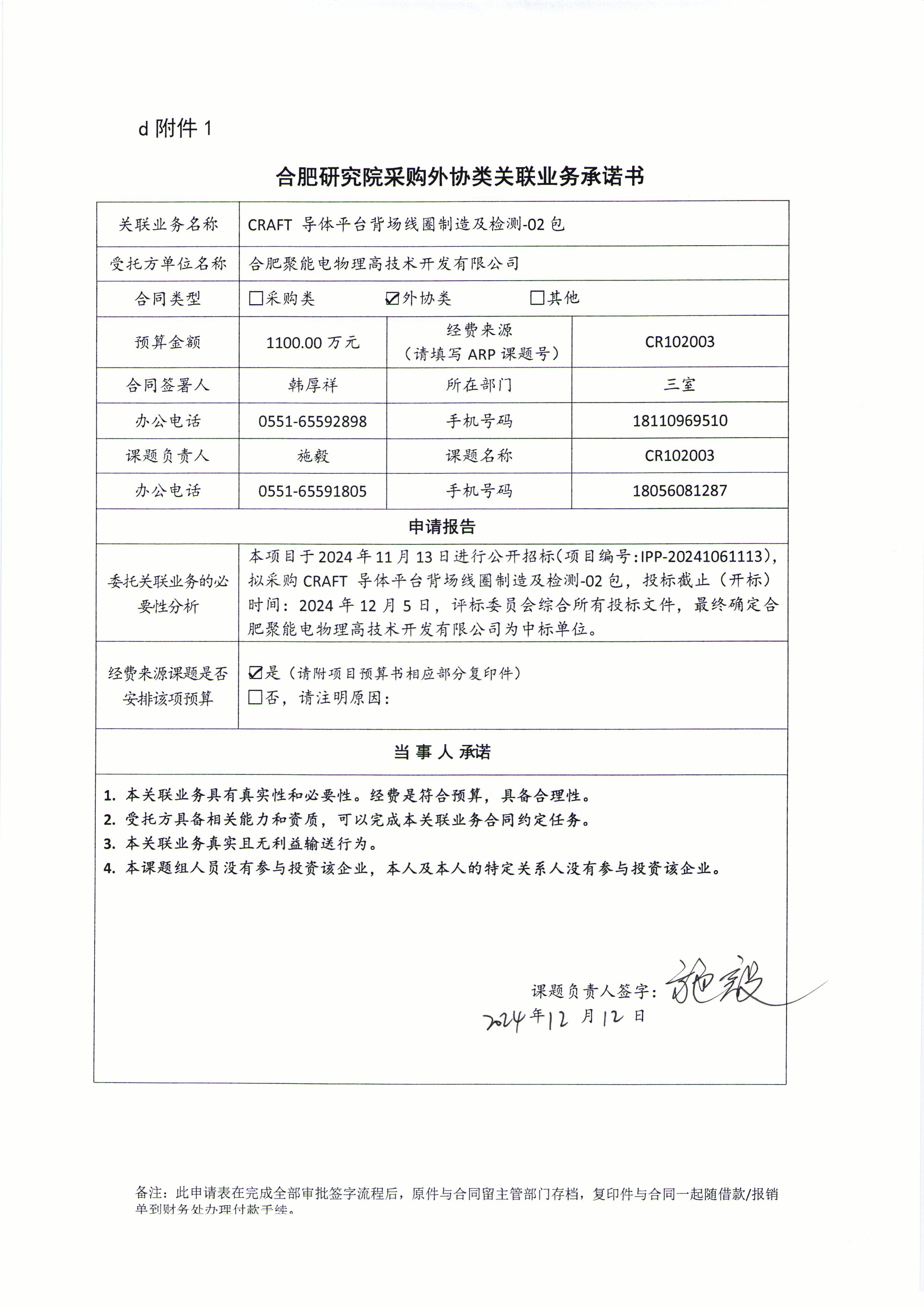 根据《中国科学院关于加强科研项目关联业务管理的暂行规定》(科发条财字〔2015〕125号)、《中国科学院合肥物质科学研究院关于加强科研项目关联业务管理的实施细则》(科合院发资字〔2021〕8号)、《合肥研究院加强关联业务管理暂行办法》(科合院发资字〔2022〕1号)要求,现就我院委托合肥聚能电物理高技术开发有限公司进行CRAFT 导体平台背场线圈制造及检测-02包项目进行关联业务公示。