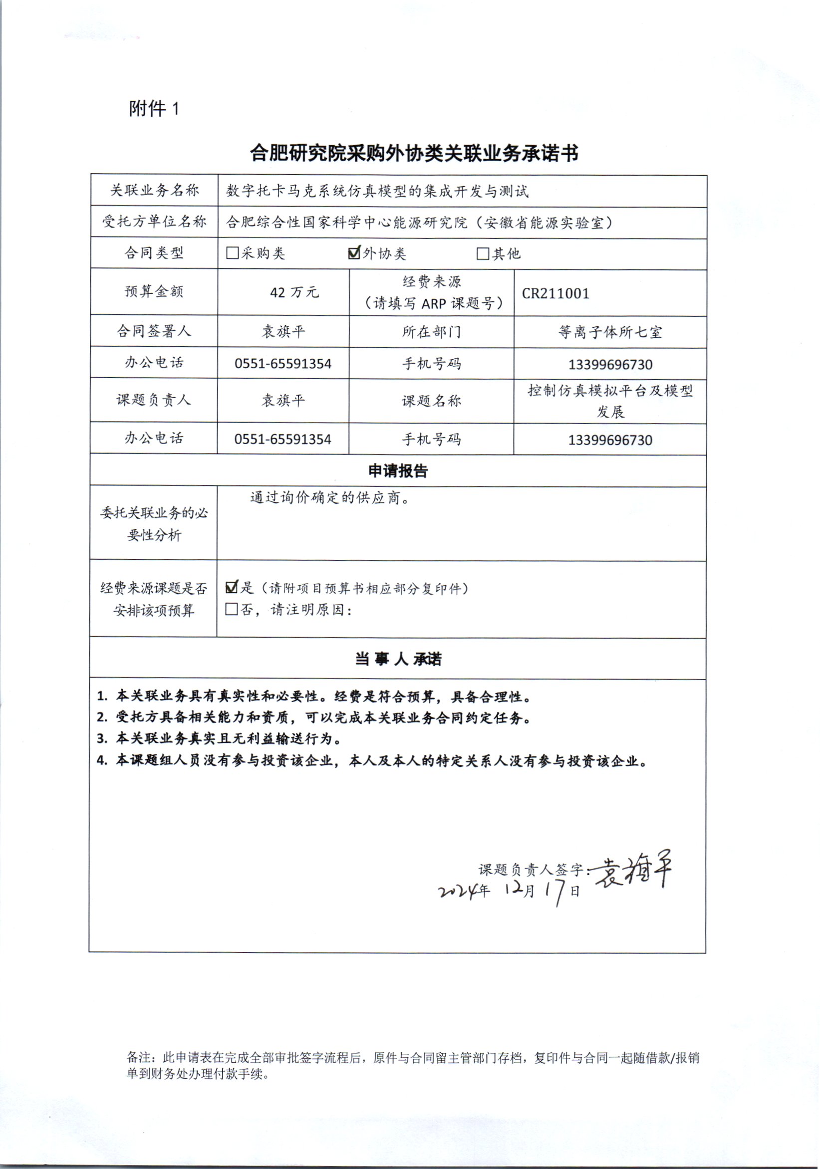 中国科学院合肥物质科学研究院等离子体物理研究所袁旗平老师委托合肥综合性国家科学中心能源研究院(安徽省能源实验室)进行进行数字托卡马克系统仿真模型的集成开发与测试。该开发基于等离子体控制仿真验证平台(PCSVP)集成托卡马克等离子体响应、等离子体控制及诊断系统仿真模型,设计模型之间的数据接口,完成模型与等离子体控制系统的闭环仿真模拟。合肥综合性国家科学中心能源研究院(安徽省能源实验室)由安徽省人民政府、中国科学院合作建设领导小组办公室共同举办。我院有职工在该单位兼职,本次业务构成关联业务交易。