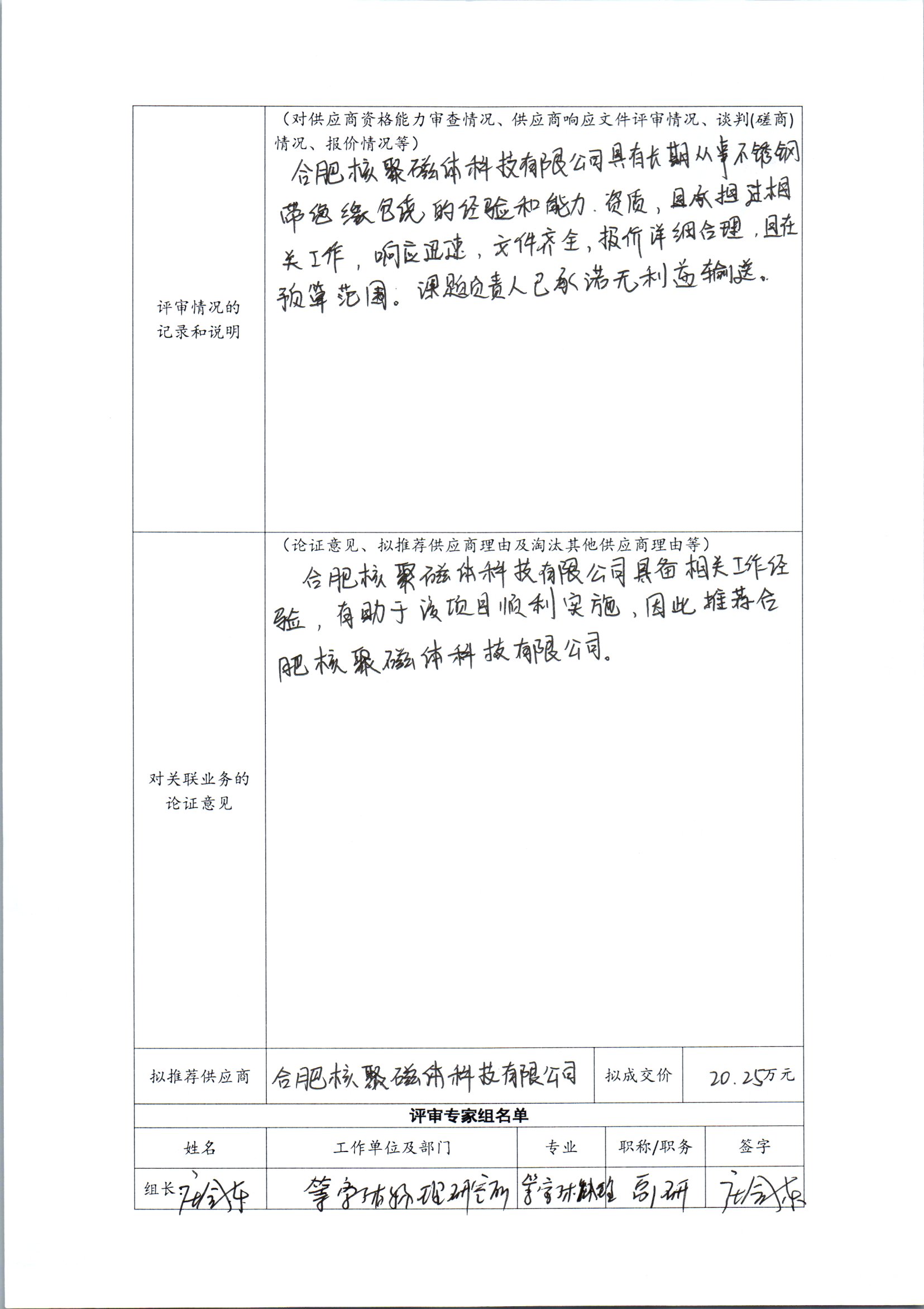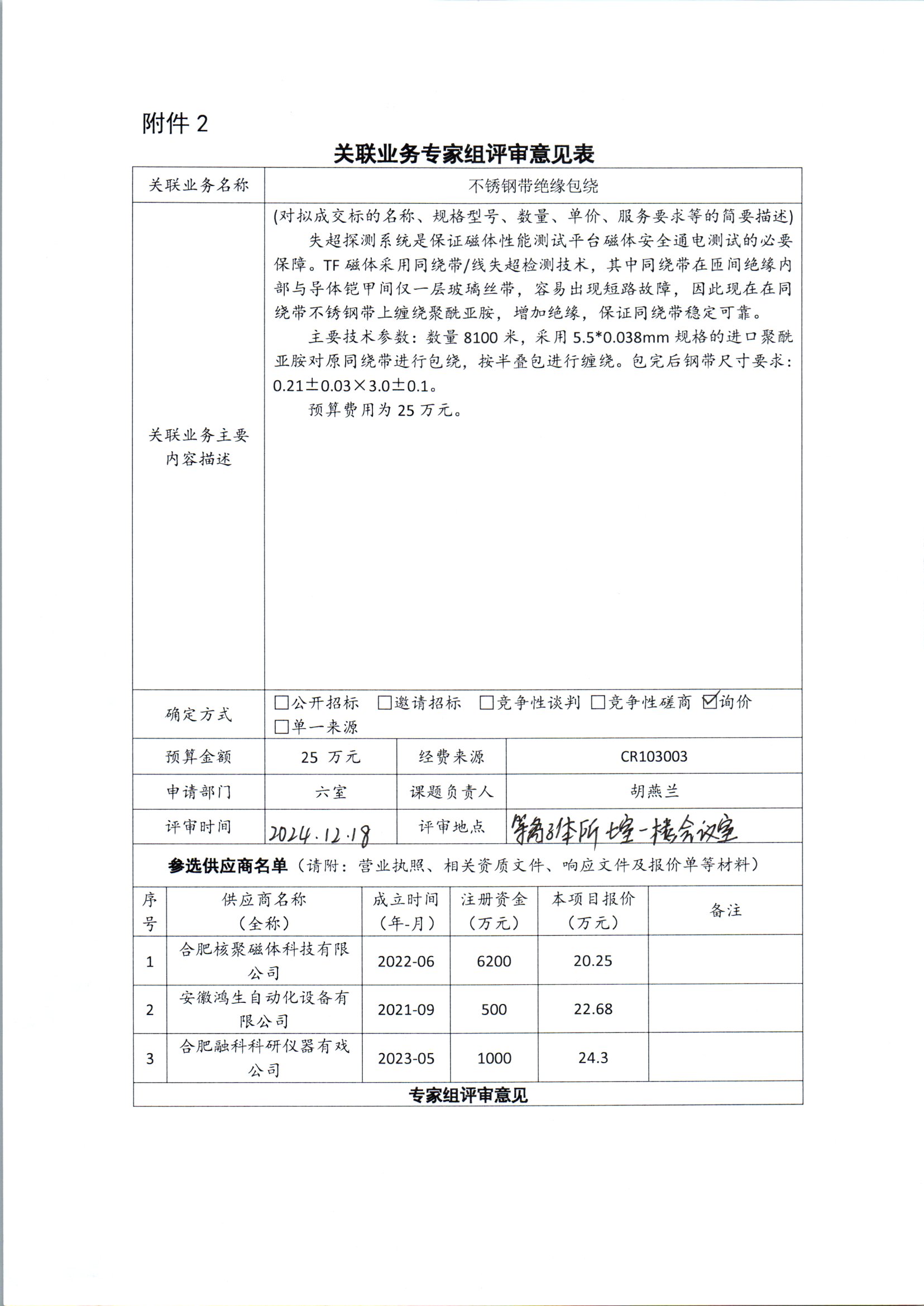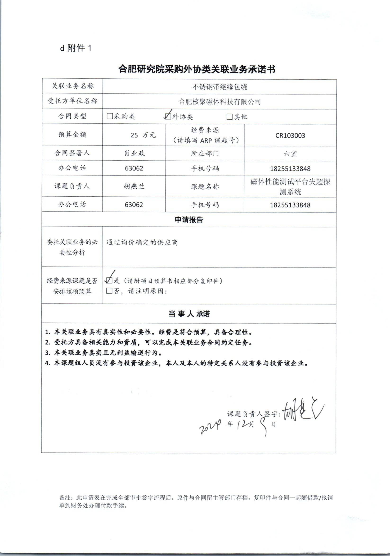 根据《中国科学院关于加强科研项目关联业务管理的暂行规定》(科发条财字〔2015〕125号)、《中国科学院合肥物质科学研究院关于加强科研项目关联业务管理的实施细则》(科合院发资字〔2021〕8号)、《合肥研究院加强关联业务管理暂行办法》(科合院发资字〔2022〕1号)要求,现就我院委托合肥核聚磁体科技有限公司进行不锈钢带绝缘包绕项目进行关联业务公示。