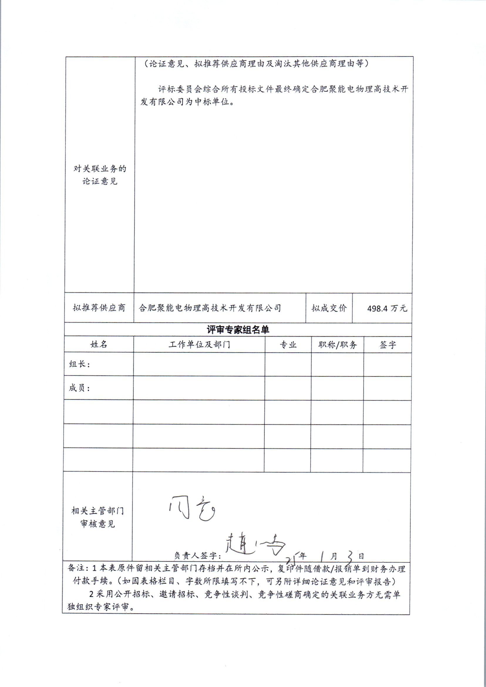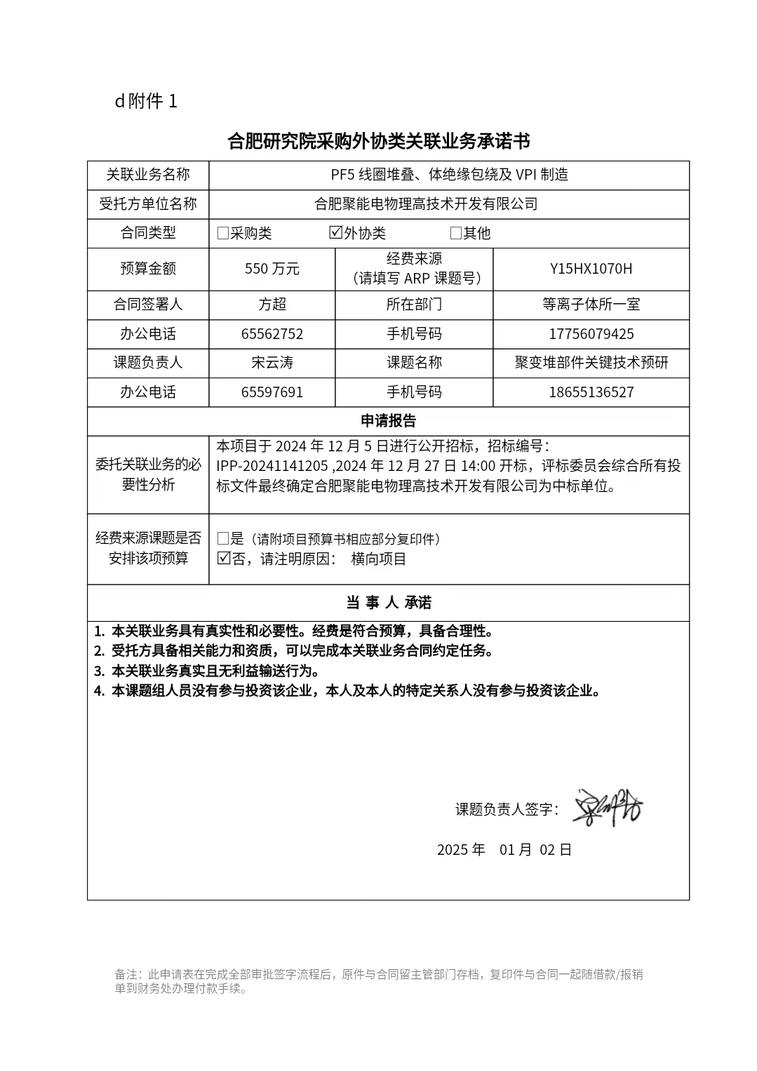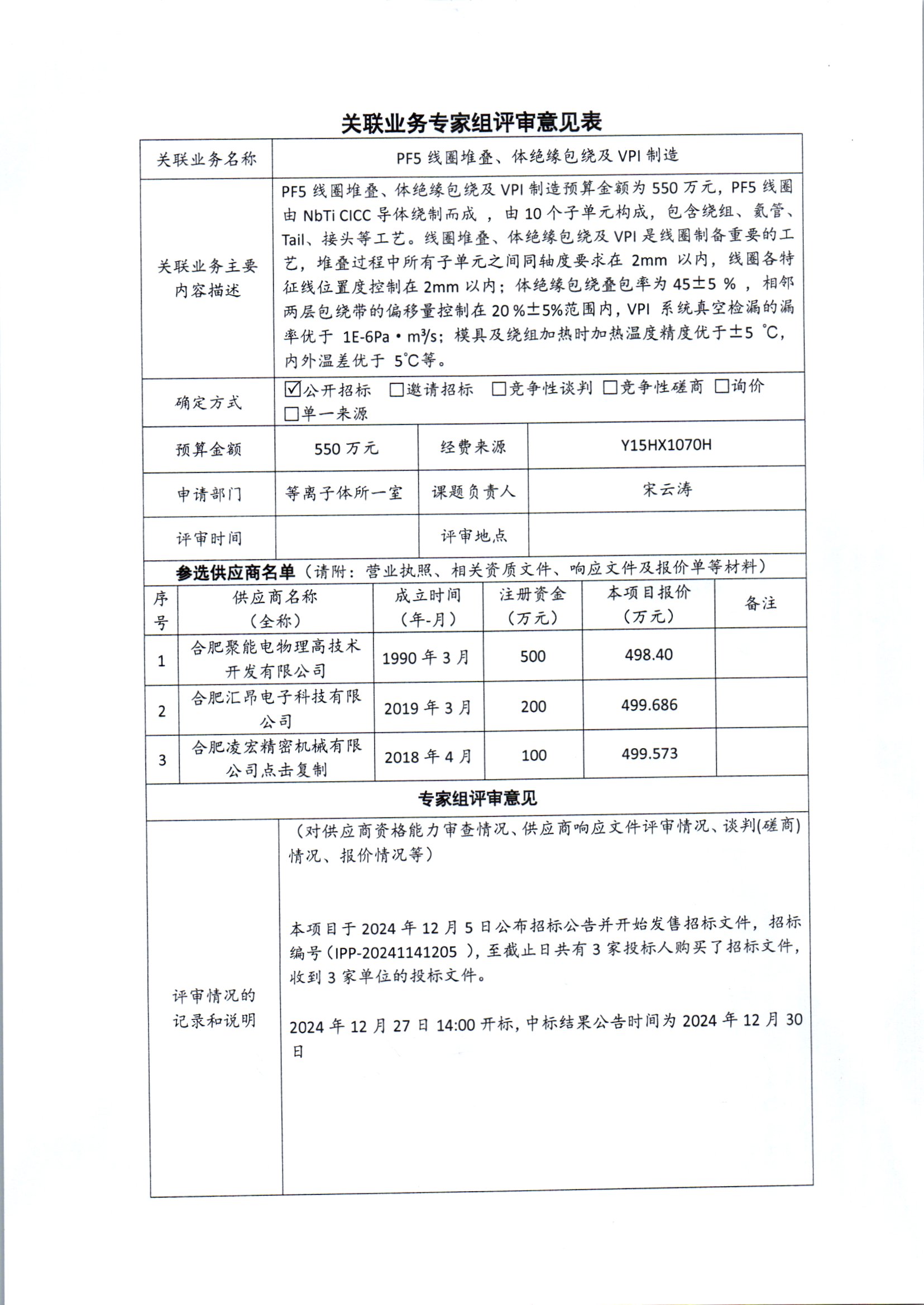 根据《中国科学院关于加强科研项目关联业务管理的暂行规定》(科发条财字〔2015〕125号)、《中国科学院合肥物质科学研究院关于加强科研项目关联业务管理的实施细则》(科合院发资字〔2021〕8号)、《合肥研究院加强关联业务管理暂行办法》(科合院发资字〔2022〕1号)要求,现就我院委托合肥聚能电物理高技术开发有限公司进行PF5线圈堆叠、体绝缘包绕及VPI制造的项目进行关联业务公示。