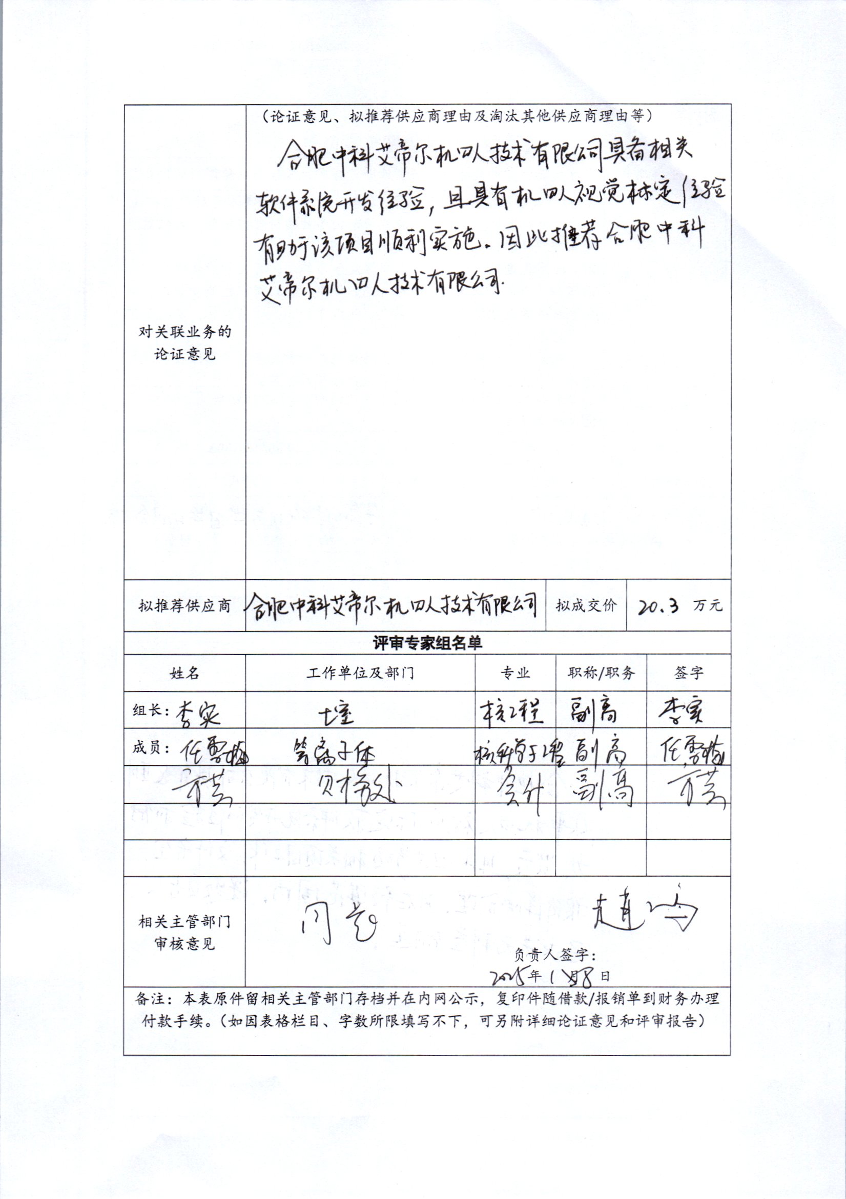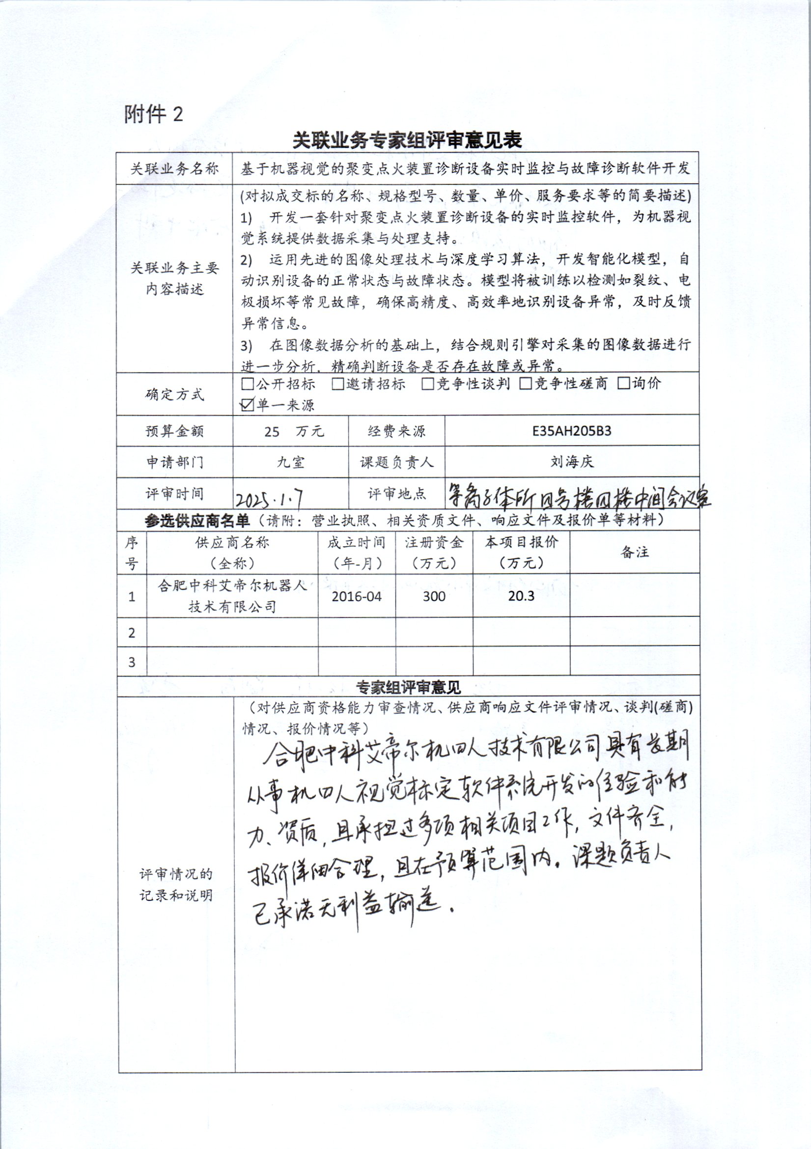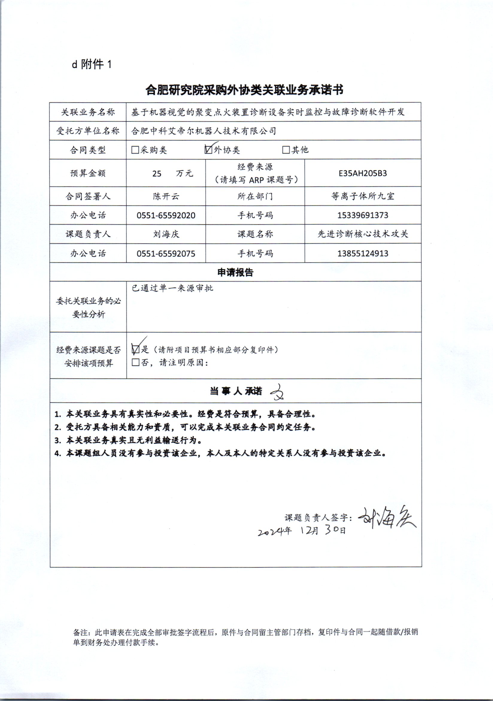 中国科学院合肥物质科学研究院等离子体物理研究所刘海庆老师委托合肥中科艾帝尔机器人技术有限公司进行基于机器视觉的聚变点火装置诊断设备实时监控与故障诊断软件开发,该软件用于聚变点火装置诊断设备的状态实时监控,结合先进的图像处理与分析算法实时监测设备各个关键部位的运行状态,快速捕捉设备运行中的异常现象,如结构变形、热损伤、部件故障等,为及时采取应急措施提供数据支持。我单位职工在合肥中科艾帝尔机器人技术有限公司持股40%,本次构成关联业务交易。
