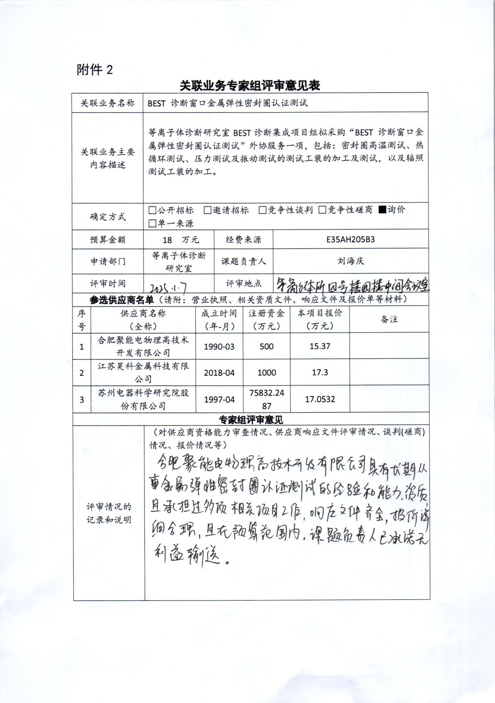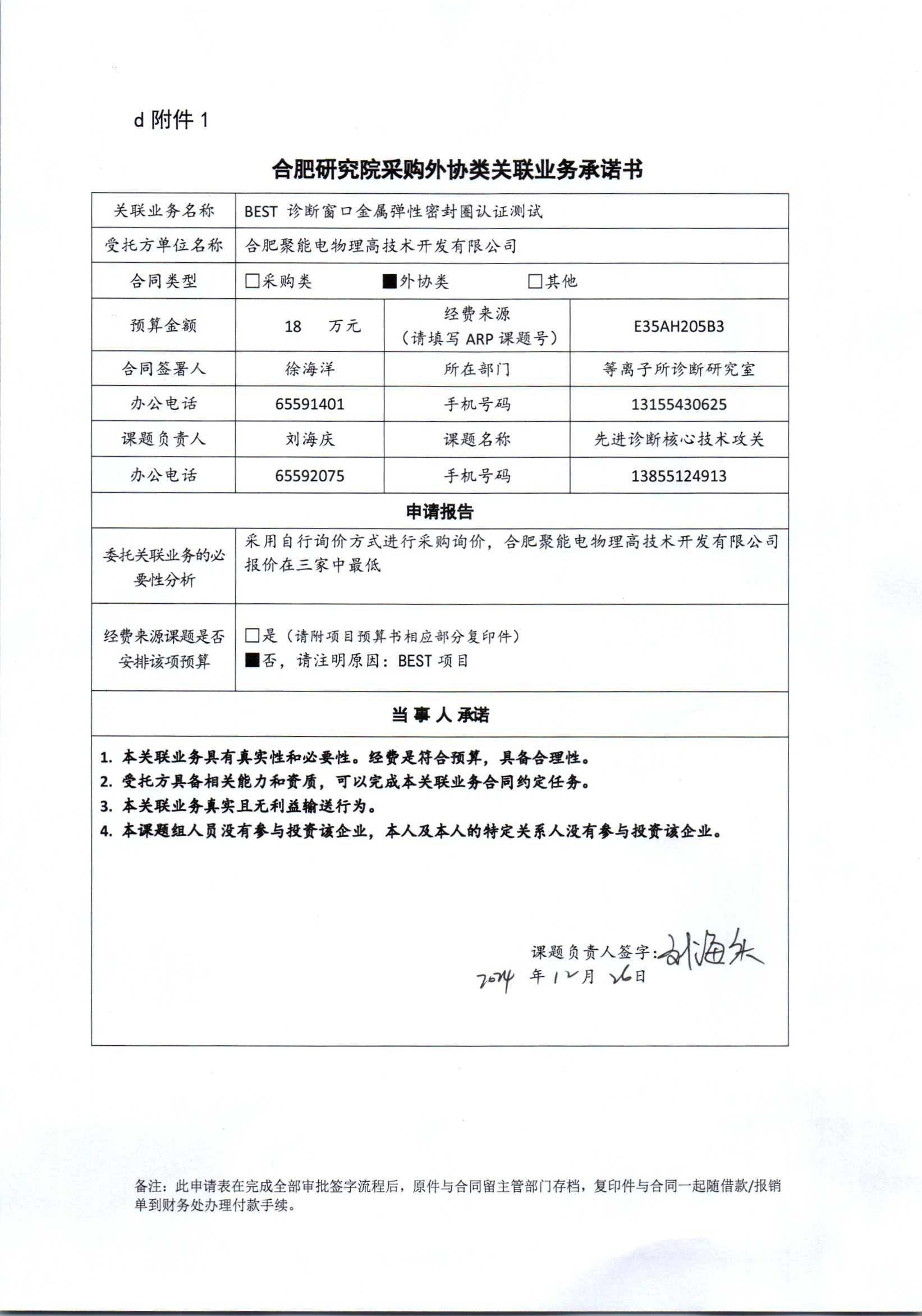 根据《中国科学院关于加强科研项目关联业务管理的暂行规定》(科发条财字〔2015〕125号)、《中国科学院合肥物质科学研究院关于加强科研项目关联业务管理的实施细则》(科合院发资字〔2021〕8号)、《合肥研究院加强关联业务管理暂行办法》(科合院发资字〔2022〕1号)要求,现就我院委托合肥聚能电物理高技术开发有限公司进行BEST 诊断窗口金属弹性密封圈认证测试项目进行关联业务公示。