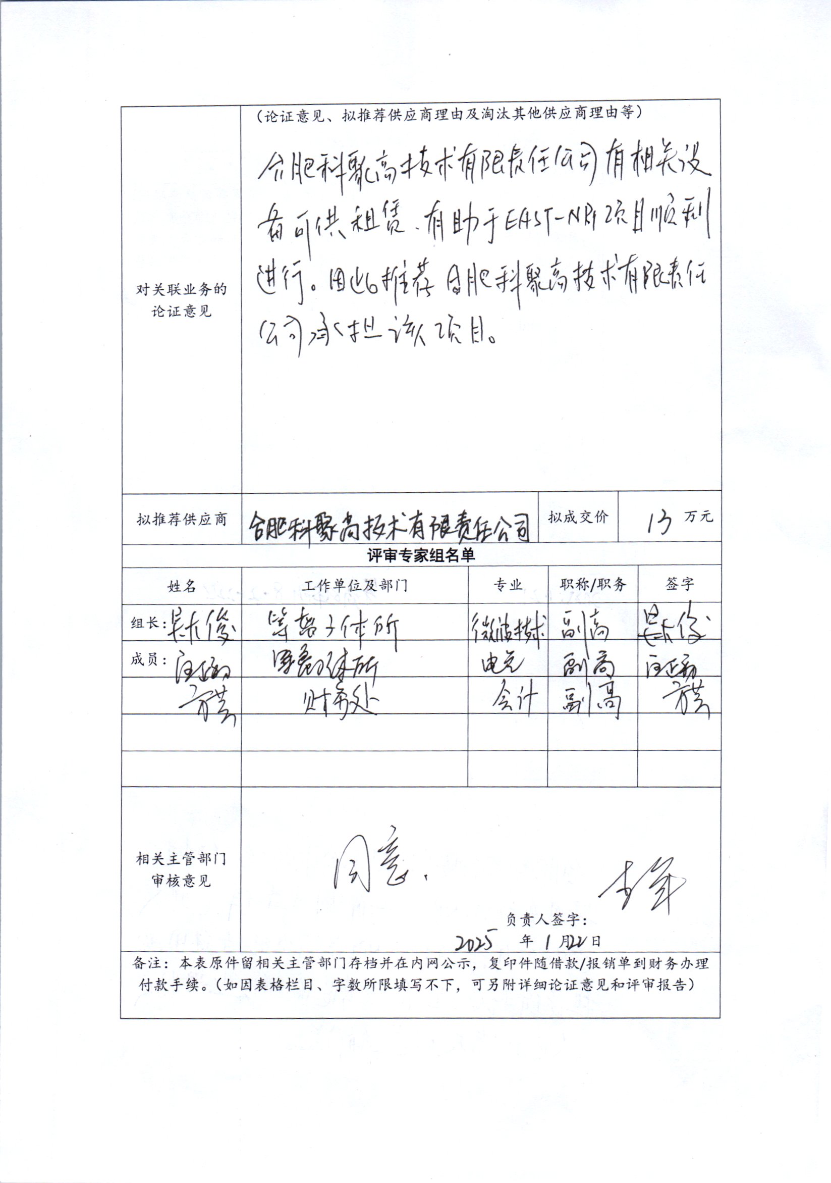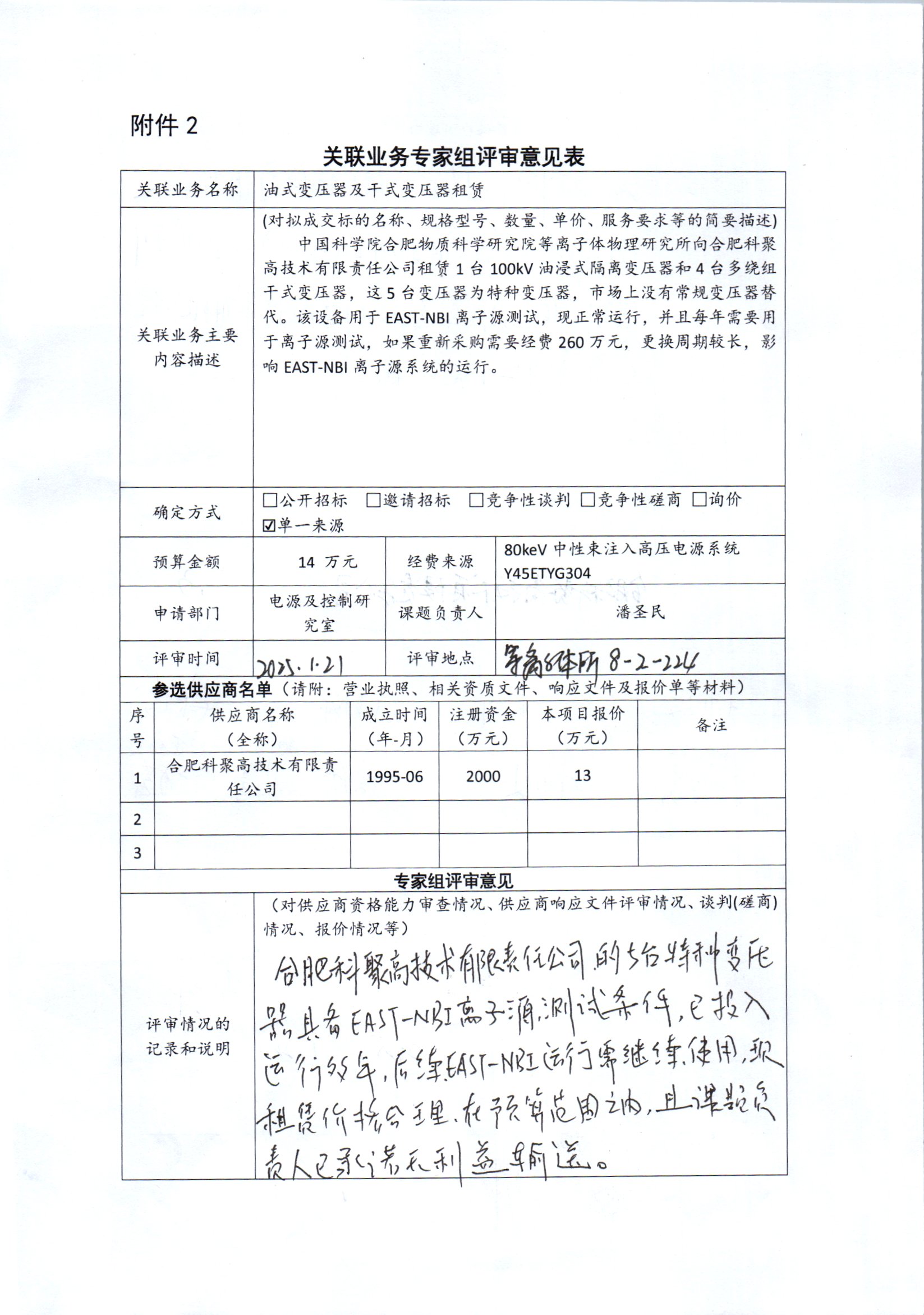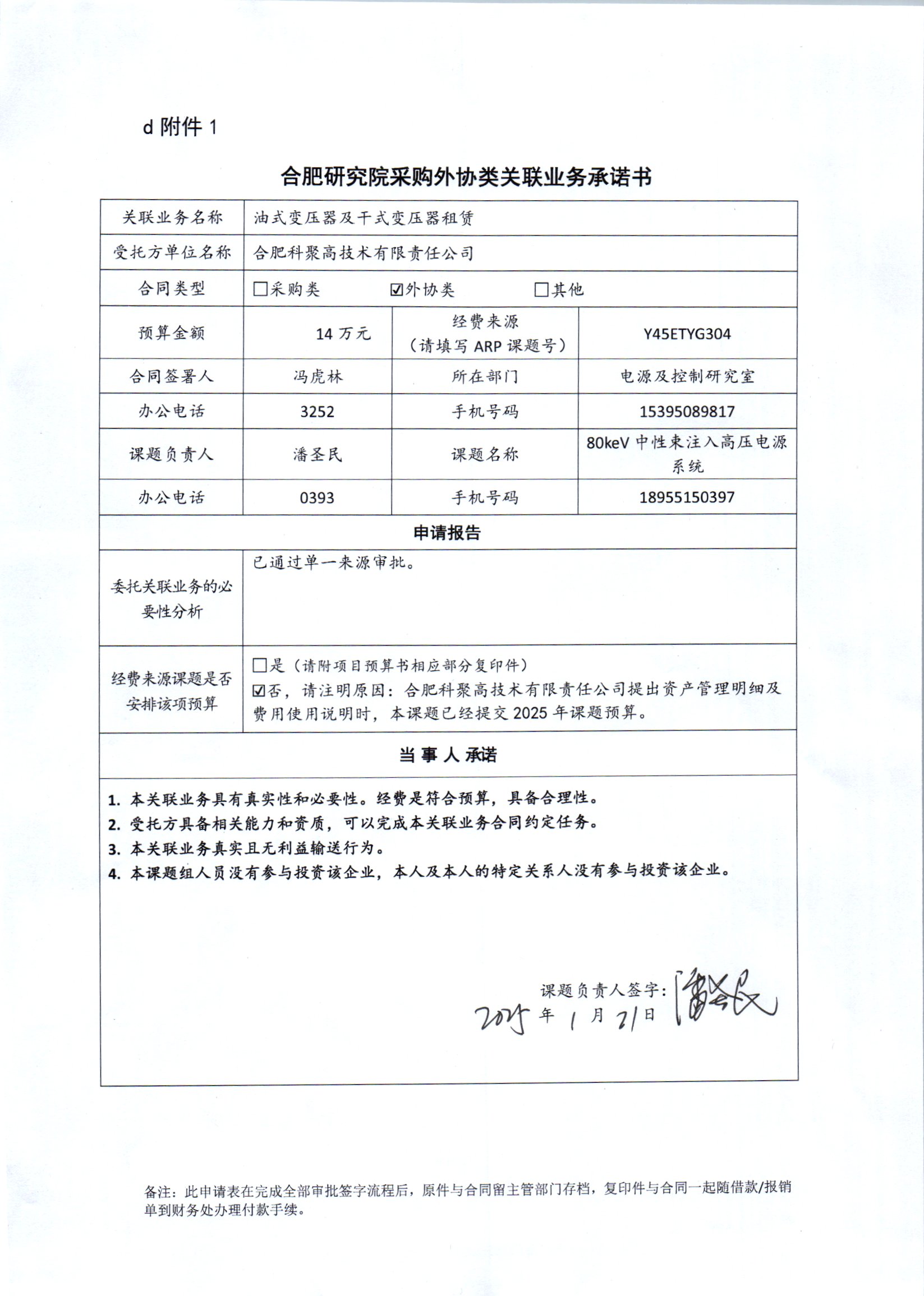 中国科学院合肥物质科学研究院等离子体物理研究所潘圣民老师租赁合肥科聚高技术有限责任公司油式变压器及干式变压器。该设备用于EAST-NBI离子源测试合肥科聚高技术有限责任公司自然人股东包括合肥科学岛控股有限公司,持股比例100%,本次采购构成关联业务交易。