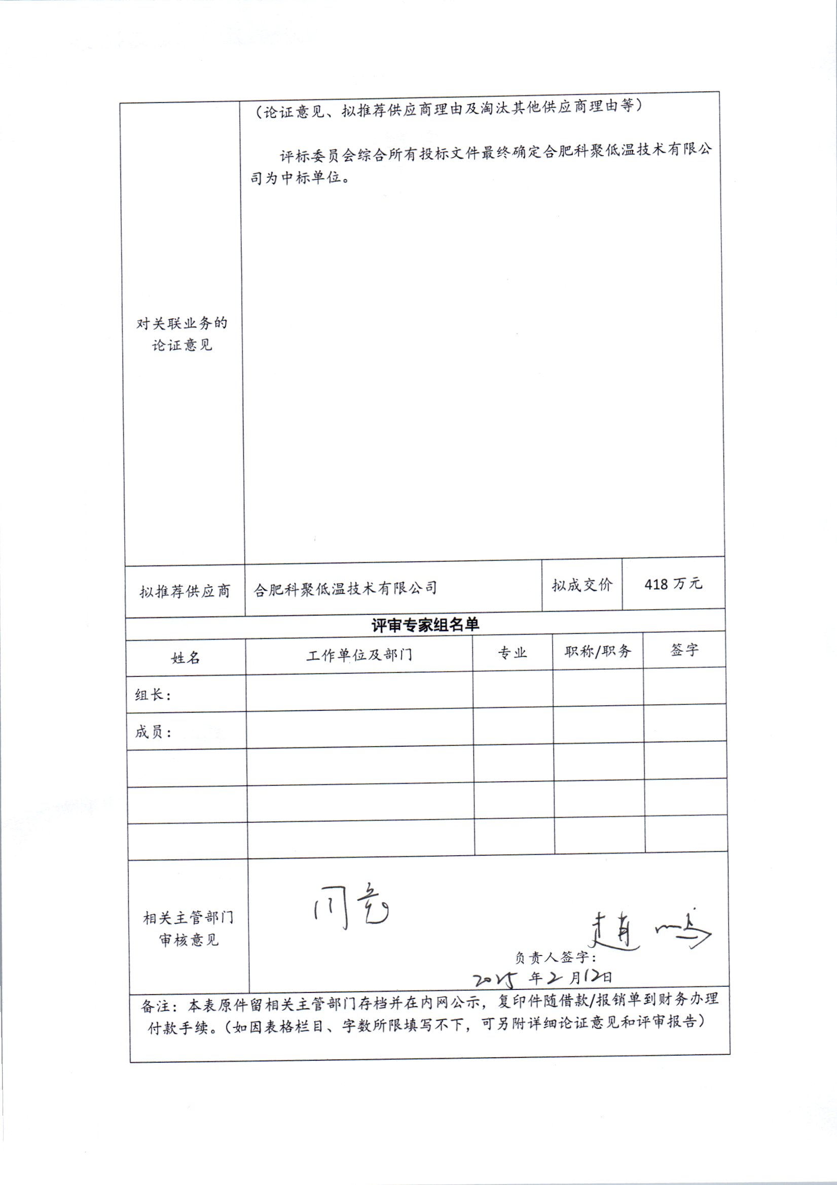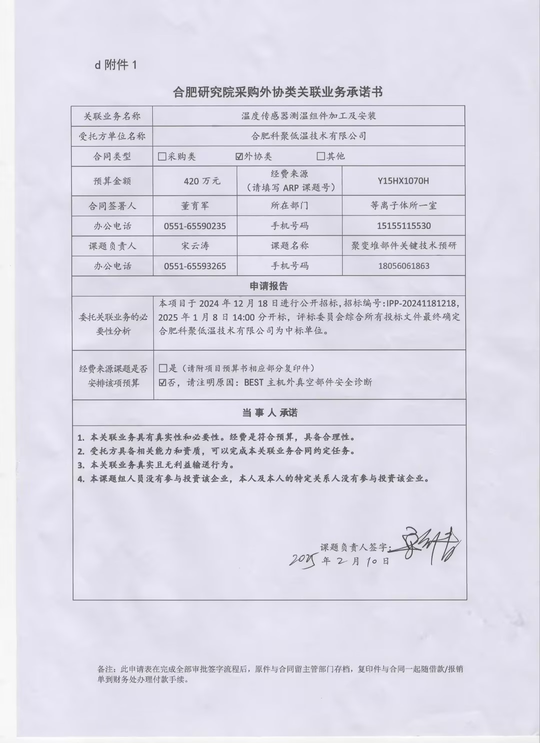 根据《中国科学院关于加强科研项目关联业务管理的暂行规定》(科发条财字〔2015〕125号)、《中国科学院合肥物质科学研究院关于加强科研项目关联业务管理的实施细则》(科合院发资字〔2021〕8号)、《合肥研究院加强关联业务管理暂行办法》(科合院发资字〔2022〕1号)要求,现就我院委托合肥科聚低温技术有限责任公司进行温度传感器测温组件加工及安装项目进行关联业务公示。