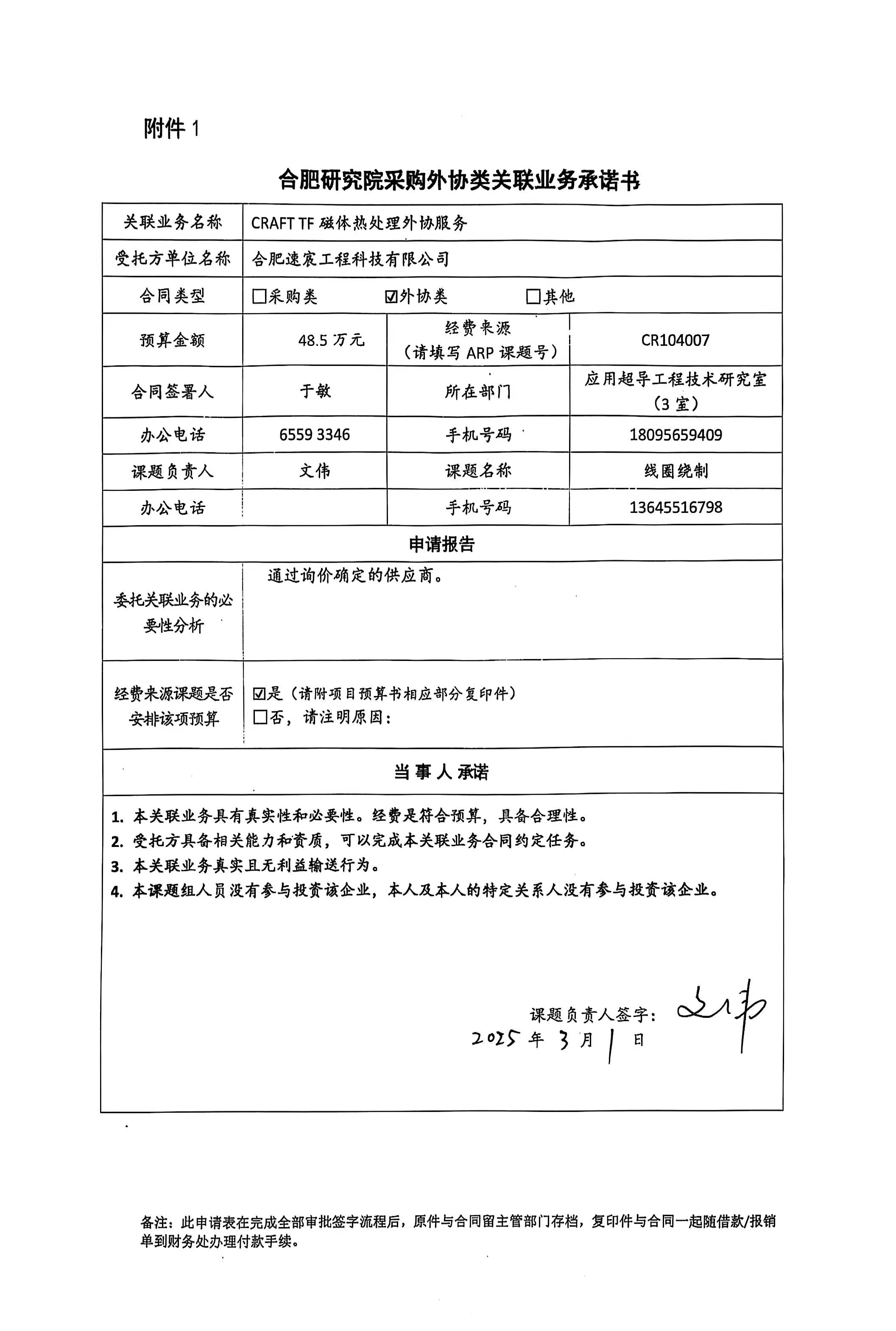 根据《中国科学院关于加强科研项目关联业务管理的暂行规定》(科发条财字〔2015〕125号)、《中国科学院合肥物质科学研究院关于加强科研项目关联业务管理的实施细则》(科合、院发资字〔2021〕8号)、《合肥研究院加强关联业务管理暂行办法》(科合院发资字〔2022〕1号)要求,现就我院委托合肥速宸工程科技有限公司进行CRAFT TF磁体热处理外协服务进行关联业务公示。
