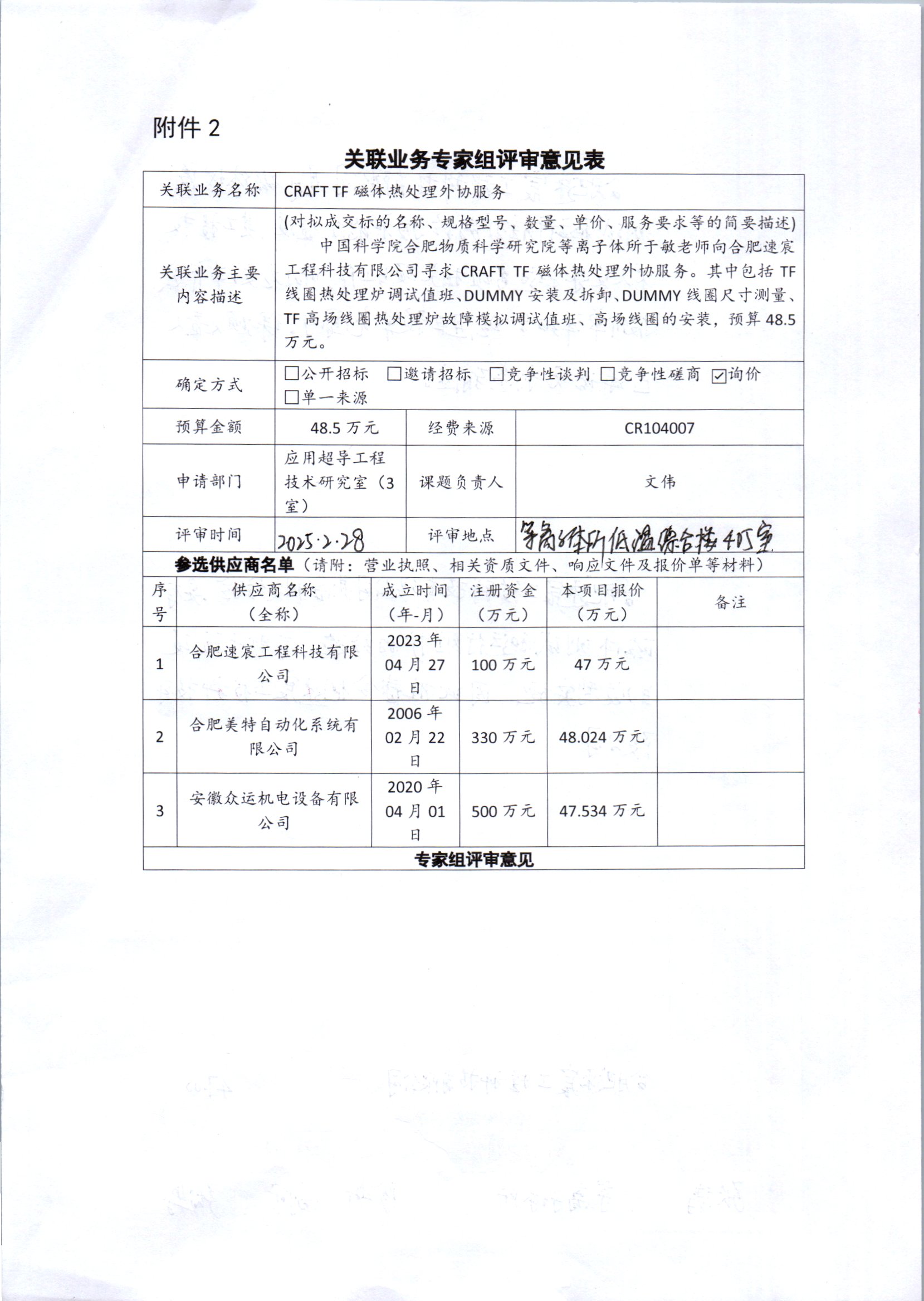 中国科学院合肥物质科学研究院等离子体物理研究所文伟老师委托合肥速宸工程科技有限公司进行CRAFT TF磁体热处理外协服务。其中包括TF线圈热处理炉调试值班、DUNNY安装及拆卸、DUMMY线圈尺寸测量、TF高场线圈热处理炉故障模拟调试值班及高场线圈及高场线圈的安装。运行值班员负责设备的运行操作、检查维护、调整试验、测量记录等工作;当设备运行发生异常事故时,应迅速进行处理并汇报;值班员应认真做好巡检设备和各种运行记录等。合肥国际应用超导中心持有合肥速宸工程科技有限公司30%的股份,同时合肥国际应用超导中心由合肥科学岛控股有限公司与合肥经济技术开发区管理委员会共同发起组建,故本次构成关联业务交易。