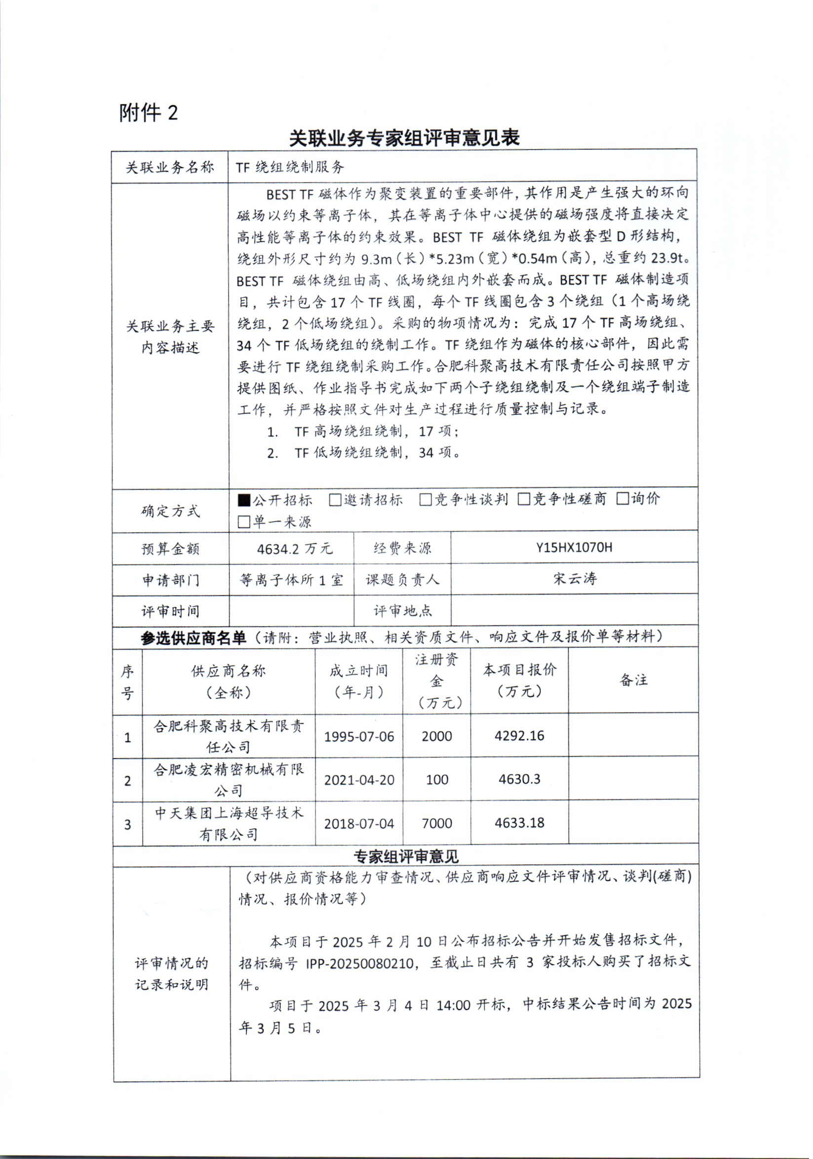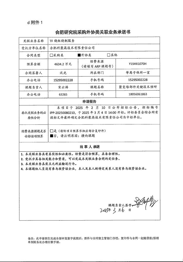 根据《中国科学院关于加强科研项目关联业务管理的暂行规定》(科发条财字〔2015〕125号)、《中国科学院合肥物质科学研究院关于加强科研项目关联业务管理的实施细则》(科合院发资字〔2021〕8号)、《合肥研究院加强关联业务管理暂行办法》(科合院发资字〔2022〕1号)要求,现就我院委托合肥科聚高技术有限责任公司进行TF绕组绕制服务项目进行关联业务公示。