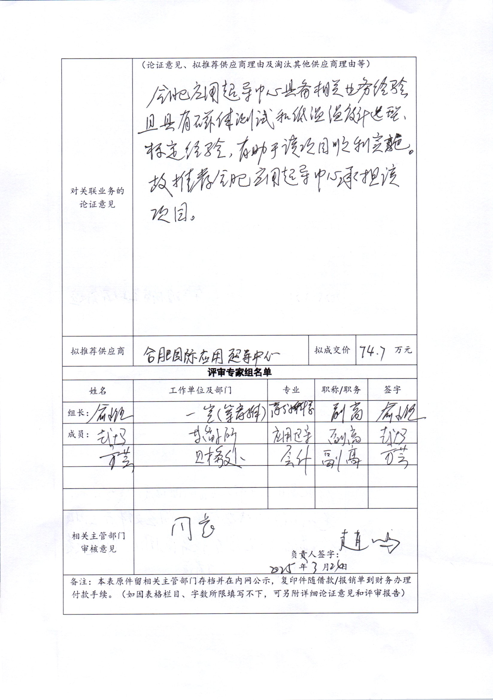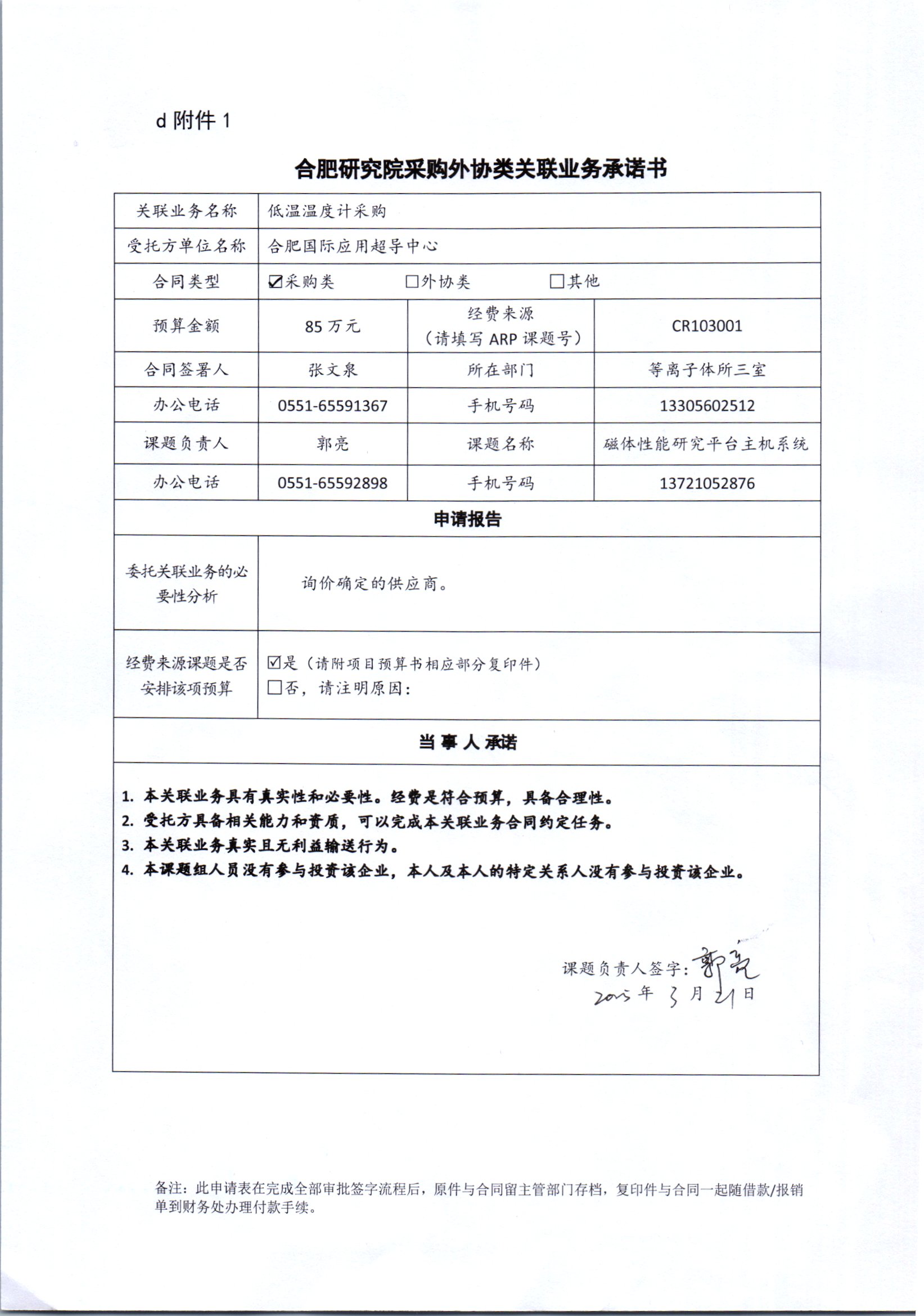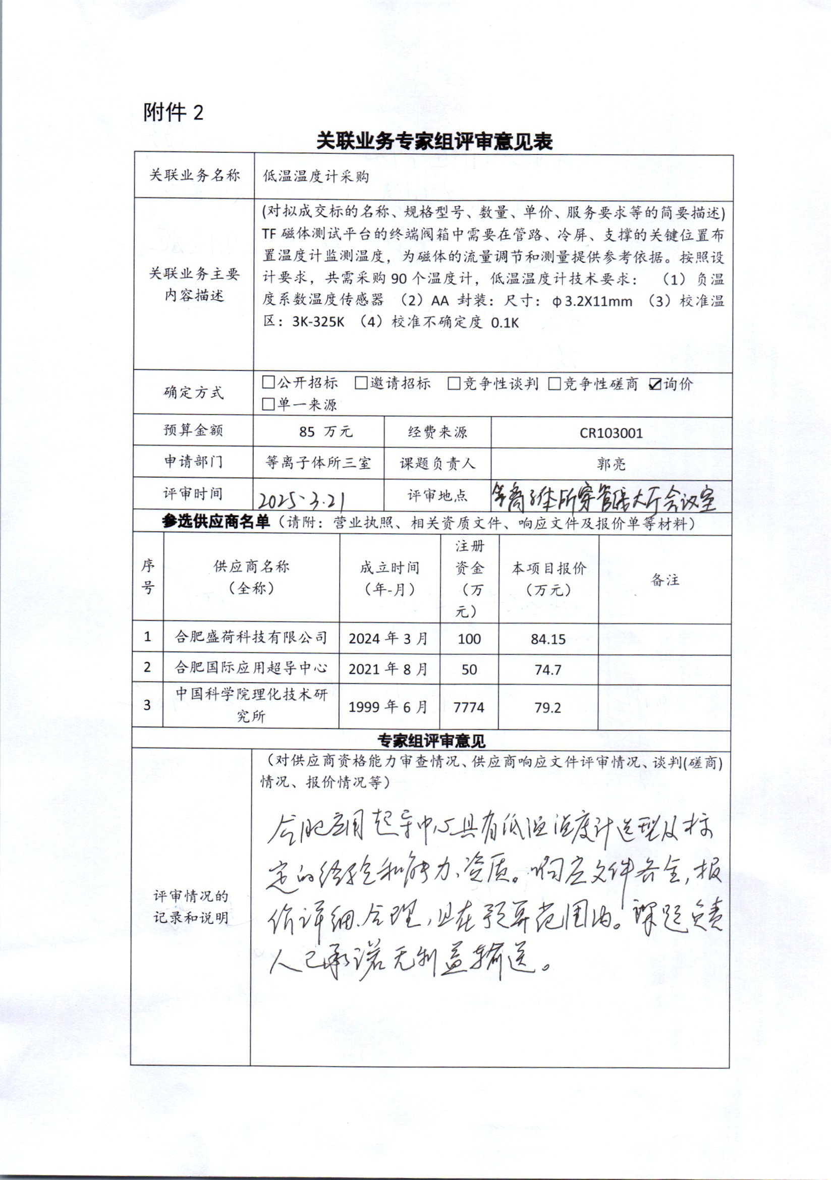根据《中国科学院关于加强科研项目关联业务管理的暂行规定》(科发条财字〔2015〕125号)、《中国科学院合肥物质科学研究院关于加强科研项目关联业务管理的实施细则》(科合院发资字〔2021〕8号)、《合肥研究院加强关联业务管理暂行办法》(科合院发资字〔2022〕1号)要求,现就我院向合肥国际应用超导中心采购低温温度计进行关联业务公示。