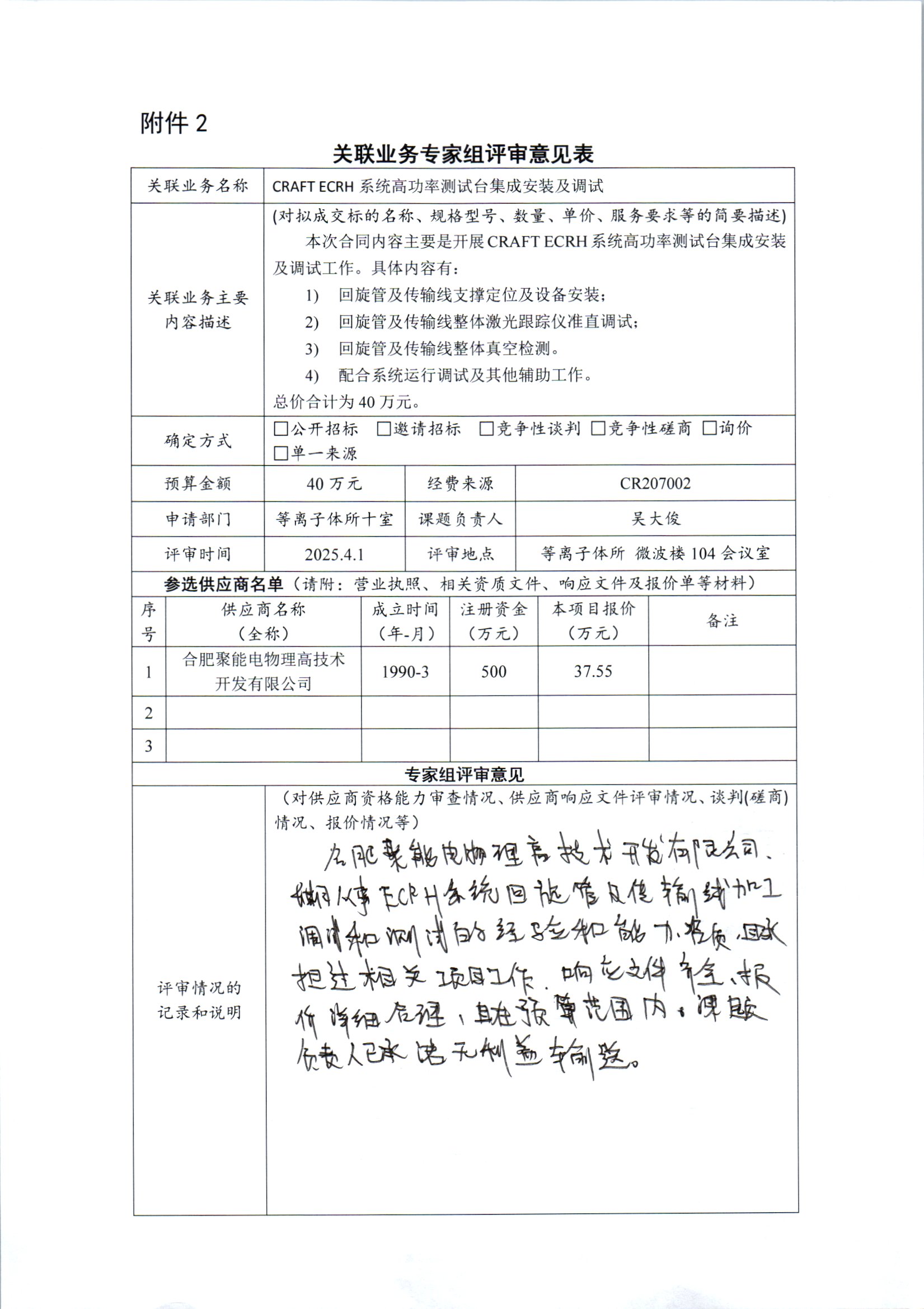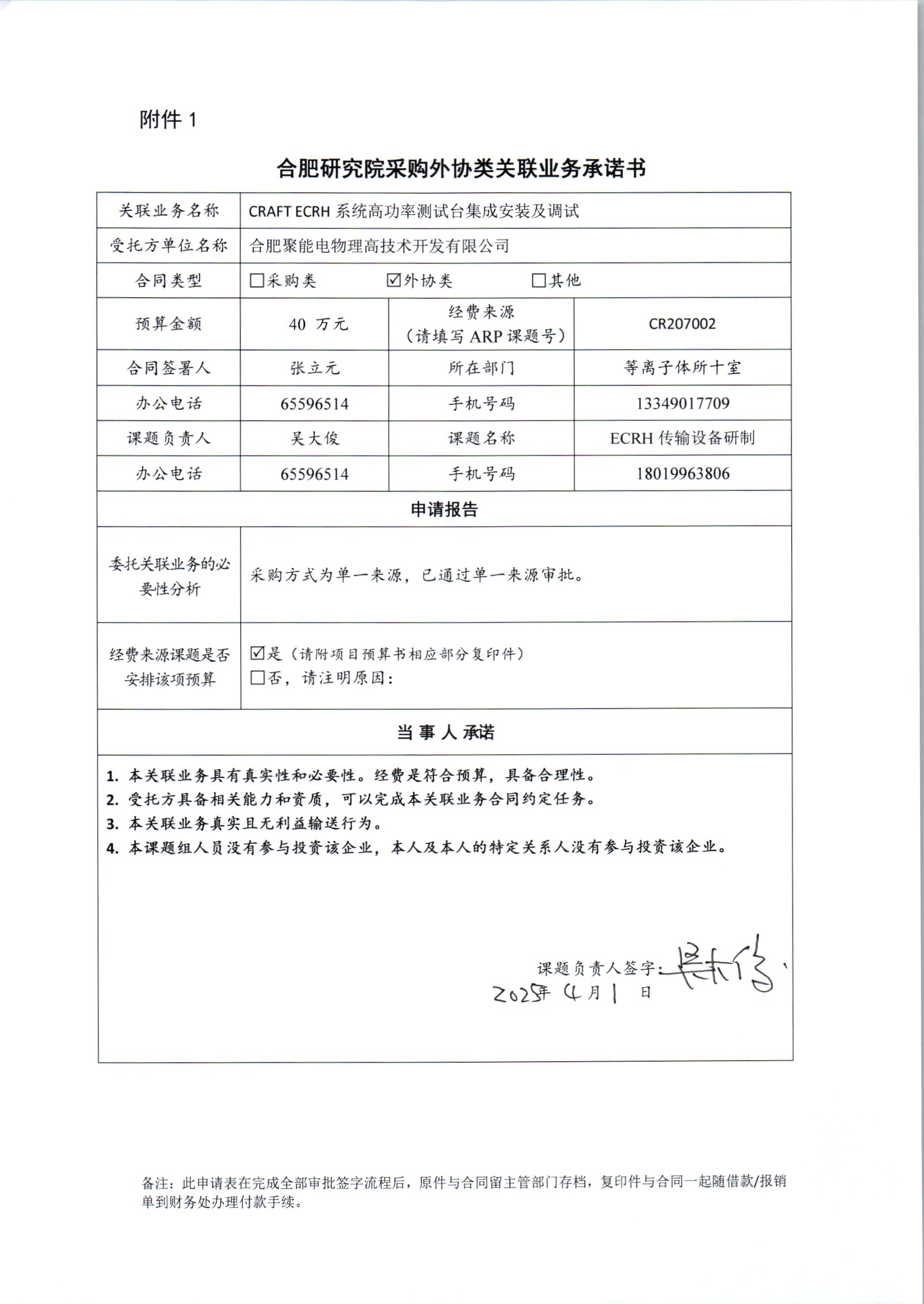 根据《中国科学院关于加强科研项目关联业务管理的暂行规定》(科发条财字〔2015〕125号)、《中国科学院合肥物质科学研究院关于加强科研项目关联业务管理的实施细则》(科合院发资字〔2021〕8号)、《合肥研究院加强关联业务管理暂行办法》(科合院发资字〔2022〕1号)要求,现就我院委托合肥聚能电物理高技术开发有限公司进行CRAFT ECRH系统高功率测试台集成安装及调试的关联业务公示。