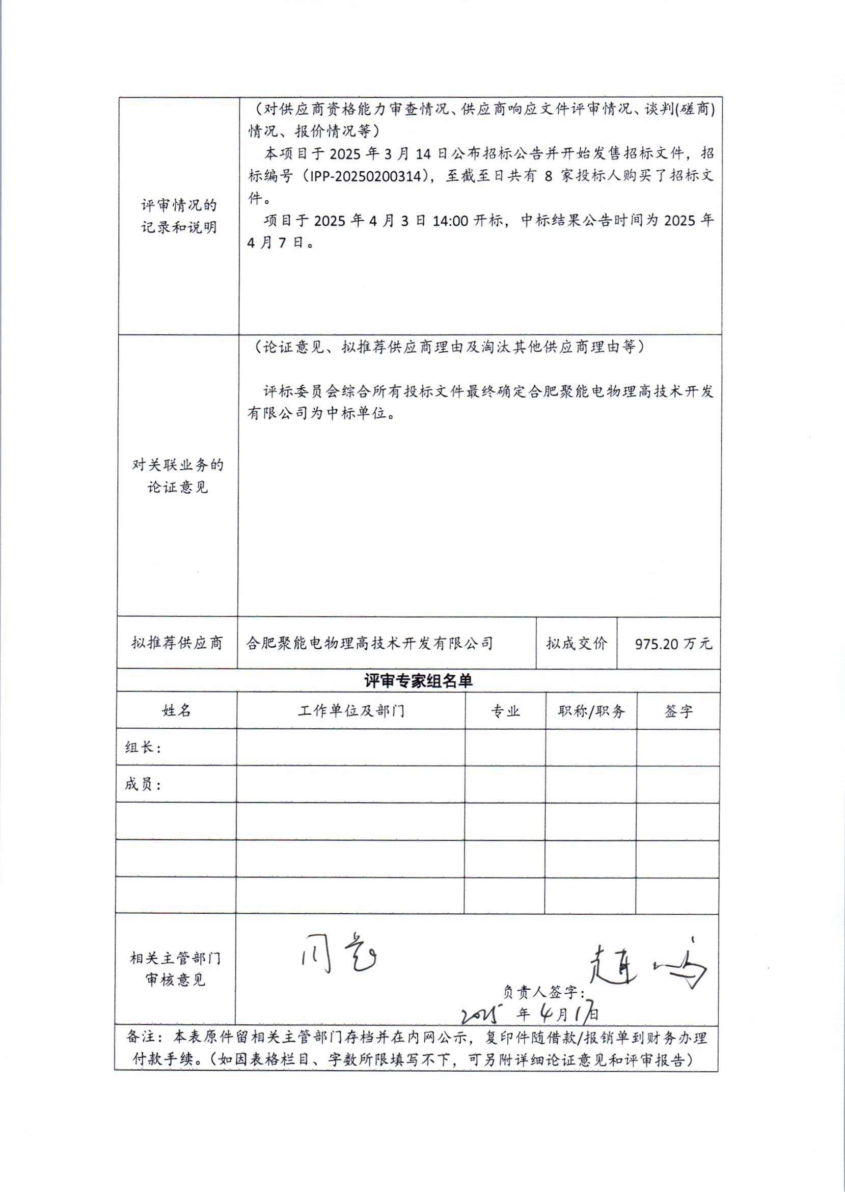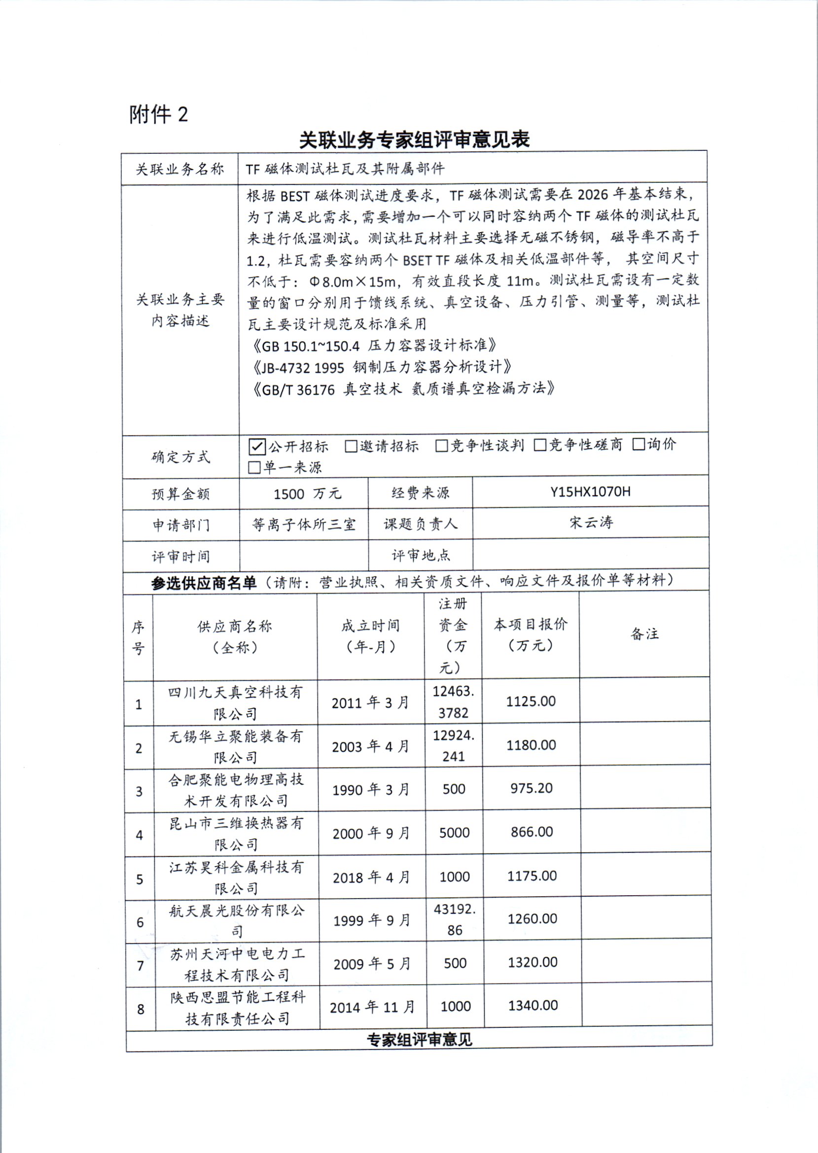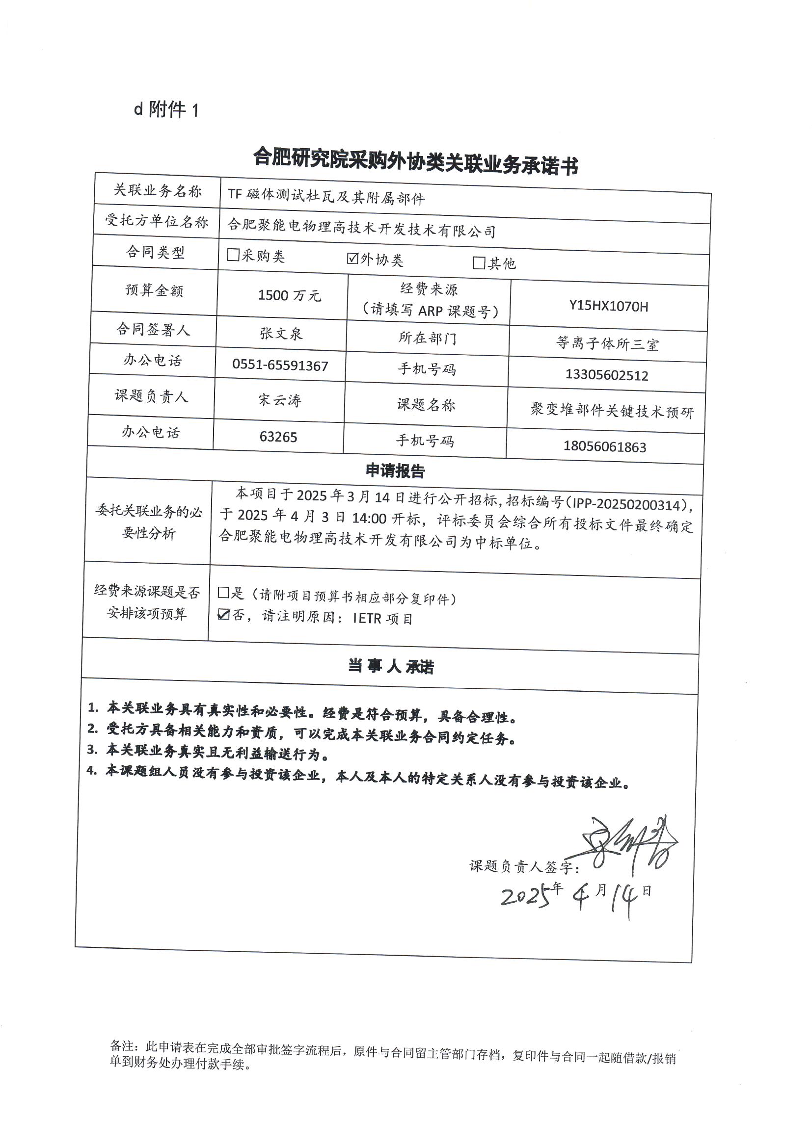 根据《中国科学院关于加强科研项目关联业务管理的暂行规定》(科发条财字〔2015〕125号)、《中国科学院合肥物质科学研究院关于加强科研项目关联业务管理的实施细则》(科合院发资字〔2021〕8号)、《合肥研究院加强关联业务管理暂行办法》(科合院发资字〔2022〕1号)要求,现就我院委托合肥聚能电物理高技术开发有限公司进行TF磁体测试杜瓦及其附属部件研制的关联业务做公示。
