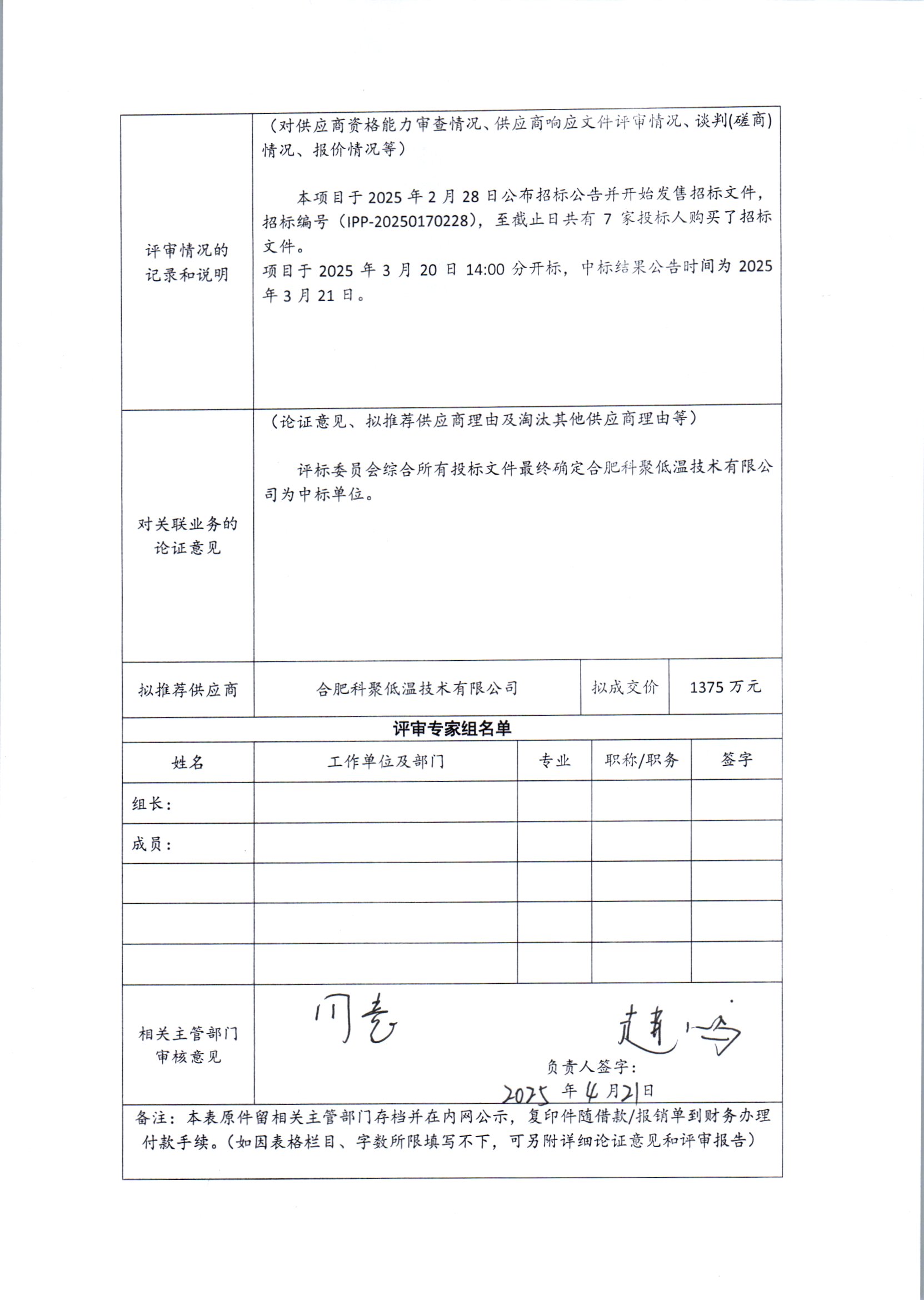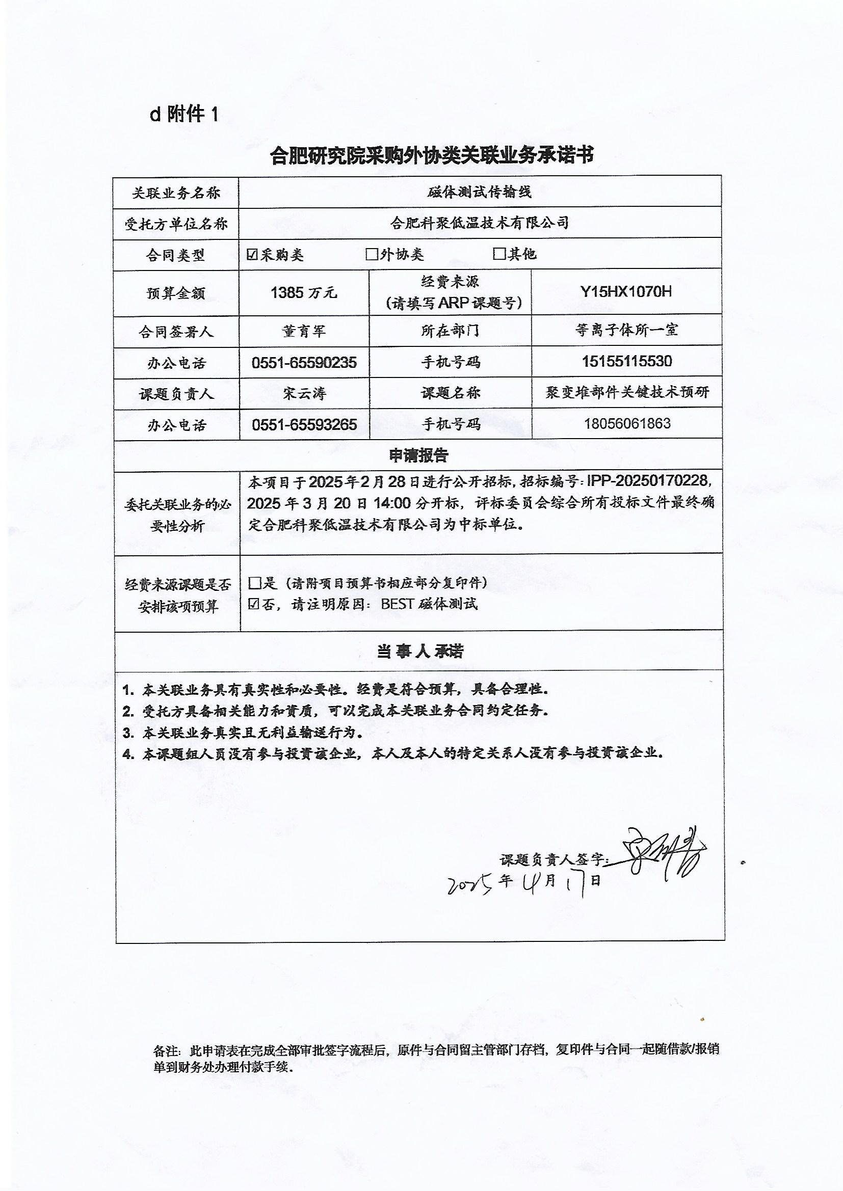 根据《中国科学院关于加强科研项目关联业务管理的暂行规定》(科发条财字〔2015〕125号)、《中国科学院合肥物质科学研究院关于加强科研项目关联业务管理的实施细则》(科合院发资字〔2021〕8号)、《合肥研究院加强关联业务管理暂行办法》(科合院发资字〔2022〕1号)要求,现就我院委托合肥科聚低温技术有限责任公司进行磁体测试传输线加工制造项目进行关联业务公示。