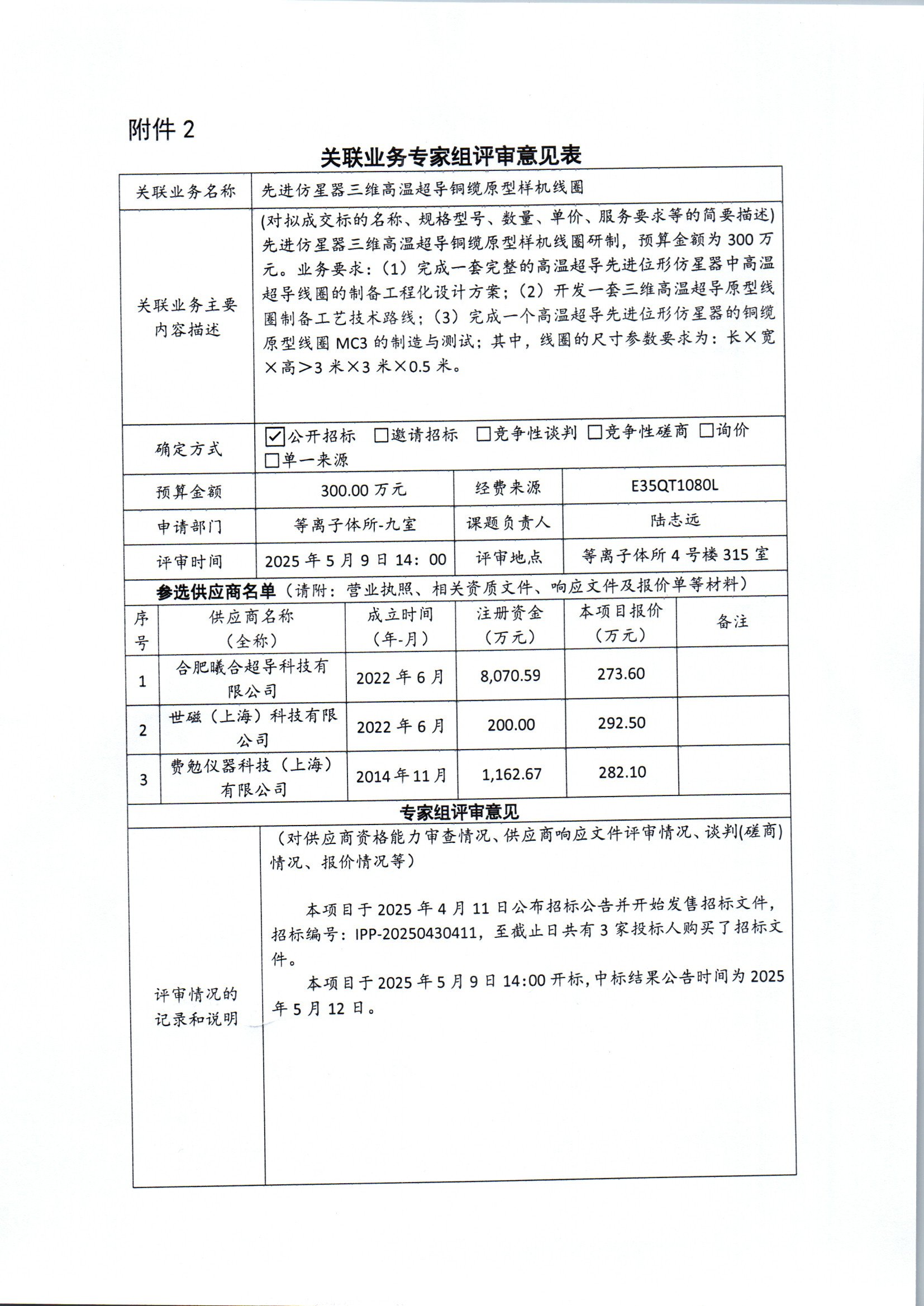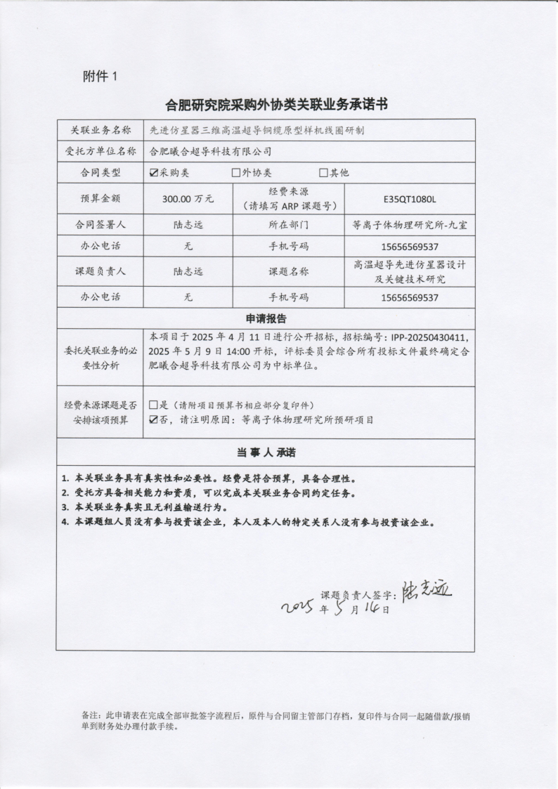 根据《中国科学院关于加强科研项目关联业务管理的暂行规定》(科发条财字〔2015〕125号)、《中国科学院合肥物质科学研究院关于加强科研项目关联业务管理的实施细则》(科合院发资字〔2021〕8号)、《合肥研究院加强关联业务管理暂行办法》(科合院发资字〔2022〕1号)、《合肥物质院加强关联业务管理补充规定》(科合院发资字〔2025〕1号)要求,现就我院委托合肥曦合超导科技有限公司研制先进仿星器三维高温超导铜缆原型样机线圈的关联业务进行公示。