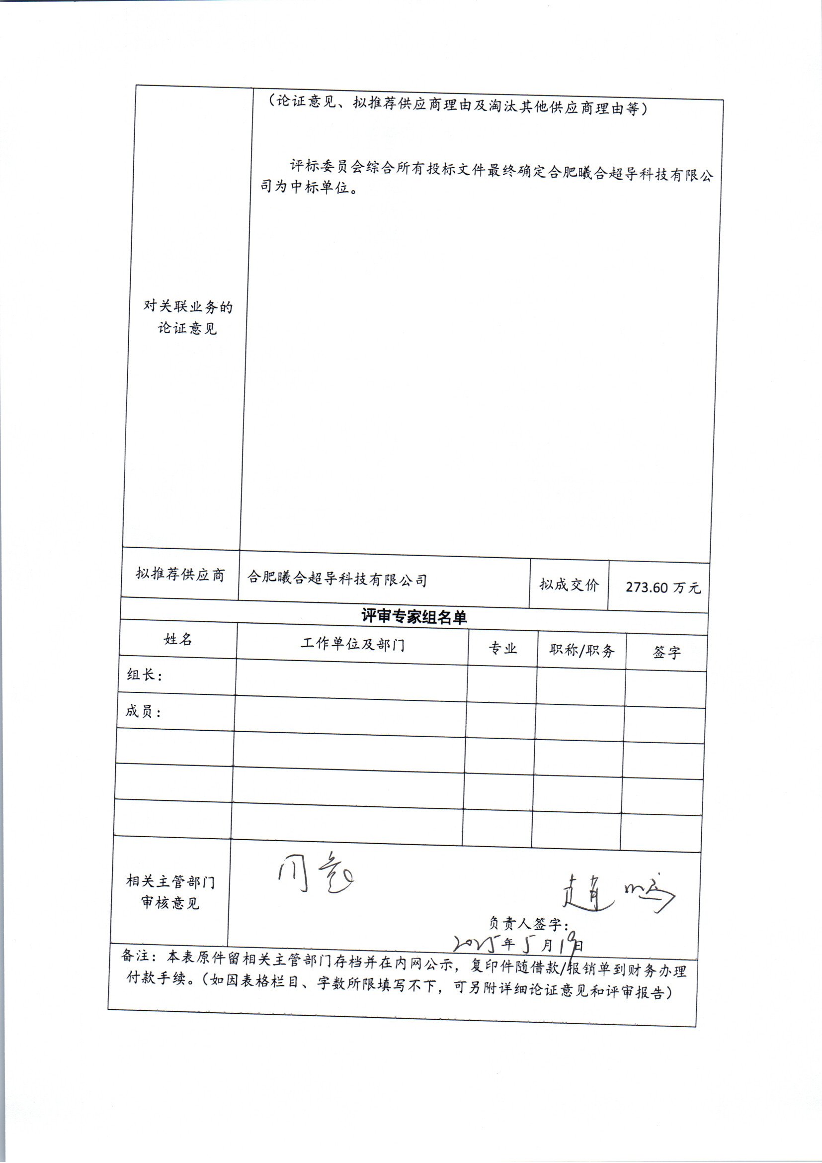 中国科学院合肥物质科学研究院等离子体物理研究所陆志远老师委托合肥曦合超导科技有限公司研制先进仿星器三维高温超导铜缆原型样机线圈。先进仿星器具有独特的三维线圈结构,与常规磁体从线圈骨架以及一系列工装的设计加工到线圈的绕制捆扎固化工艺都有很大不同,采购物项拟围绕此目标,参考CRAFT及BEST大型线圈的绕制方案开展三维高温超导铜缆原型线圈工程研究,具体包括工程化方案设计,制备工艺技术路线开发,以及一个三维高温超导铜缆原型线圈的制造与测试。合肥曦合超导科技有限公司自然人股东包含本单位职工周超老师,持股比例为35%,本次构成关联业务交易。