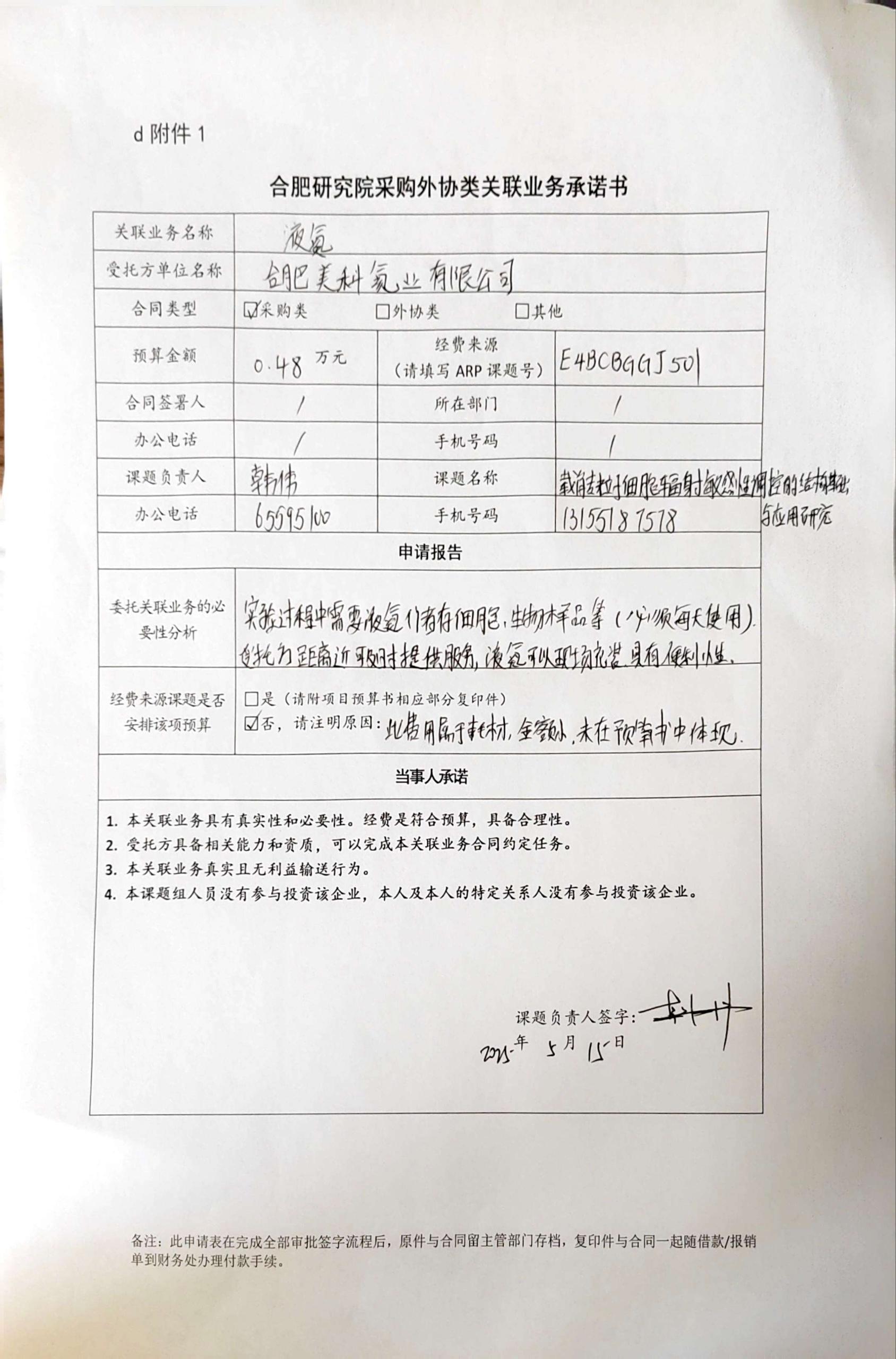 根据《中国科学院关于加强科研项目关联业务管理的暂行规定》(科发条财字〔2015〕125号)、《中国科学院合肥物质科学研究院关于加强科研项目关联业务管理的实施细则》(科合院发资字〔2021〕8号)、《合肥研究院加强关联业务管理暂行办法》(科合院发资字〔2022〕 1号)、《合肥物质院加强关联业务管理补充规定》(科合院发资字〔2025〕1号)要求,现就我院向合肥美科氦业有限公司采购液氮的关联业务做公示。