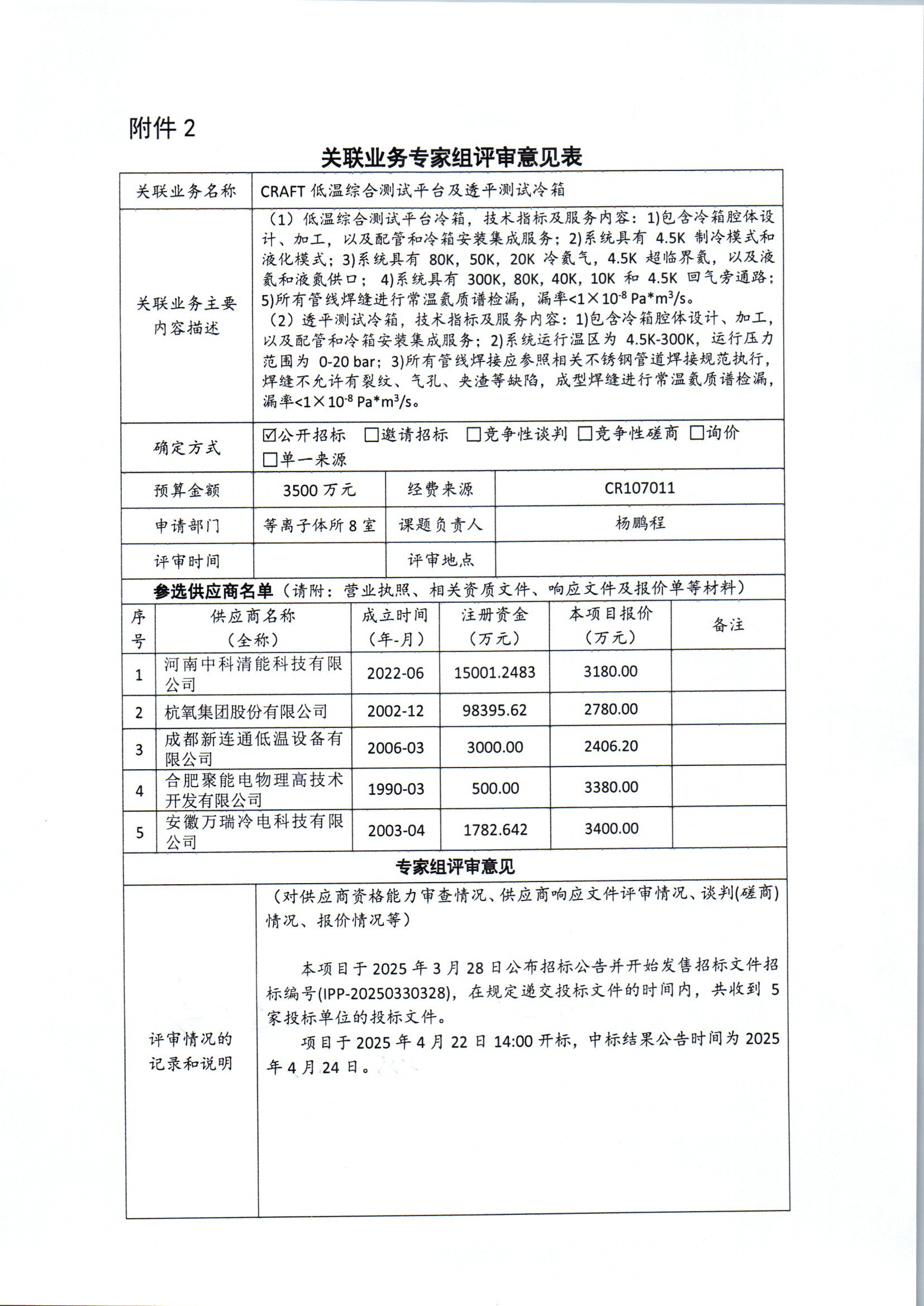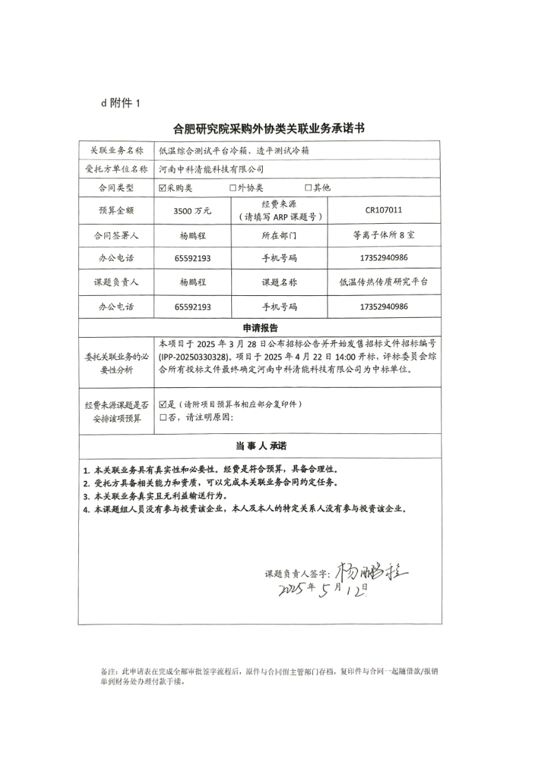 根据《中国科学院关于加强科研项目关联业务管理的暂行规定》(科发条财字〔2015〕125号)、《中国科学院合肥物质科学研究院关于加强科研项目关联业务管理的实施细则》(科合院发资字〔2021〕8号)、《合肥研究院加强关联业务管理暂行办法》(科合院发资字〔2022〕1号)、《合肥物质院加强关联业务管理补充规定》(科合院发资字〔2025〕1号)要求,现就我院委托河南中科清能科技有限公司研制低温综合测试平台及透平测试冷箱项目进行关联业务公示。