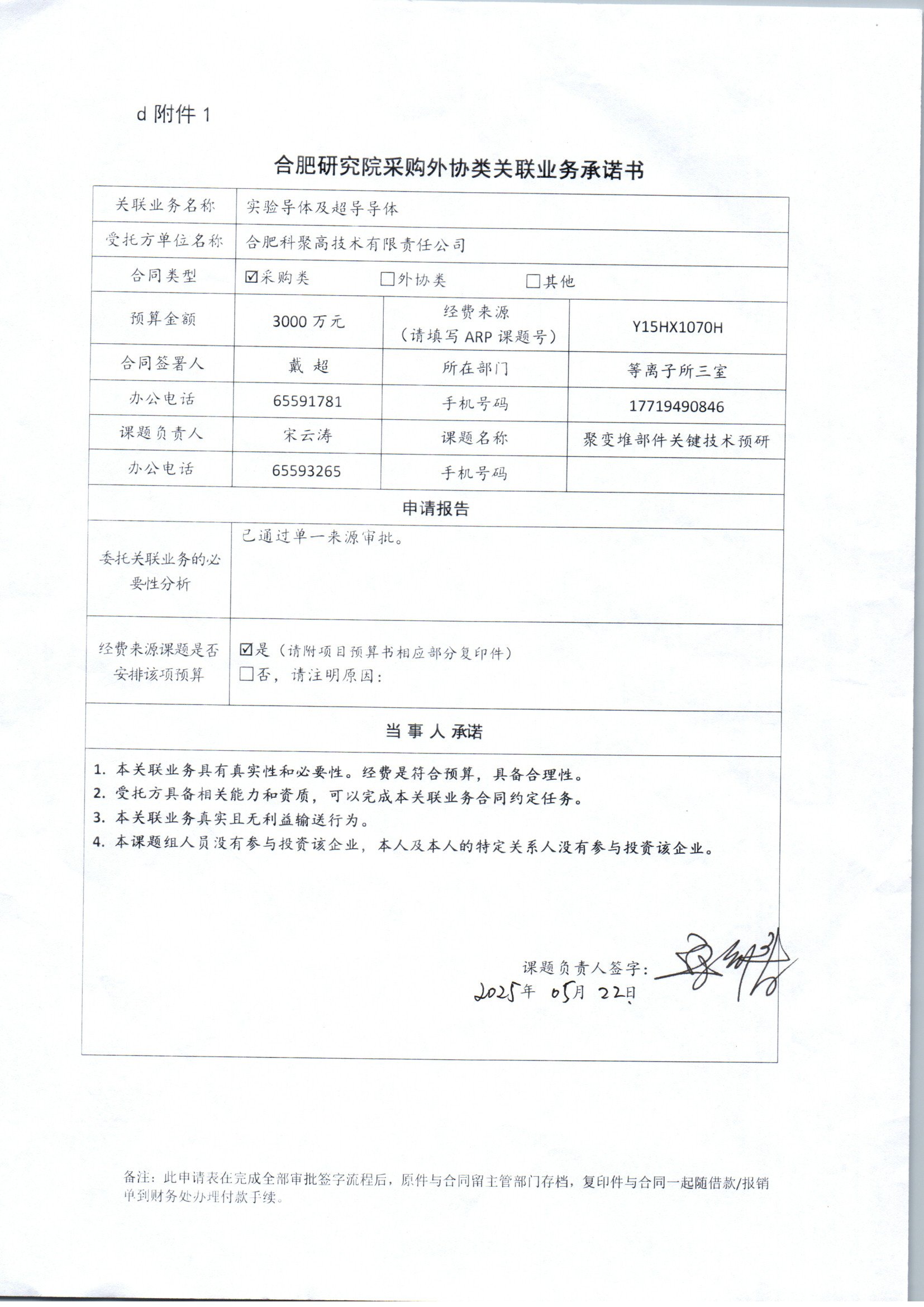 根据《中国科学院关于加强科研项目关联业务管理的暂行规定》(科发条财字〔2015〕125号)、《中国科学院合肥物质科学研究院关于加强科研项目关联业务管理的实施细则》(科合院发资字〔2021〕8号)、《合肥研究院加强关联业务管理暂行办法》(科合院发资字〔2022〕1号)要求,现就我院委托合肥科聚高技术有限责任公司制造实验导体及超导导体项目进行关联业务公示。
