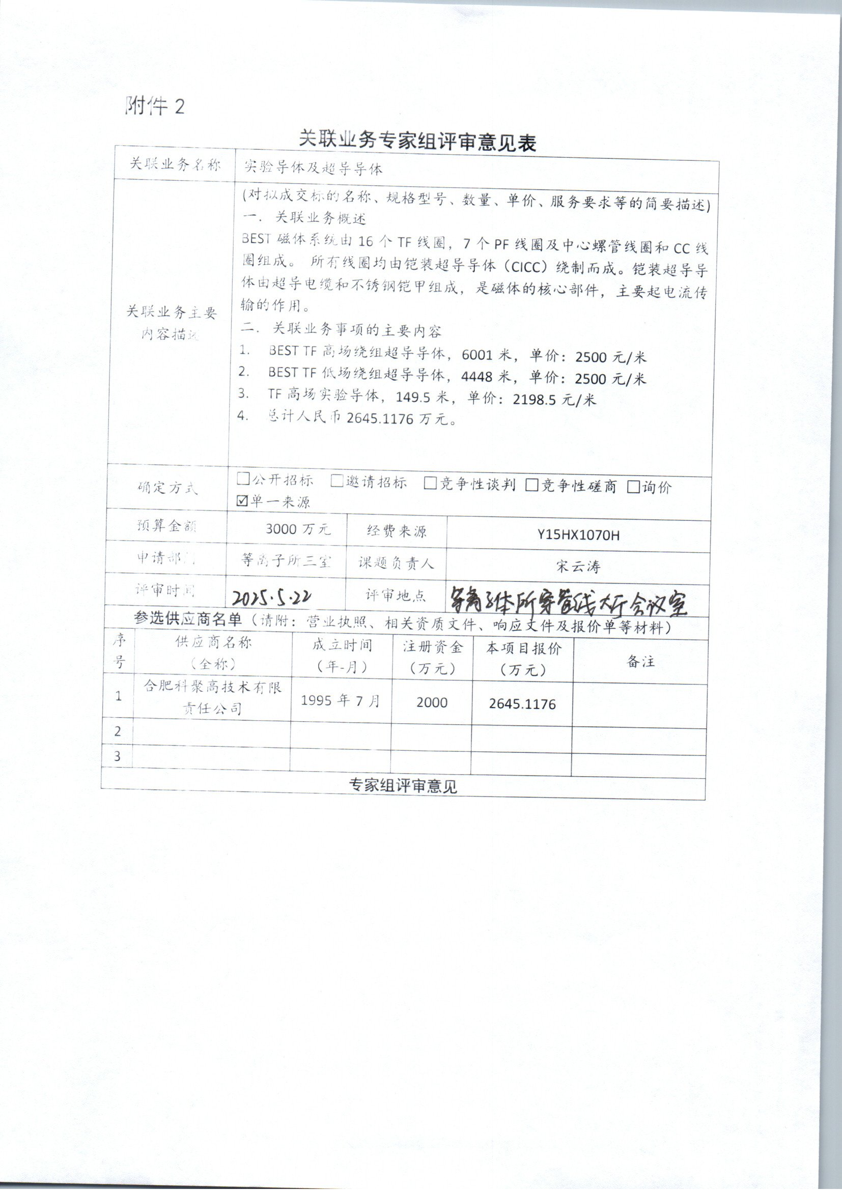 中国科学院合肥物质科学研究院等离子体物理研究所宋云涛老师委托合肥科聚高技术有限责任公司制造实验导体及超导导体。BEST磁体系统由16个TF线圈,7个PF线圈及中心螺管线圈和CC线圈组成。 所有线圈均由铠装超导导体(CICC)绕制而成。铠装超导导体由超导电缆和不锈钢铠甲组成,是磁体的核心部件,主要起电流传输的作用。合肥科聚高技术有限责任公司自然人股东包括合肥科学岛控股有限公司,持股比例100%,本次采购构成关联业务交易。