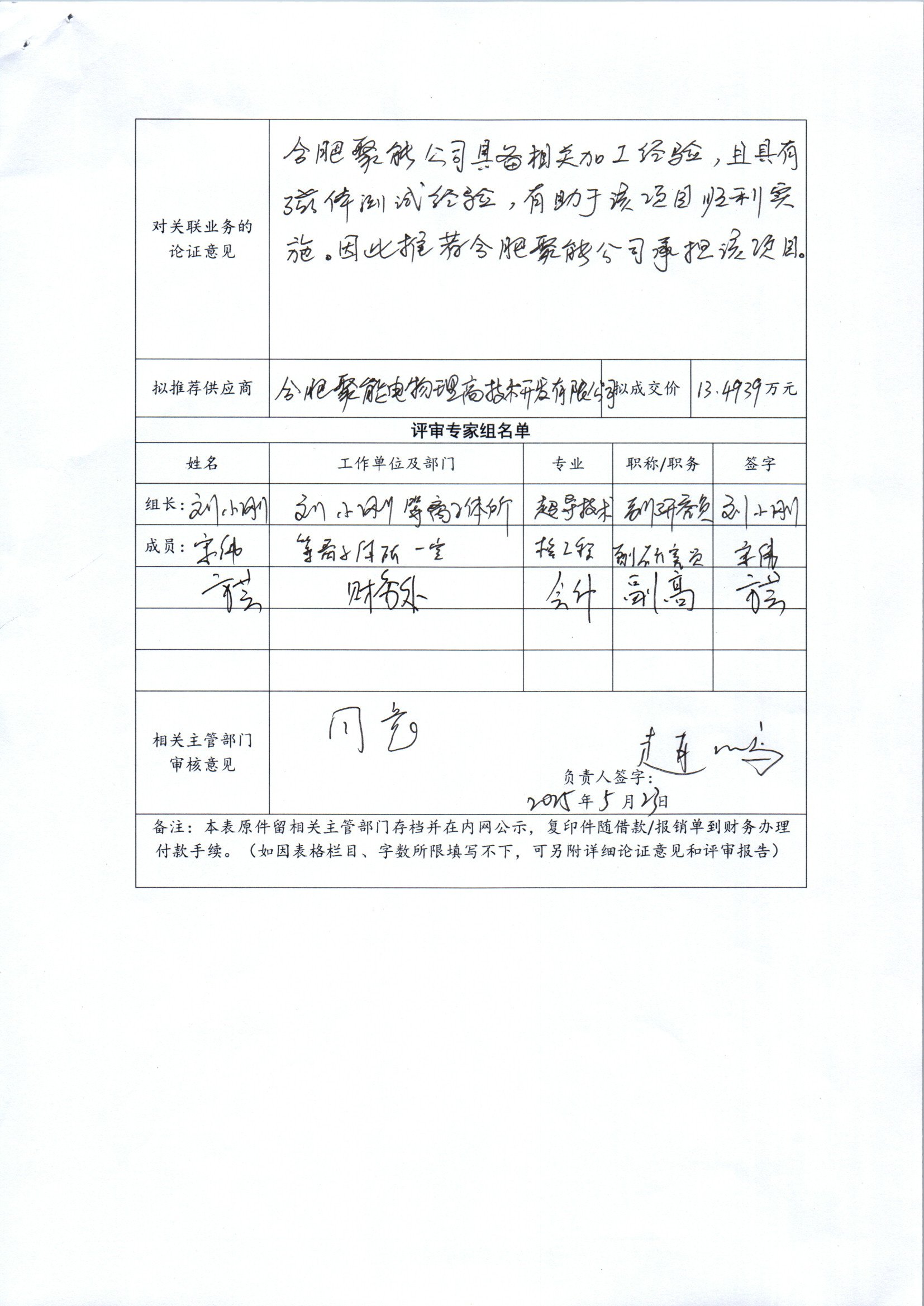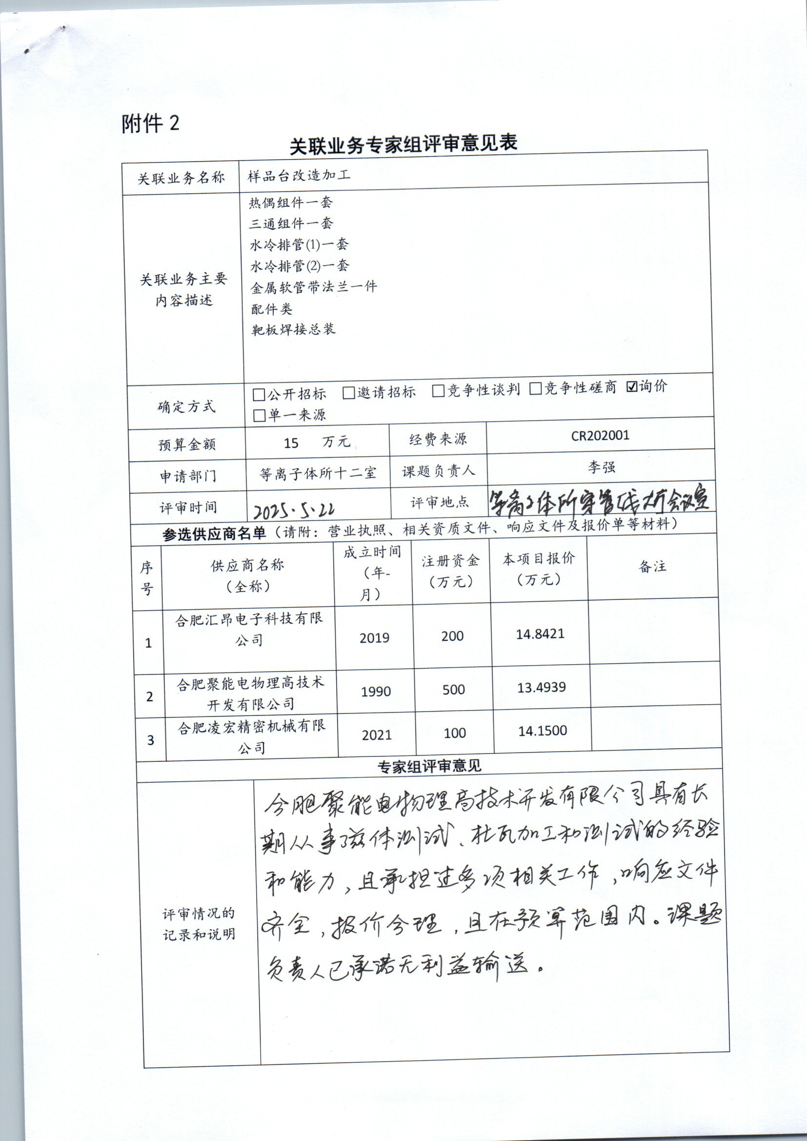 中国科学院合肥物质科学研究院等离子体所李强老师委托合肥聚能电物理高技术开发有限公司进行样品台改造加工。改造内容包括:4套热偶传感器部件及承压3通波纹管进行重新设计加工,增加一组热偶传感部件提高测试效率;对水冷排管设计加工改造,提高测试工件降温的效率;部分承压波纹管设计生产;该业务主要用于提供CRAFT偏滤器测试平台的测试效率,减少测试工作人员的工作内容。合肥聚能电物理高技术开发有限公司股东之一为合肥科学岛控股有限公司,该公司在其中占股35%,本次构成关联业务交易。
