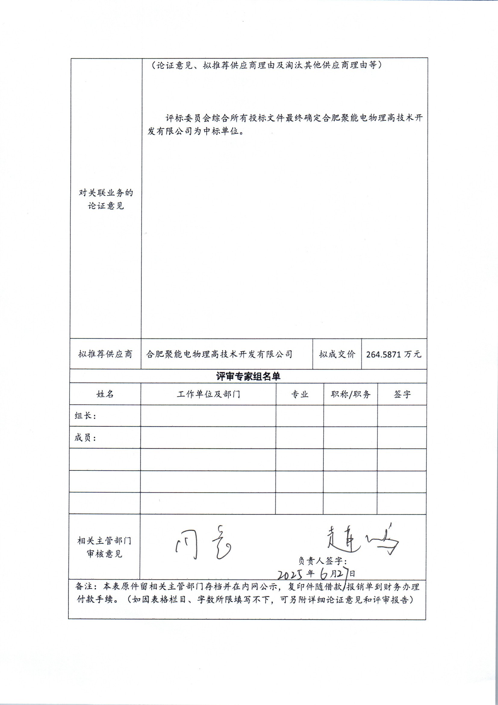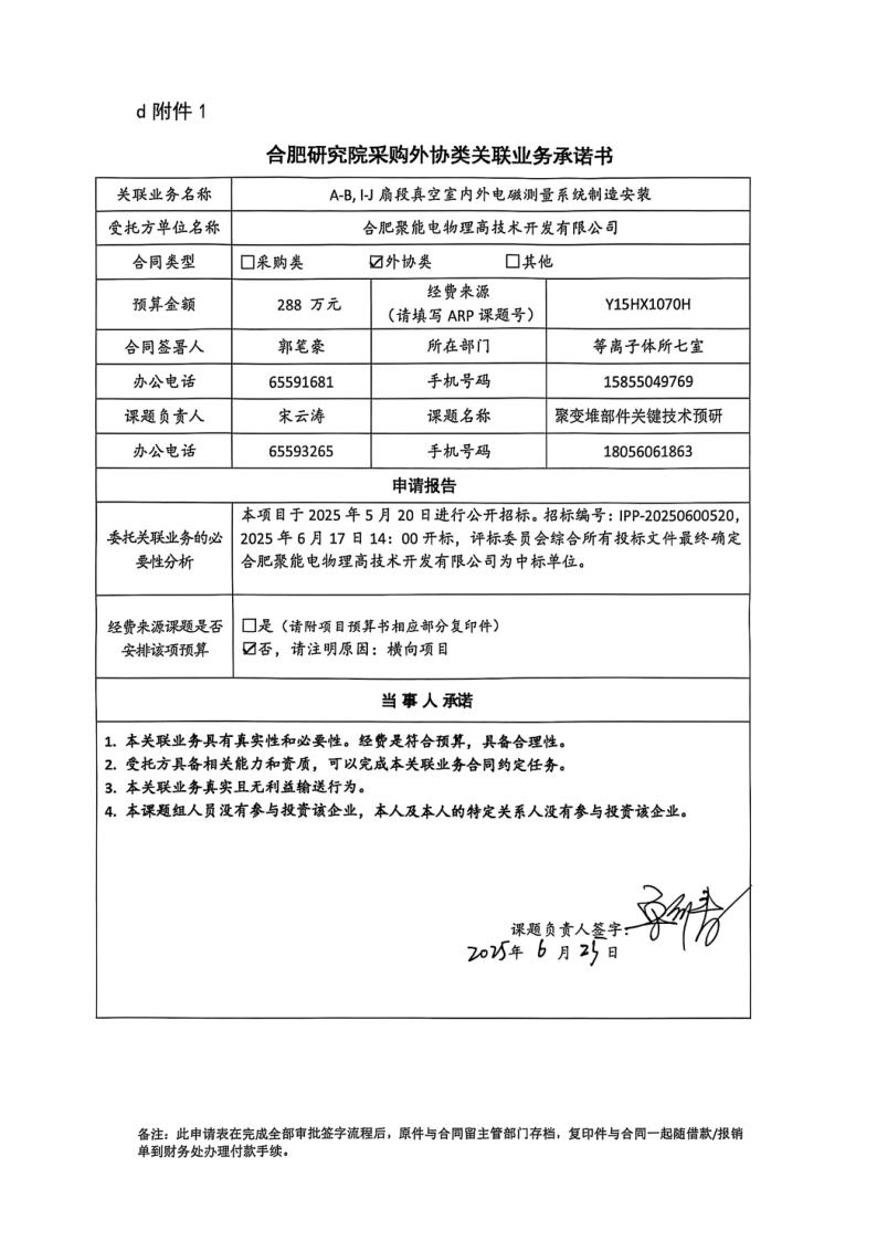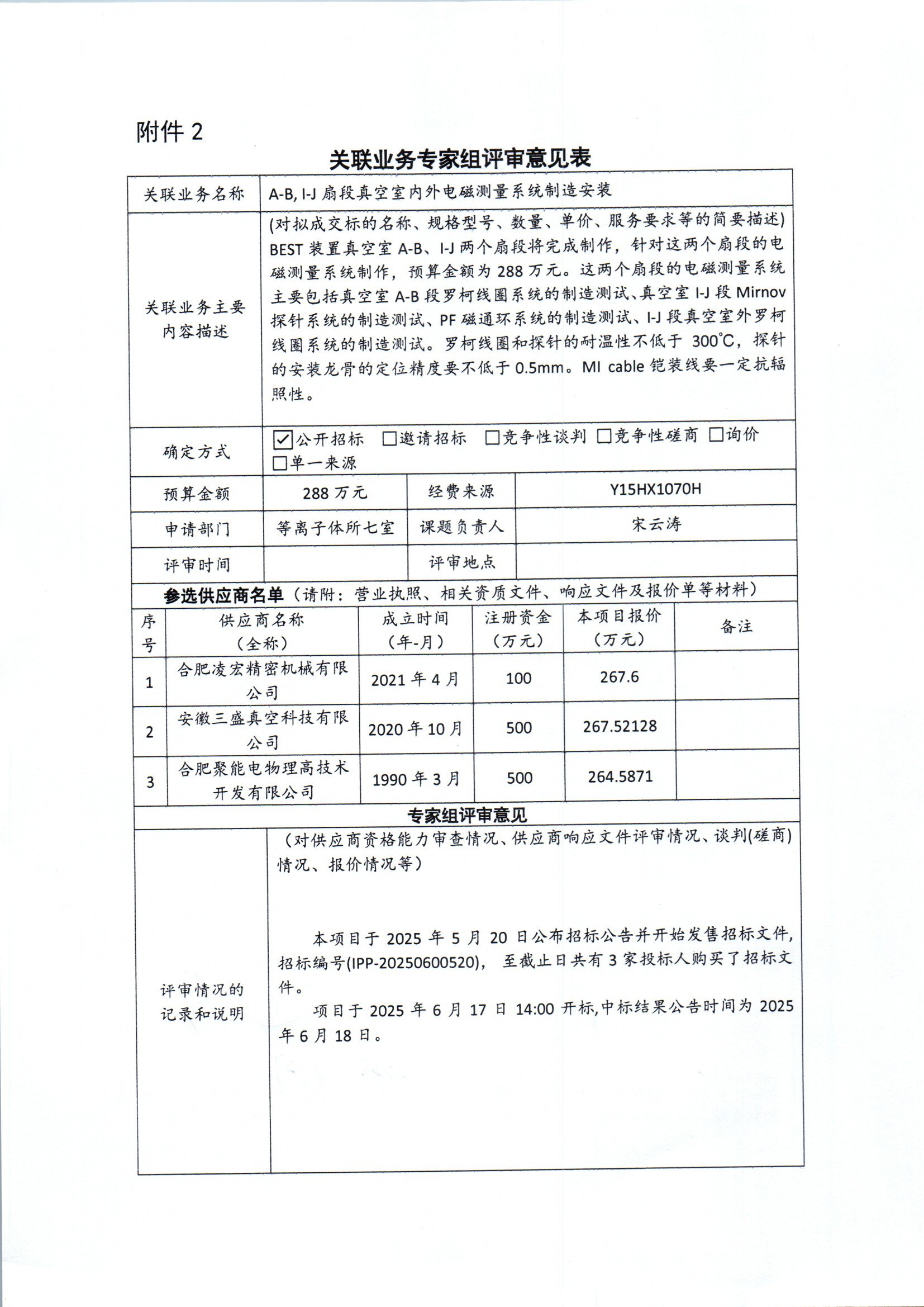 根据《中国科学院关于加强科研项目关联业务管理的暂行规定》(科发条财字〔2015〕125号)、《中国科学院合肥物质科学研究院关于加强科研项目关联业务管理的实施细则》(科合院发资字〔2021〕8号)、《合肥研究院加强关联业务管理暂行办法》(科合院发资字〔2022〕 1号)、《合肥物质院加强关联业务管理补充规定》(科合院发资字〔2025〕1号)要求,现就我院委托合肥聚能电物理高技术开发有限公司进行A-B, I-J扇段真空室内外电磁测量系统制造安装的关联业务做公示。