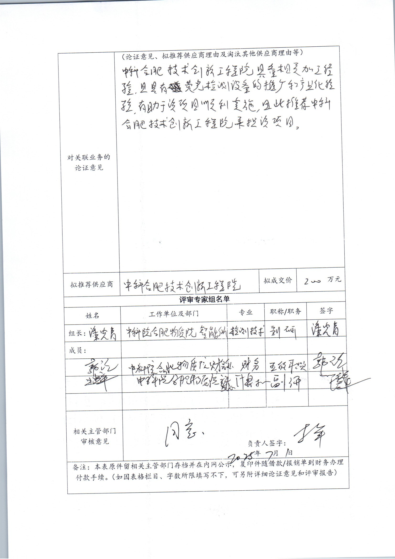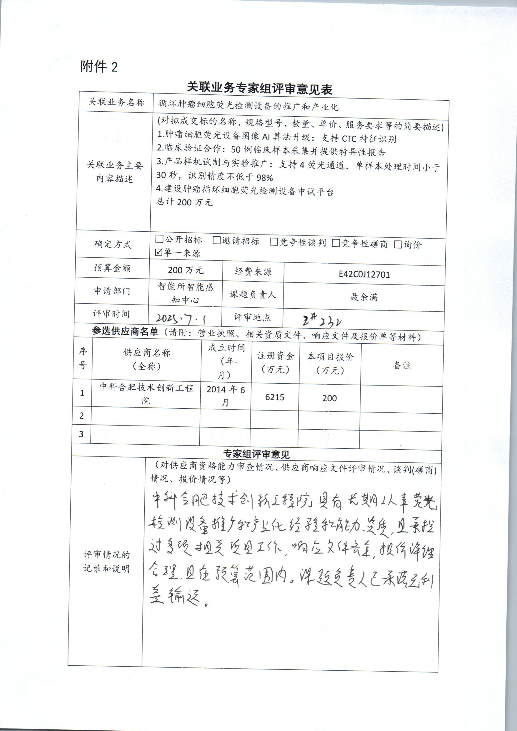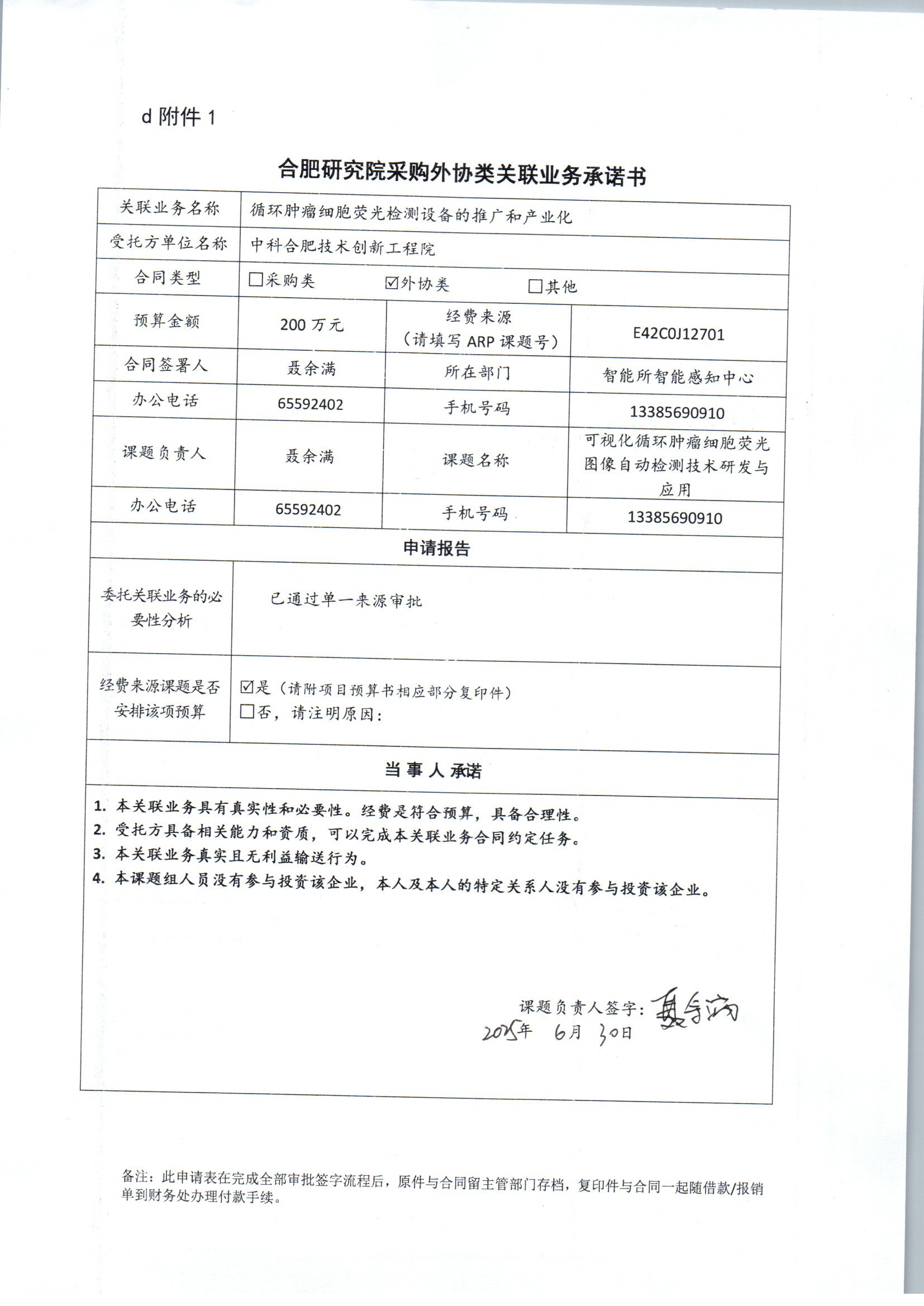 根据《中国科学院关于加强科研项目关联业务管理的暂行规定》(科发条财字〔2015〕125号)、《中国科学院合肥物质科学研究院关于加强科研项目关联业务管理的实施细则》(科合院发资字〔2021〕8号)、《合肥研究院加强关联业务管理暂行办法》(科合院发资字〔2022〕 1号)、《合肥物质院加强关联业务管理补充规定》(科合院发资字〔2025〕1号)要求,现就我院委托中科合肥技术创新工程院进行循环肿瘤细胞荧光检测设备的推广和产业化服务的关联业务做公示。