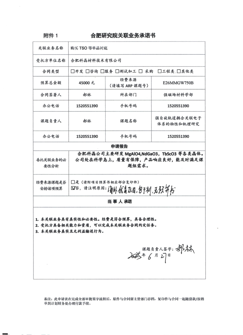 中国科学院合肥物质科学研究院强磁场科学中心郝林老师向合肥科晶材料技术有限公司购买TSO等单晶衬底。该批衬底用于实验室生长高质量薄膜样品。合肥科晶材料技术有限公司是由合肥科学岛控股有限公司与材料技术国际公司合资成立,合肥科学岛控股有限公司占股19.77%,本次采购构成关联业务交易。