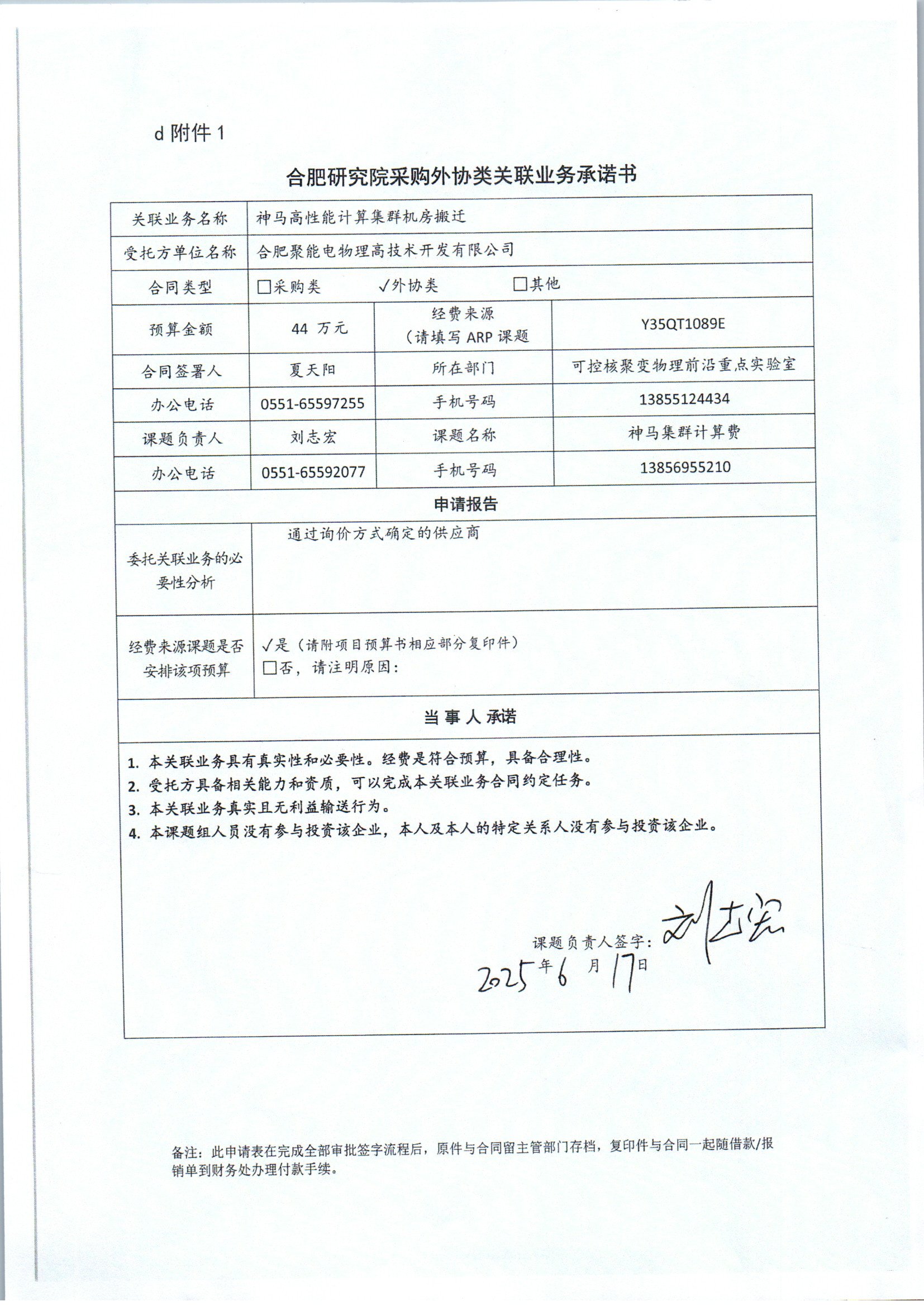 根据《中国科学院关于加强科研项目关联业务管理的暂行规定》(科发条财字〔2015〕125号)、《中国科学院合肥物质科学研究院关于加强科研项目关联业务管理的实施细则》(科合院发资字〔2021〕8号)、《合肥研究院加强关联业务管理暂行办法》(科合院发资字〔2022〕 1号)、《合肥物质院加强关联业务管理补充规定》(科合院发资字〔2025〕1号)要求,现就我院委托合肥聚能电物理高技术开发有限公司进行神马高性能计算集群机房搬迁的关联业务做公示。
