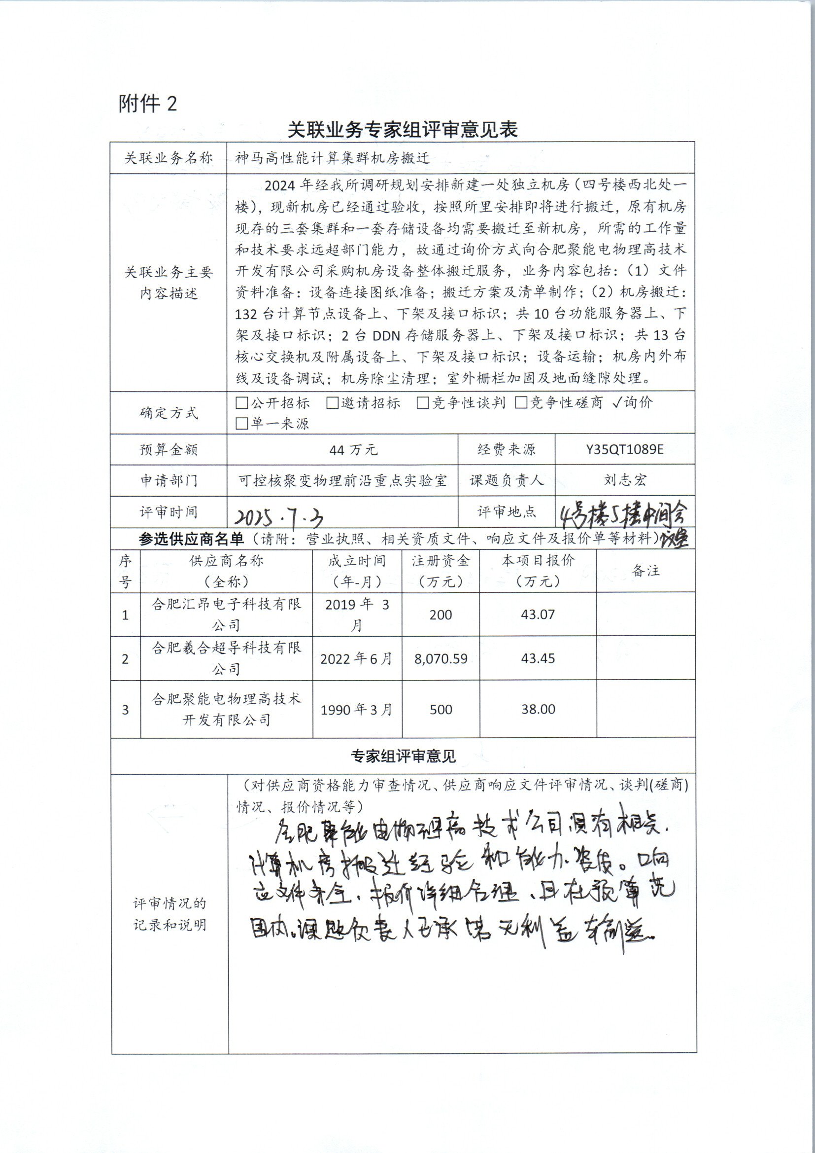 中国科学院合肥物质科学研究院等离子体物理研究所刘志宏老师委托合肥聚能电物理高技术开发有限公司进行神马高性能计算集群机房搬迁。该项服务将包含设备连接图纸准备、搬迁方案及清单制作。在此基础上将神马机房的所有设备下架并搬迁至新机房再上架调试,确保设备顺利迁移,同时完成机房除尘清理及室外栅栏加固及地面缝隙处理。合肥聚能电物理高技术开发有限公司股东之一为合肥科学岛控股有限公司,该公司在其中占股35%,本次构成关联业务交易。