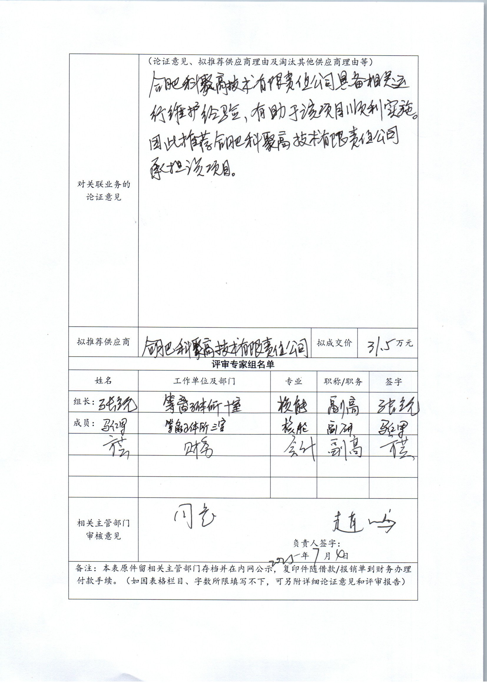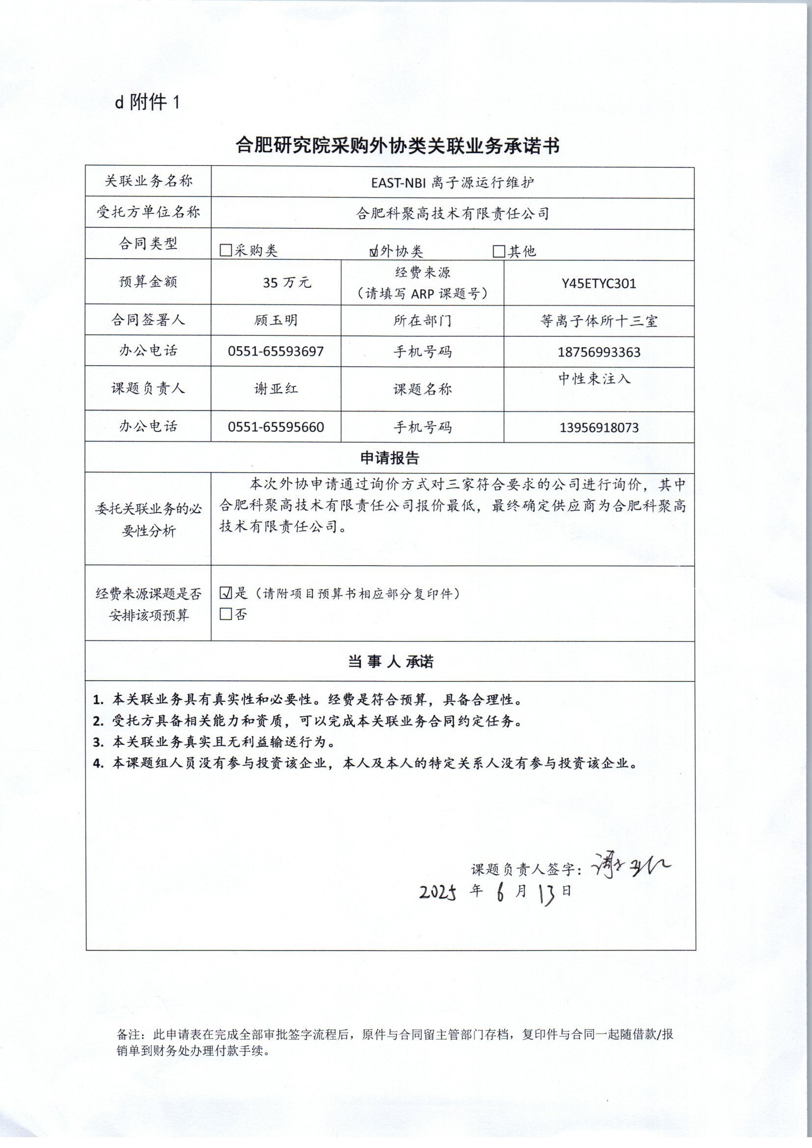 根据《中国科学院关于加强科研项目关联业务管理的暂行规定》(科发条财字〔2015〕125号)、《中国科学院合肥物质科学研究院关于加强科研项目关联业务管理的实施细则》(科合院发资字〔2021〕8号)、《合肥研究院加强关联业务管理暂行办法》(科合院发资字〔2022〕1号)、《合肥物质院加强关联业务管理补充规定》(科合院发资字〔2025〕1号)要求,现就我院委托合肥科聚高技术有限责任公司进行EAST-NBI离子源运行维护进行关联业务公示。