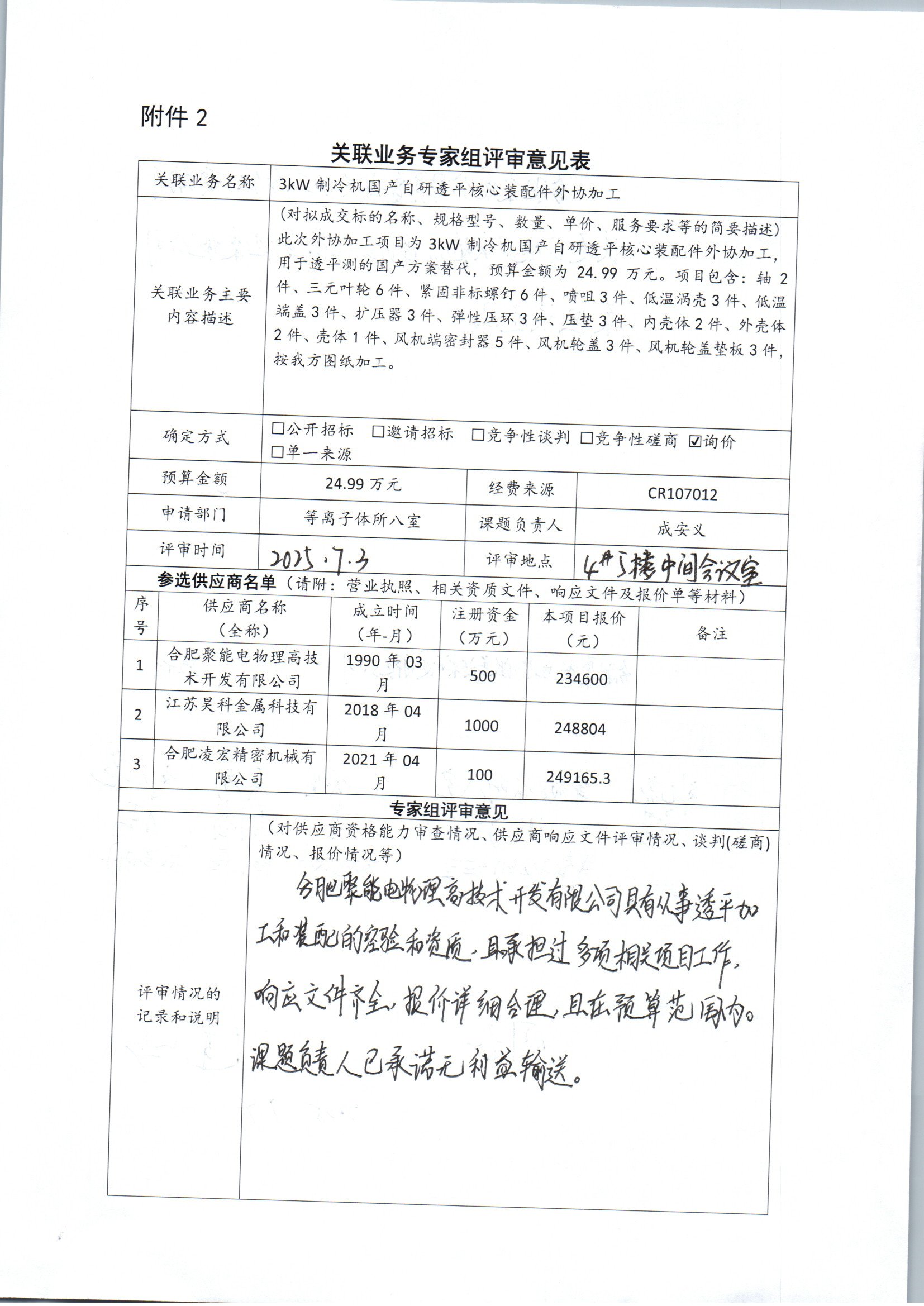 根据《中国科学院关于加强科研项目关联业务管理的暂行规定》(科发条财字〔2015〕125号)、《中国科学院合肥物质科学研究院关于加强科研项目关联业务管理的实施细则》(科合院发资字〔2021〕8号)、《合肥研究院加强关联业务管理暂行办法》(科合院发资字〔2022〕 1号)、《合肥物质院加强关联业务管理补充规定》(科合院发资字〔2025〕1号)要求,现就我院委托合肥聚能电物理高技术开发有限公司进行3kW制冷机国产自研透平核心装配件外协加工的关联业务做公示。