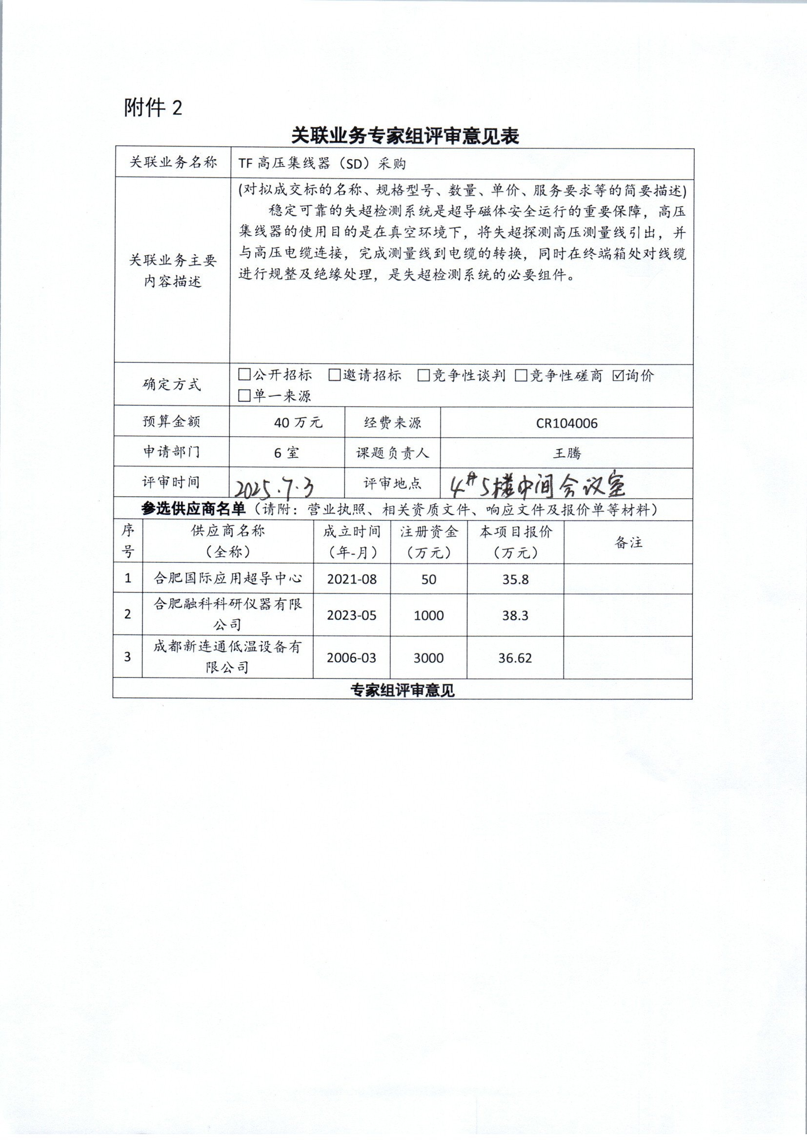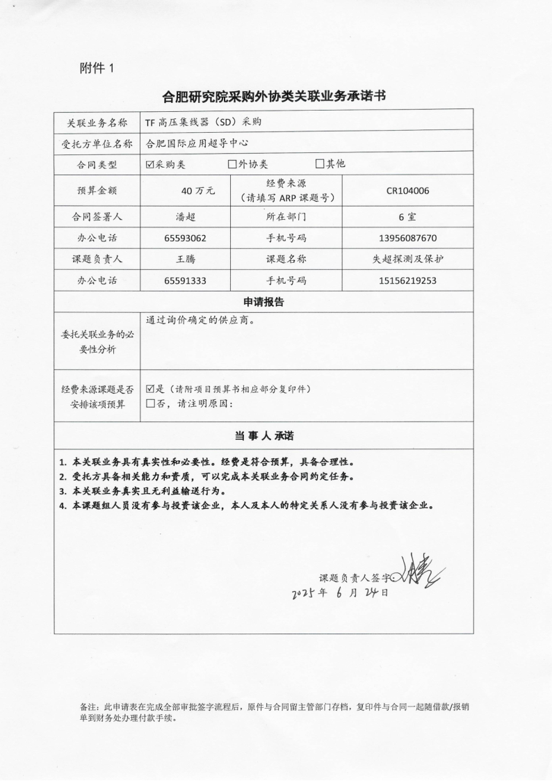 根据《中国科学院关于加强科研项目关联业务管理的暂行规定》(科发条财字〔2015〕125号)、《中国科学院合肥物质科学研究院关于加强科研项目关联业务管理的实施细则》(科合院发资字〔2021〕8号)、《合肥研究院加强关联业务管理暂行办法》(科合院发资字〔2022〕1号)、《合肥物质院加强关联业务管理补充规定》(科合院发资字〔2025〕1号)要求,现就我院向合肥国际应用超导中心采购TF高压集线器做关联业务公示。
