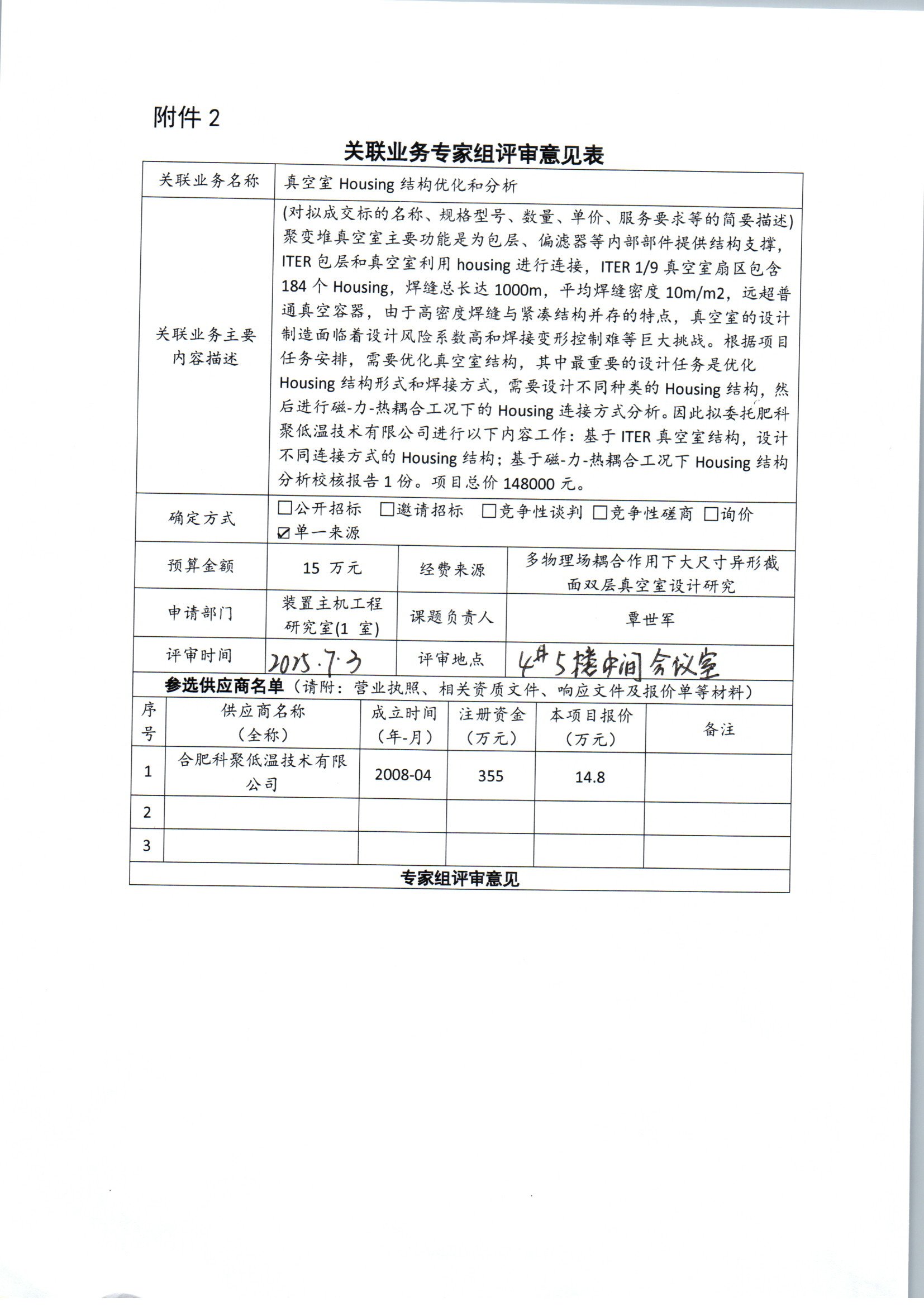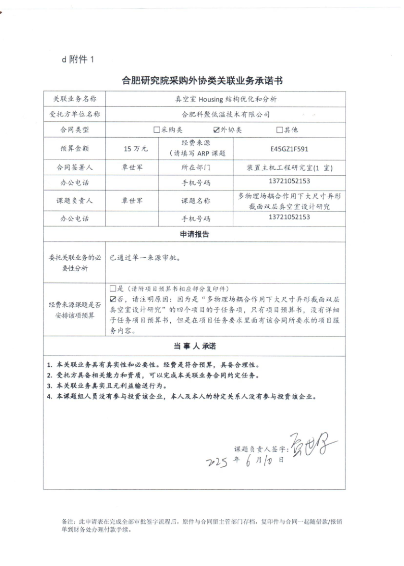 根据《中国科学院关于加强科研项目关联业务管理的暂行规定》(科发条财字〔2015〕125号)、《中国科学院合肥物质科学研究院关于加强科研项目关联业务管理的实施细则》(科合院发资字〔2021〕8号)、《合肥研究院加强关联业务管理暂行办法》(科合院发资字〔2022〕1号)、《合肥物质院加强关联业务管理补充规定》(科合院发资字〔2025〕1号)要求,现就我院委托合肥科聚低温技术有限公司进行真空室Housing结构优化和分析项目进行关联业务公示。