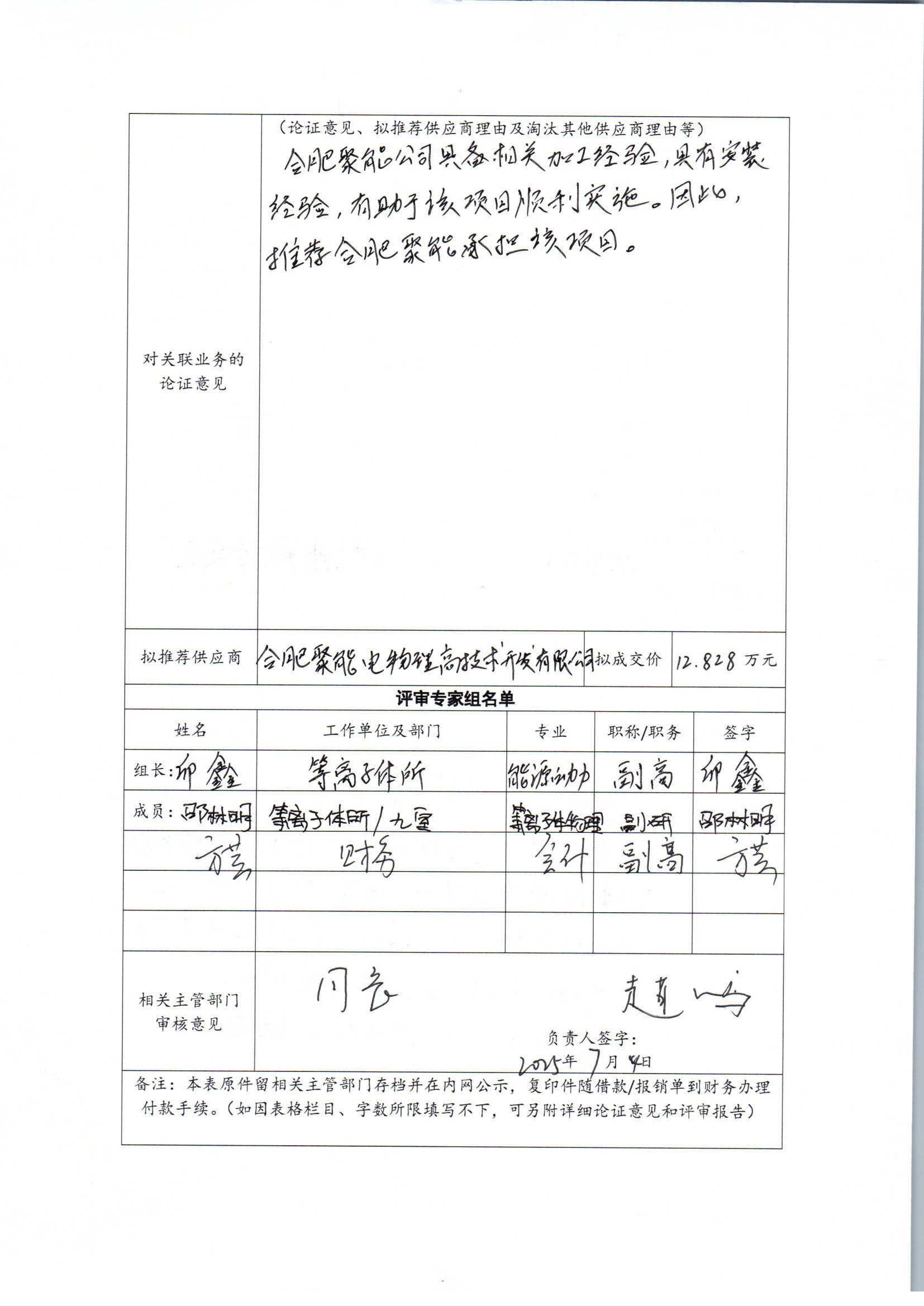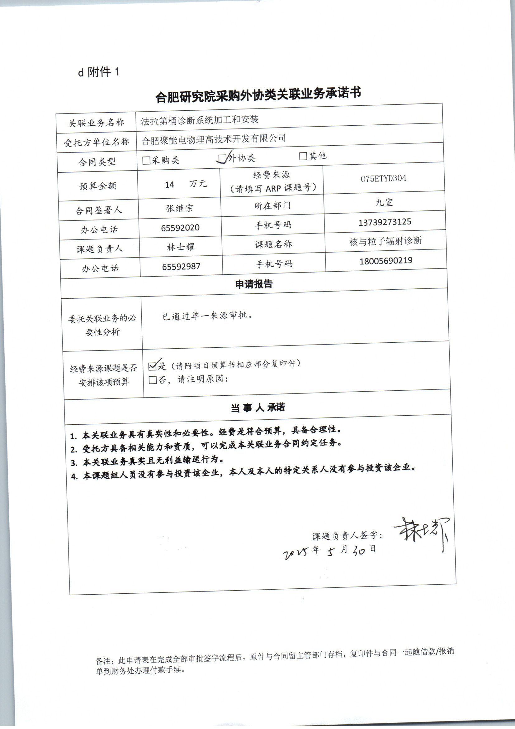 根据《中国科学院关于加强科研项目关联业务管理的暂行规定》(科发条财字〔2015〕125号)、《中国科学院合肥物质科学研究院关于加强科研项目关联业务管理的实施细则》(科合院发资字〔2021〕8号)、《合肥研究院加强关联业务管理暂行办法》(科合院发资字〔2022〕 1号)、《合肥物质院加强关联业务管理补充规定》(科合院发资字〔2025〕1号)要求,现就我院委托合肥聚能电物理高技术开发有限公司进行法拉第桶诊断系统加工和安装的关联业务做公示。
