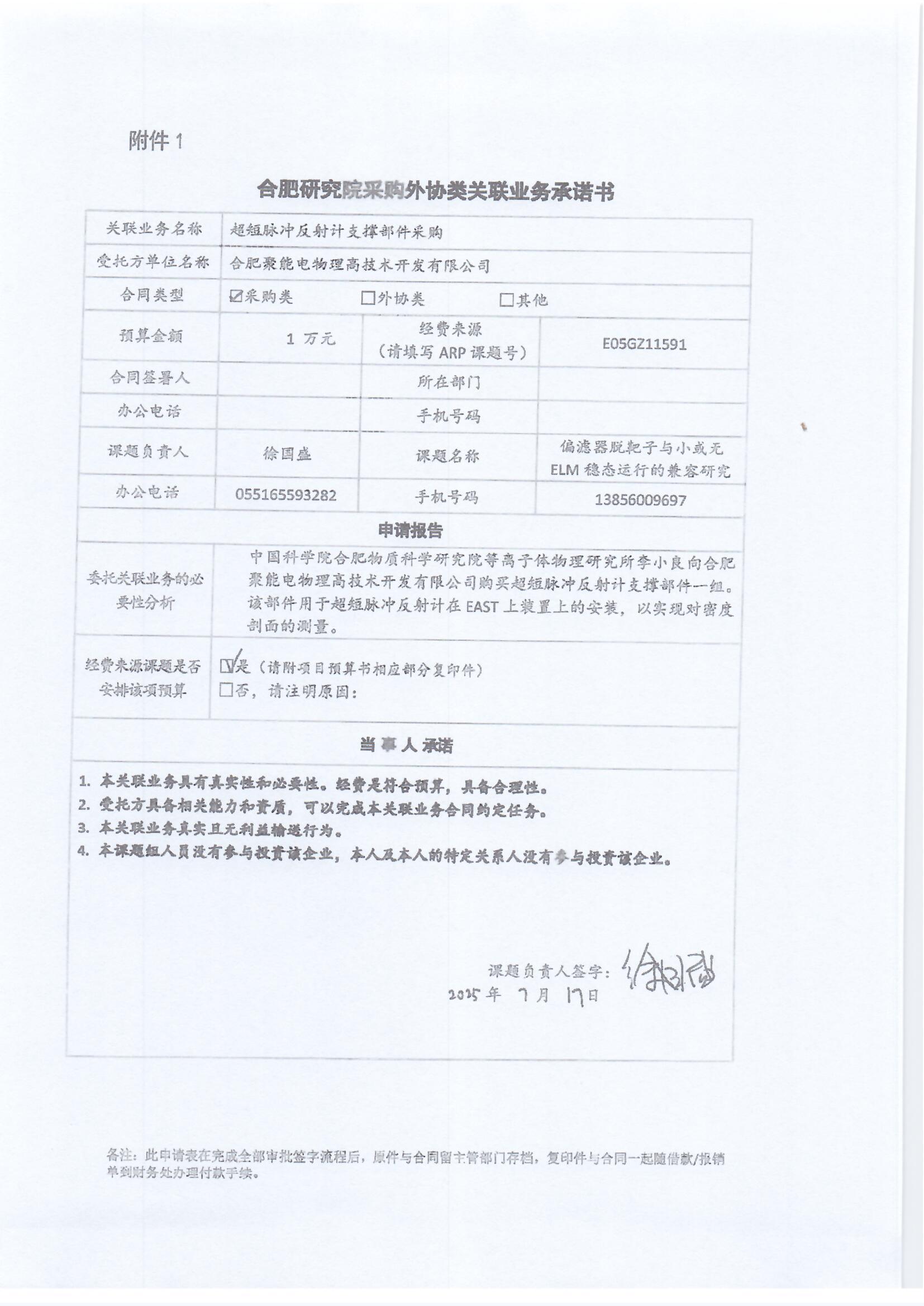 中国科学院合肥物质科学研究院等离子体物理研究所李小良老师委托合肥聚能电物理高技术开发有限公司购买超短脉冲反射计支撑部件一组。该部件用于超短脉冲反射计在EAST上装置上的安装,以实现对密度剖面的测量。合肥聚能电物理高技术开发有限公司股东之一为合肥科学岛控股有限公司,该公司在其中占股35%,本次构成关联业务交易。