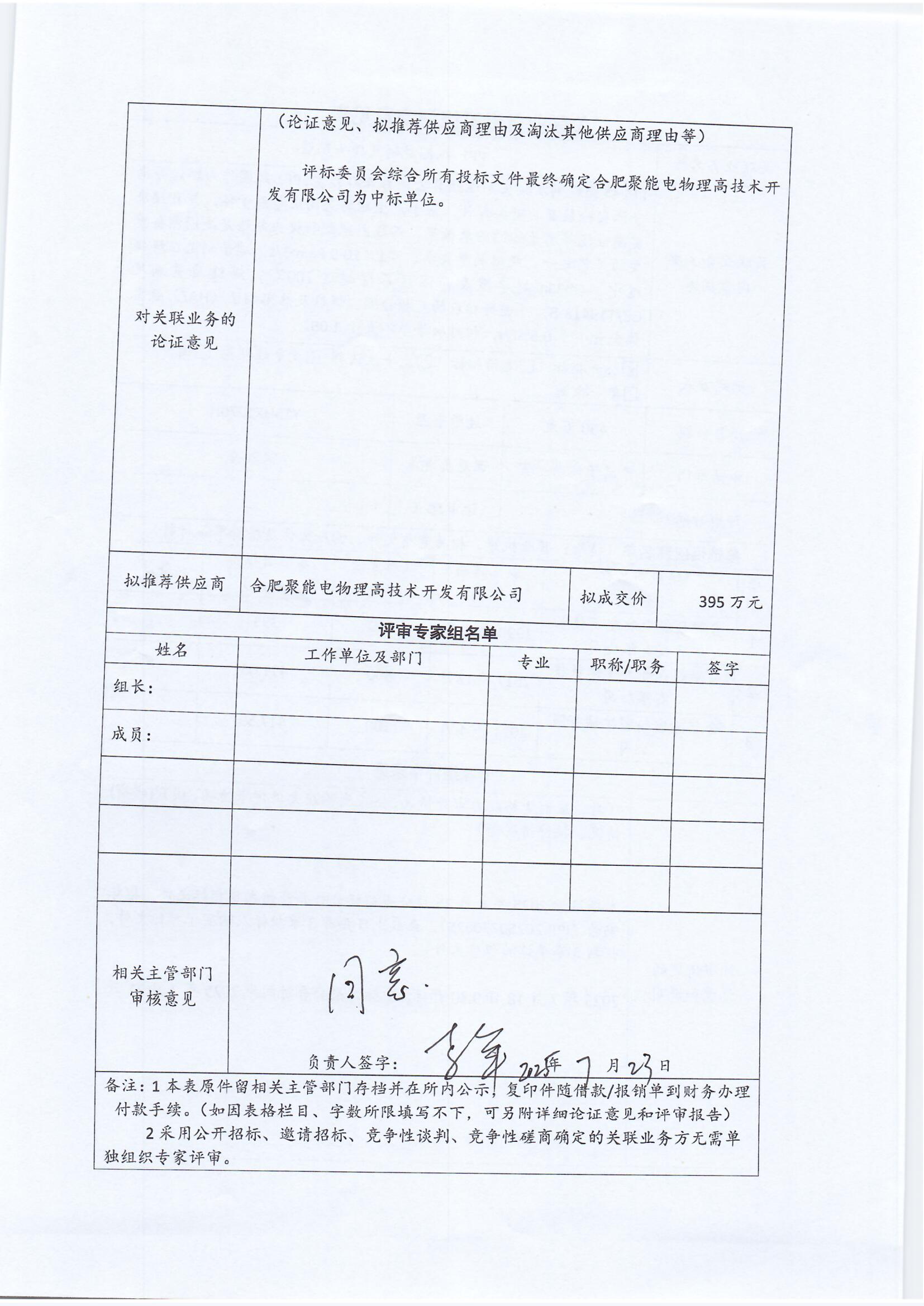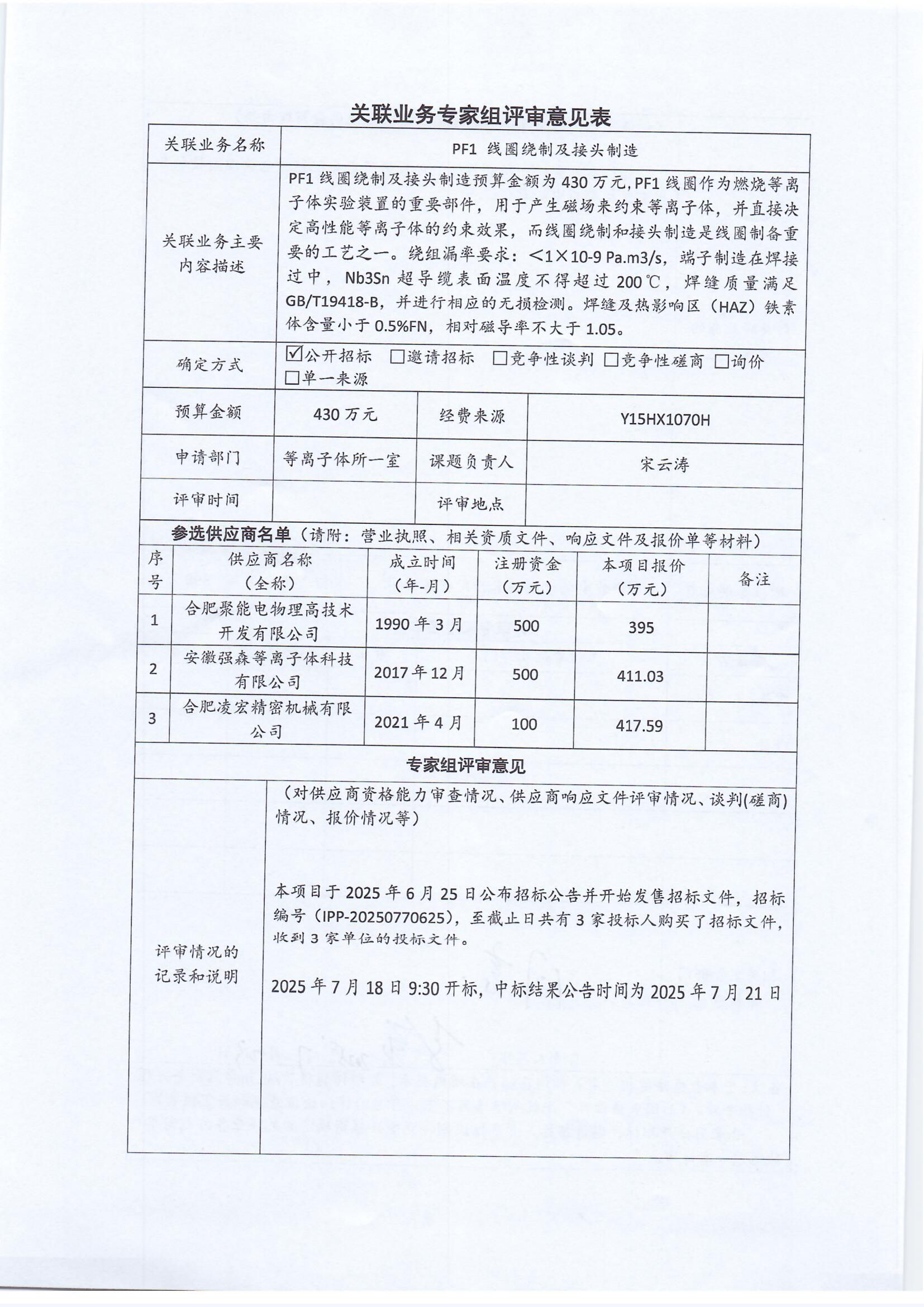 根据《中国科学院关于加强科研项目关联业务管理的暂行规定》(科发条财字〔2015〕125号)、《中国科学院合肥物质科学研究院关于加强科研项目关联业务管理的实施细则》(科合院发资字〔2021〕8号)、《合肥研究院加强关联业务管理暂行办法》(科合院发资字〔2022〕 1号)、《合肥物质院加强关联业务管理补充规定》(科合院发资字〔2025〕1号)要求,现就我院委托合肥聚能电物理高技术开发有限公司进行 PF1 线圈绕制及接头制造外协服务的关联业务做公示。