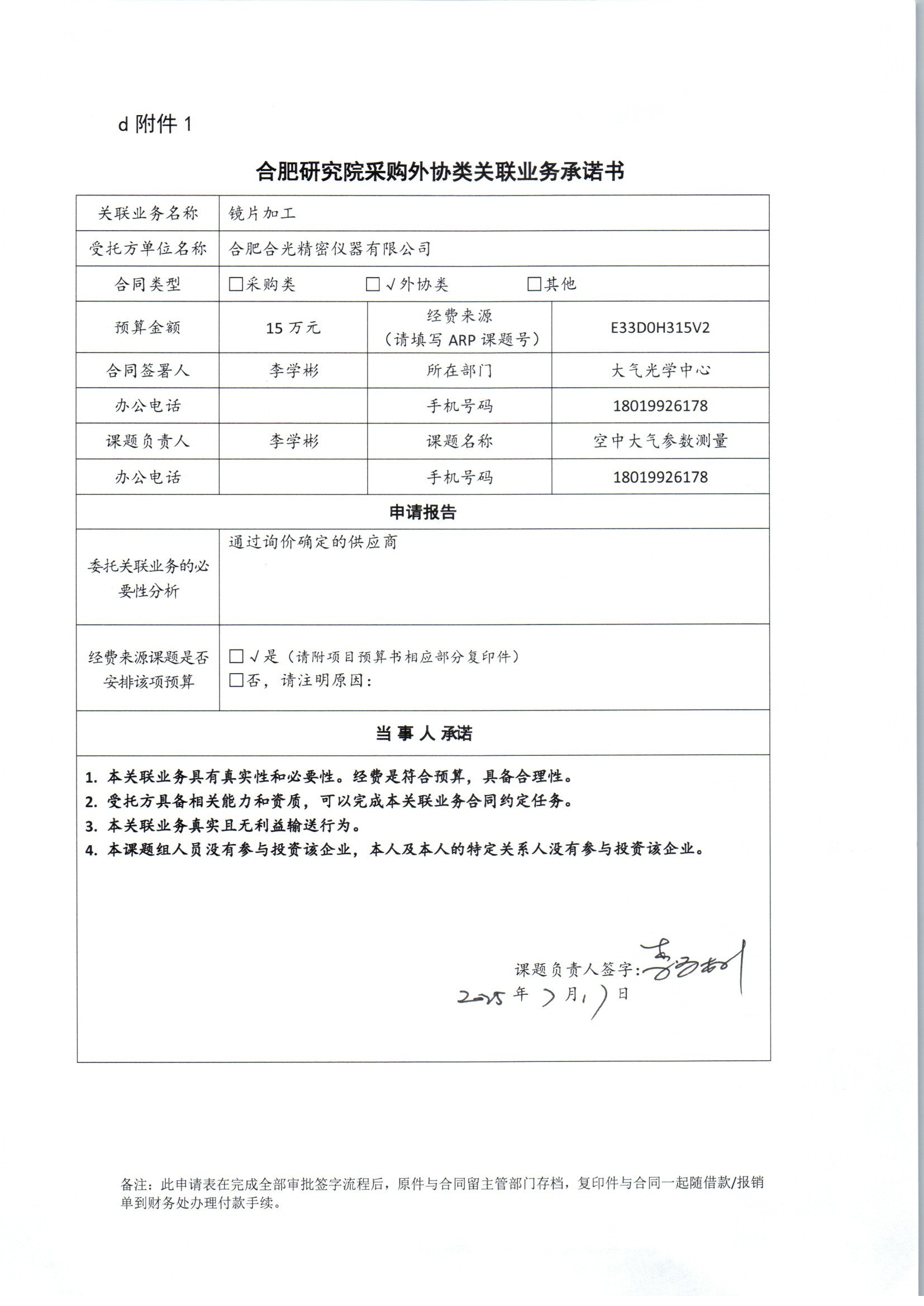 中国科学院合肥物质科学研究院光学精密机械研究所李学彬老师,委托合肥合光精密仪器有限公司进行镜片加工,主要用于空中大气参数测量项目气溶胶粒度仪和气溶胶吸收仪等设备的发射和接收光学单元镜片更换。合肥科学岛控股公司持有合肥合光精密仪器有限公司100%的股份,本次采购构成关联业务交易。