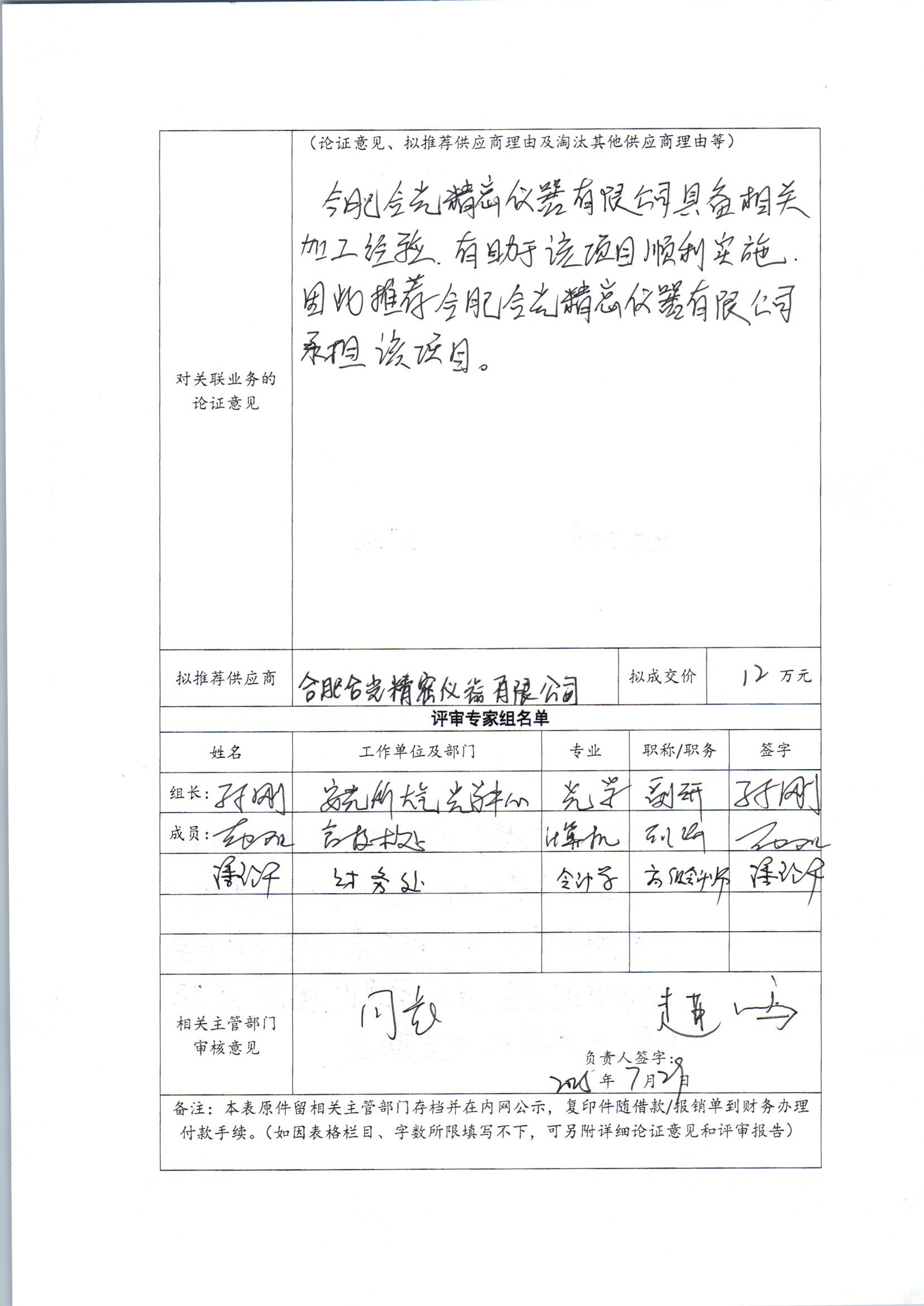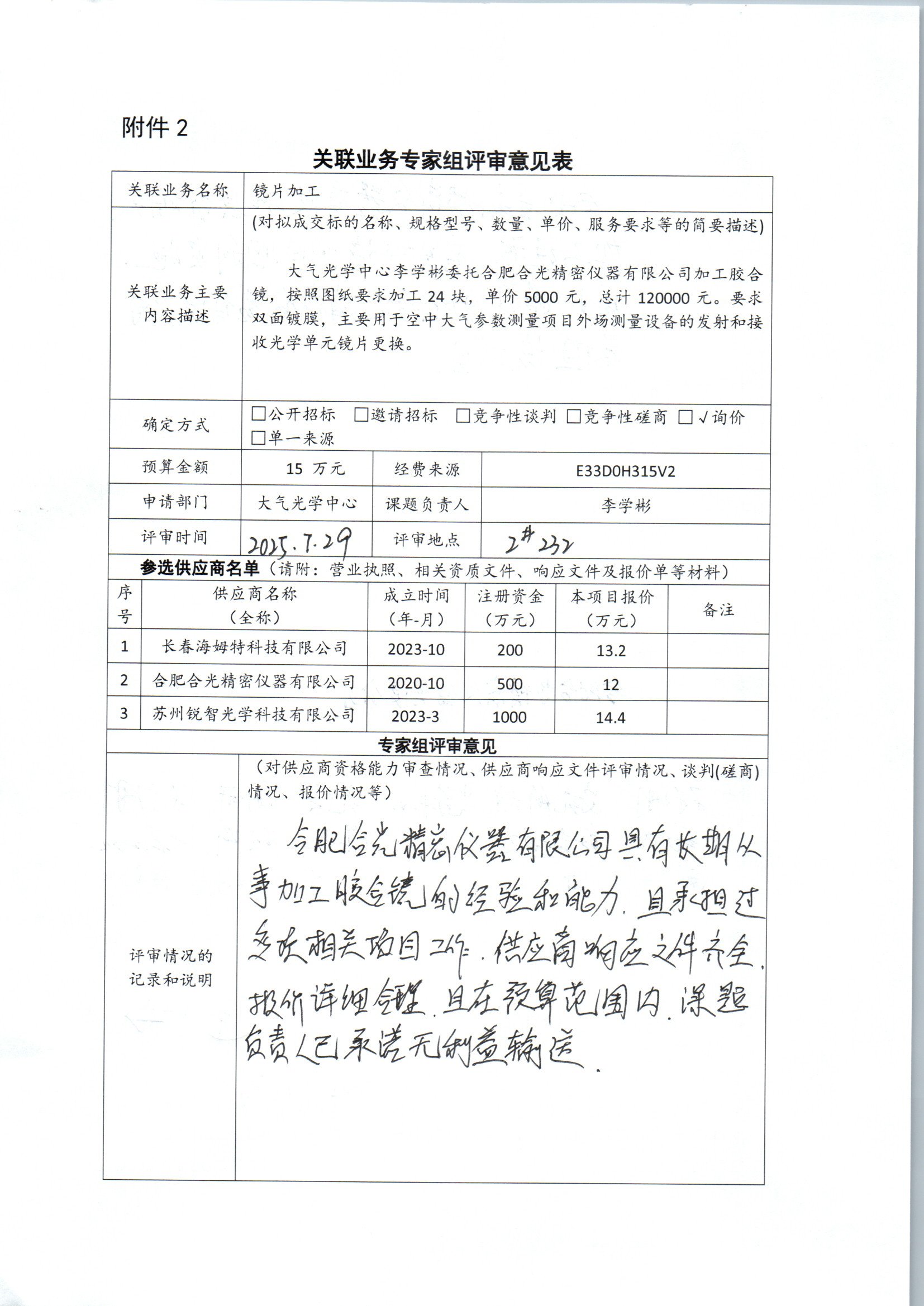 根据《中国科学院关于加强科研项目关联业务管理的暂行规定》(科发条财字〔2015〕125号)、《中国科学院合肥物质科学研究院关于加强科研项目关联业务管理的实施细则》(科合院发资字〔2021〕8号)、《合肥研究院加强关联业务管理暂行办法》(科合院发资字〔2022〕1号)、《合肥物质院加强关联业务管理补充规定》(科合院发资字〔2025〕1号)要求,现就我院委托合肥合光精密仪器有限公司进行镜片加工项目进行关联业务公示。