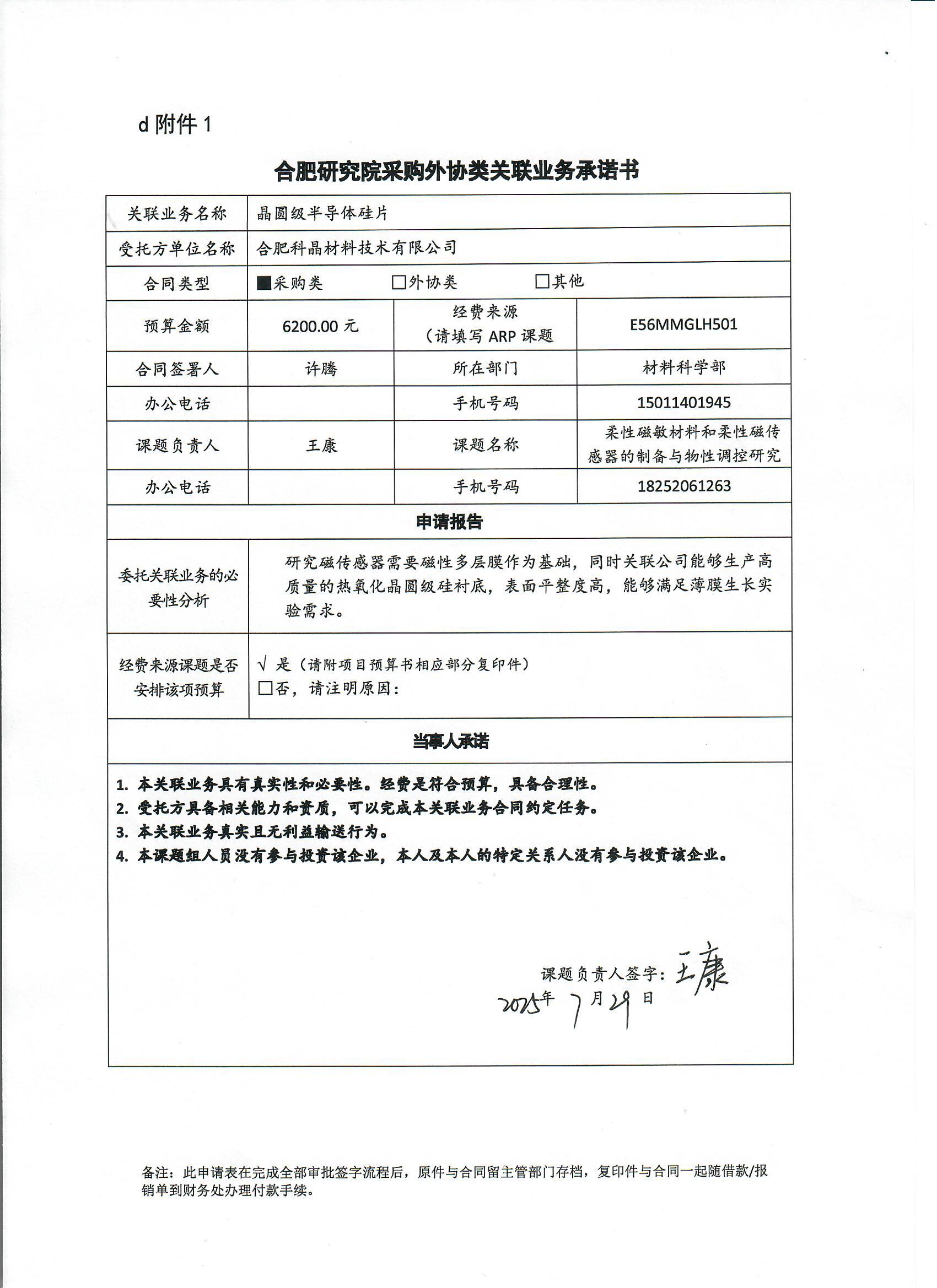 根据《中国科学院关于加强科研项目关联业务管理的暂行规定》(科发条财字〔2015〕125号)、《中国科学院合肥物质科学研究院关于加强科研项目关联业务管理的实施细则》(科合院发资字〔2021〕8号)、《合肥研究院加强关联业务管理暂行办法》(科合院发资字〔2022〕1号)、《合肥物质院加强关联业务管理补充规定》(科合院发资字〔2025〕1号)要求,现就我院向合肥科晶材料技术有限公司购买晶圆级半导体硅片进行关联业务公示。