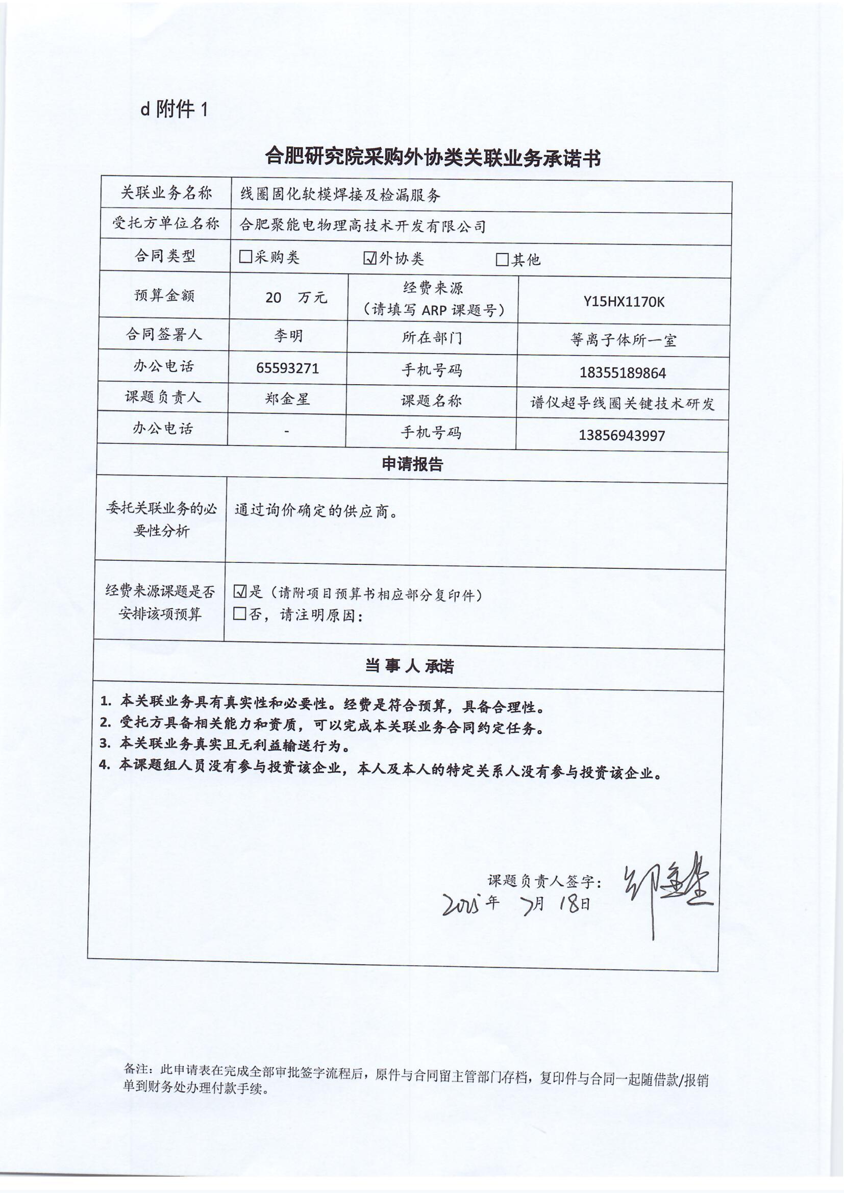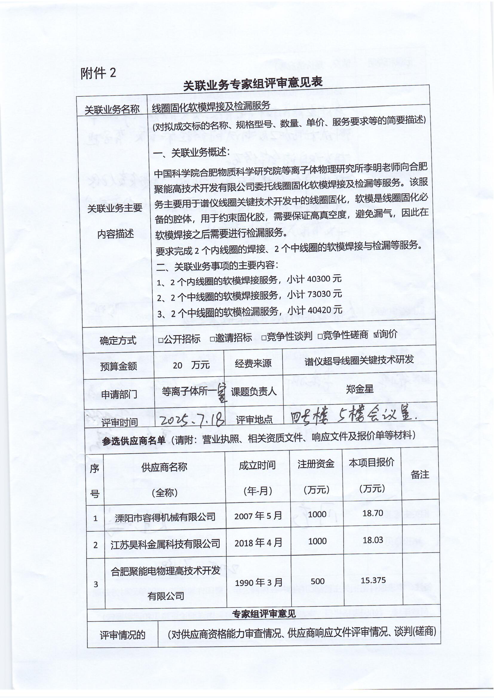 根据《中国科学院关于加强科研项目关联业务管理的暂行规定》(科发条财字〔2015〕125号)、《中国科学院合肥物质科学研究院关于加强科研项目关联业务管理的实施细则》(科合院发资字〔2021〕8号)、《合肥研究院加强关联业务管理暂行办法》(科合院发资字〔2022〕 1号)、《合肥物质院加强关联业务管理补充规定》(科合院发资字〔2025〕1号)要求,现就我院委托合肥聚能电物理高技术开发有限公司进行线圈固化软模焊接及检漏等服务的关联业务做公示。
