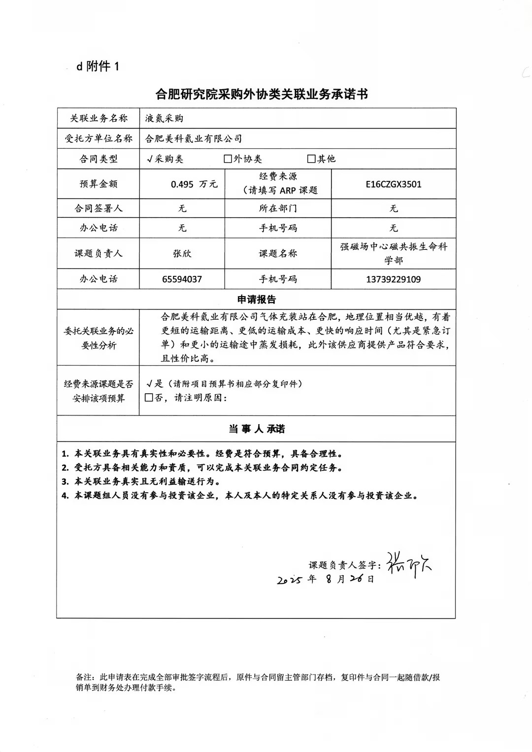 根据《中国科学院关于加强科研项目关联业务管理的暂行规定》(科发条财字〔2015〕125号)、《中国科学院合肥物质科学研究院关于加强科研项目关联业务管理的实施细则》(科合院发资字〔2021〕8号)、《合肥研究院加强关联业务管理暂行办法》(科合院发资字〔2022〕 1号)、《合肥物质院加强关联业务管理补充规定》(科合院发资字〔2025〕1号)要求,现就我院向合肥美科氦业有限公司采购1155L液氮的关联业务做公示。