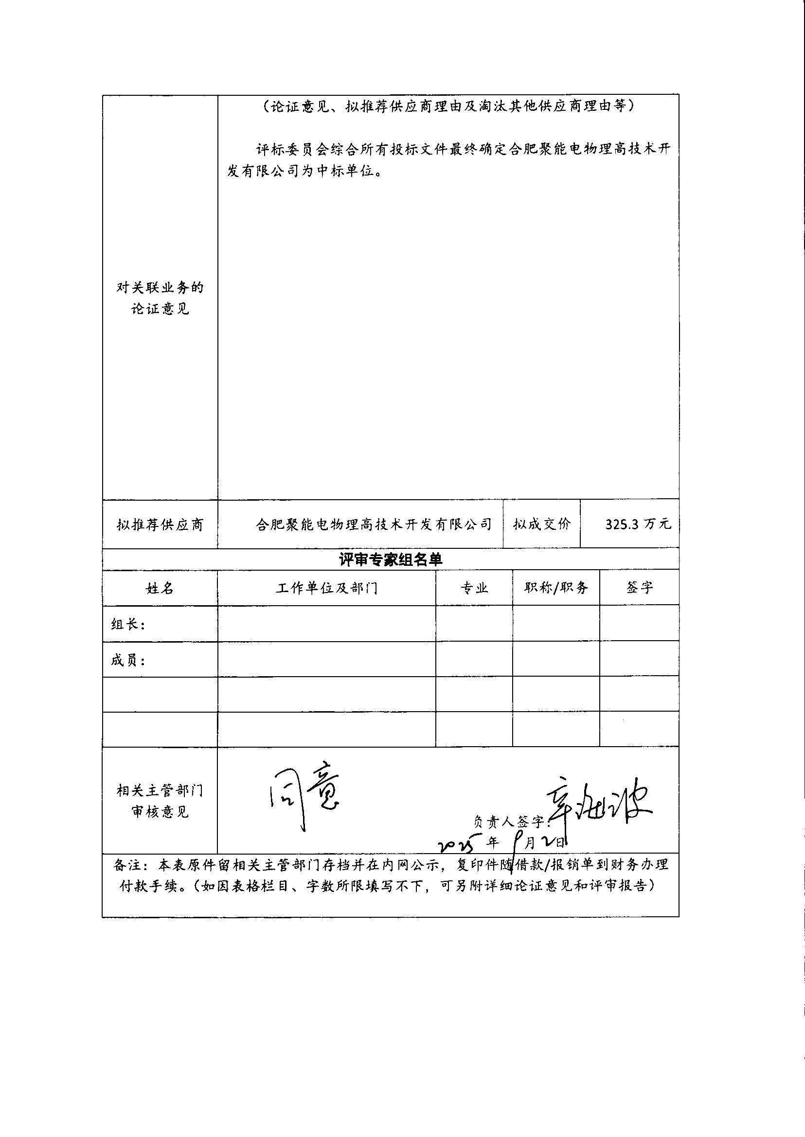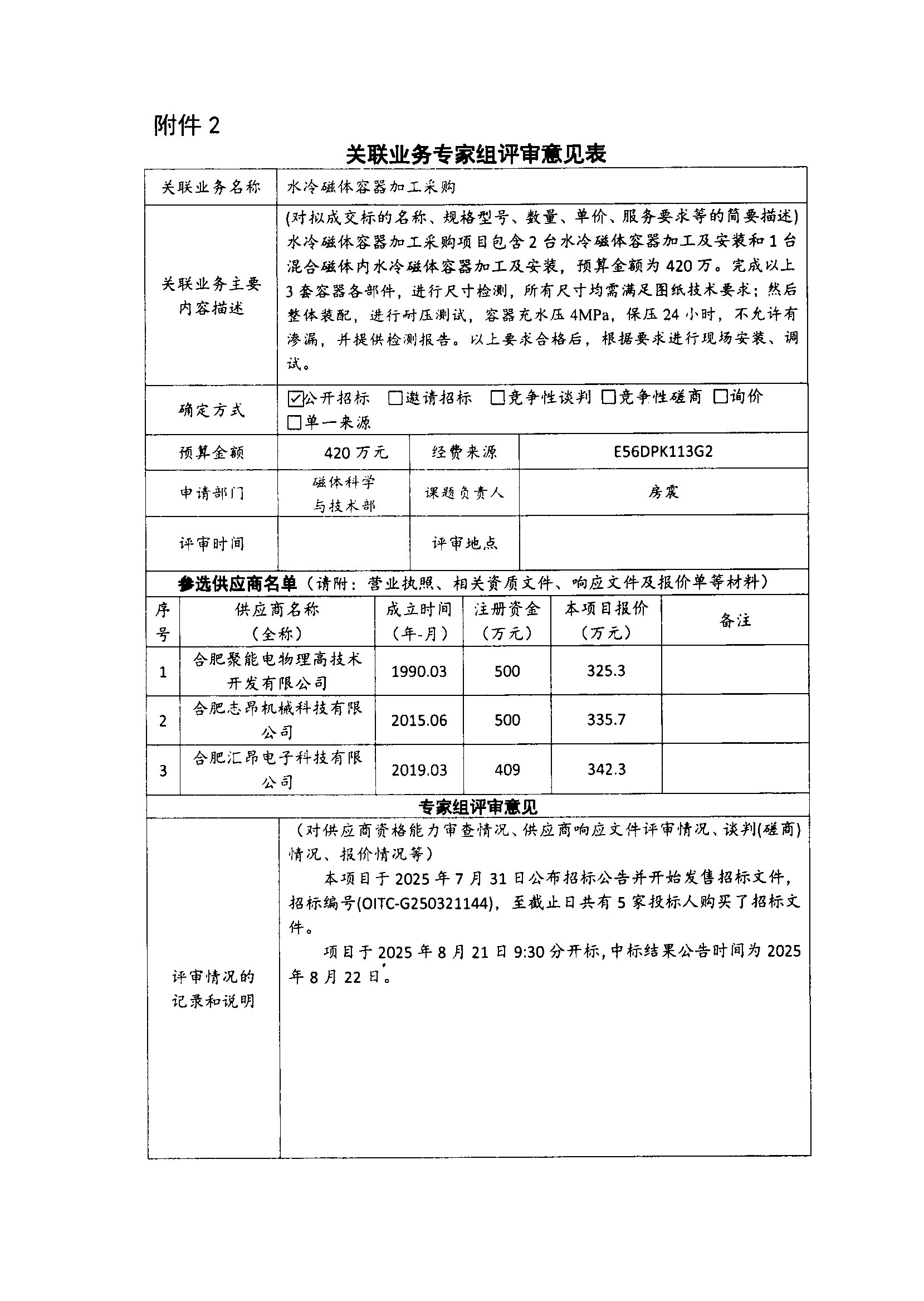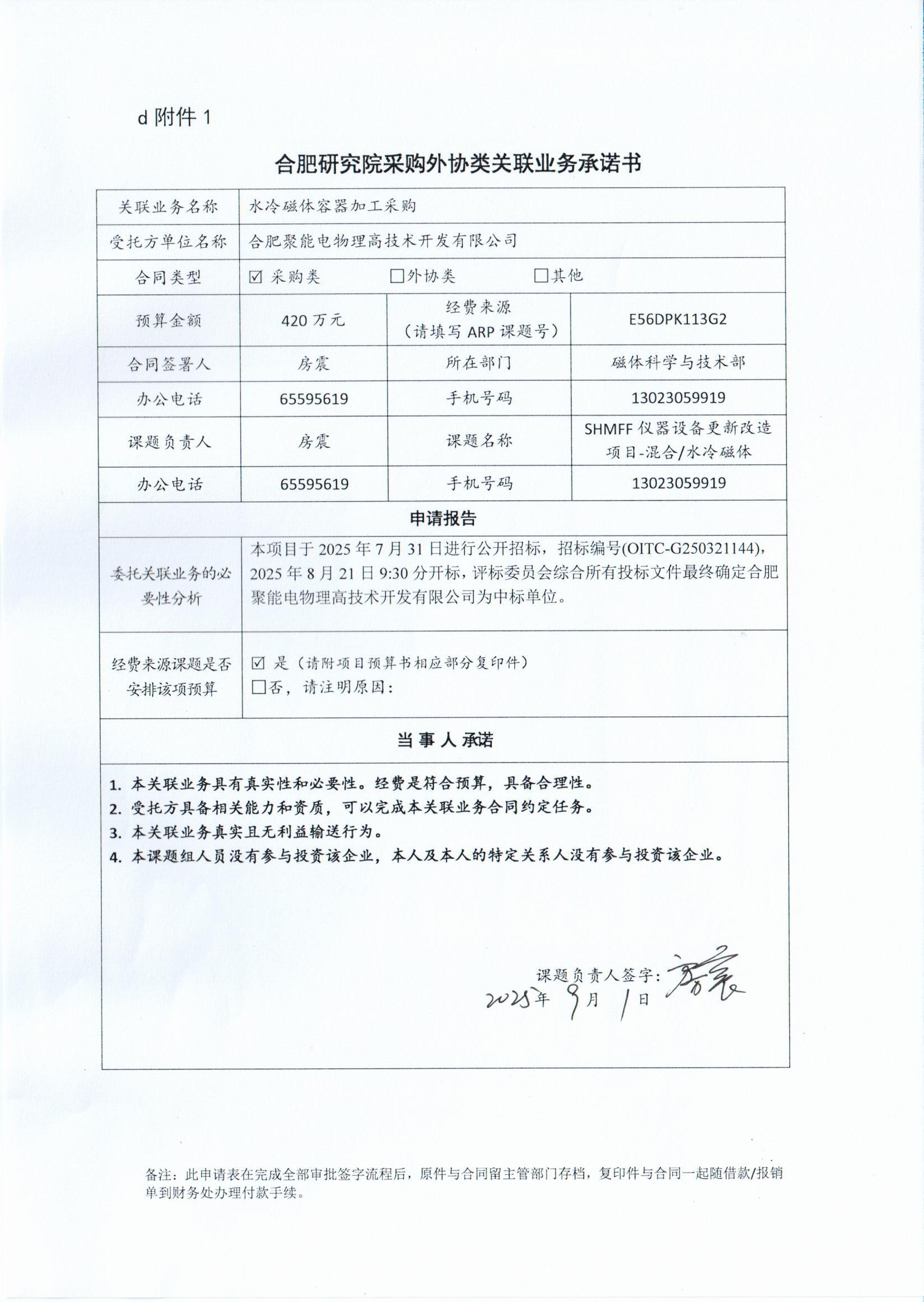 根据《中国科学院关于加强科研项目关联业务管理的暂行规定》(科发条财字〔2015〕125号)、《中国科学院合肥物质科学研究院关于加强科研项目关联业务管理的实施细则》(科合院发资字〔2021〕8号)、《合肥研究院加强关联业务管理暂行办法》(科合院发资字〔2022〕 1号)、《合肥物质院加强关联业务管理补充规定》(科合院发资字〔2025〕1号)要求,现就我院委托合肥聚能电物理高技术开发有限公司进行水冷磁体容器加工采购的关联业务做公示。