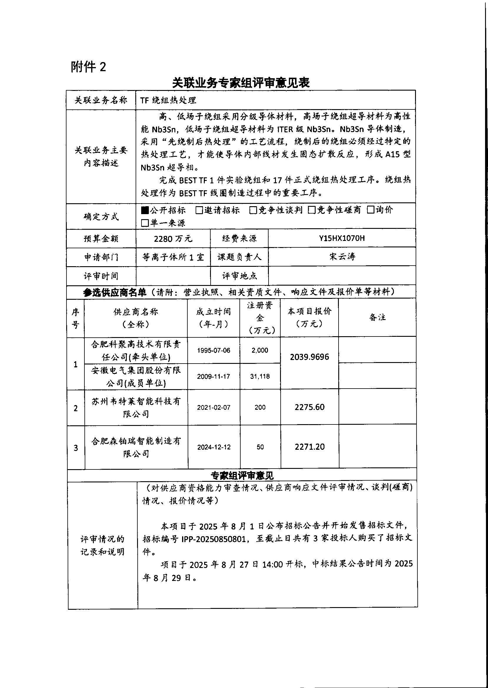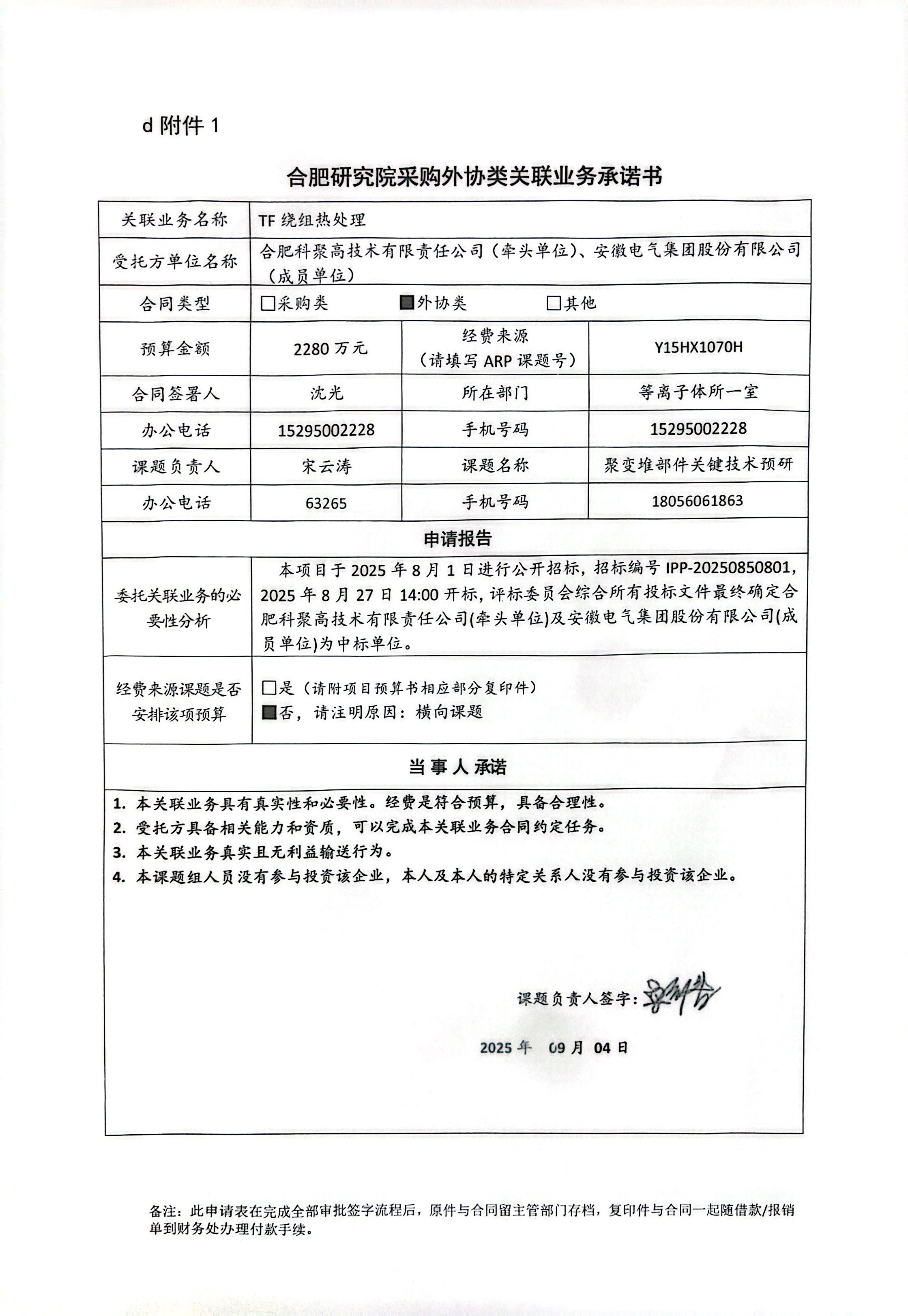 根据《中国科学院关于加强科研项目关联业务管理的暂行规定》(科发条财字〔2015〕125号)、《中国科学院合肥物质科学研究院关于加强科研项目关联业务管理的实施细则》(科合院发资字〔2021〕8号)、《合肥研究院加强关联业务管理暂行办法》(科合院发资字〔2022〕1号)、《合肥物质院加强关联业务管理补充规定》(科合院发资字〔2025〕1号)要求,现就合肥科聚高技术有限责任责任公司作为牵头单位,承担我单位TF绕组热处理进行关联业务公示。