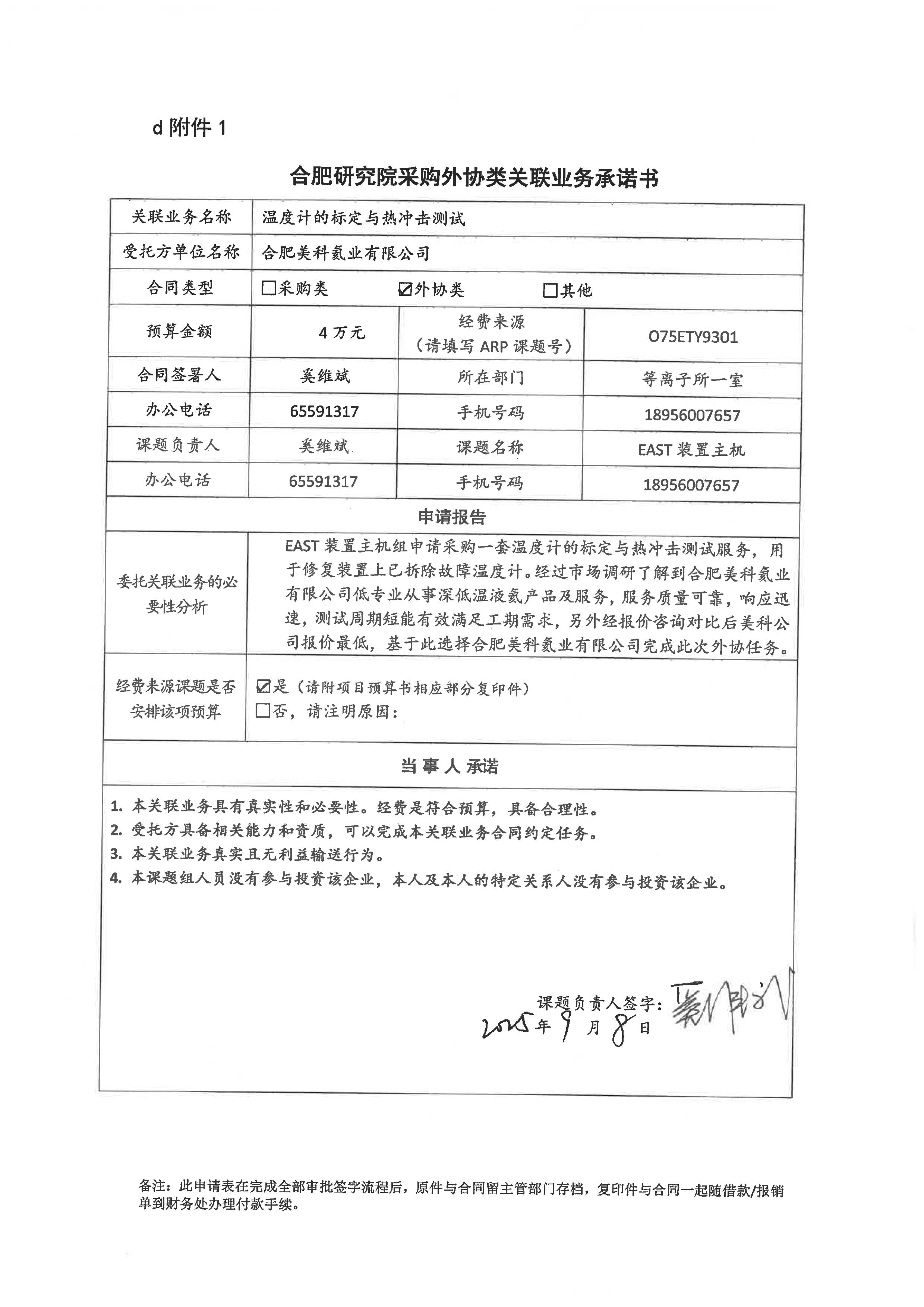 中国科学院合肥物质科学研究院等离子体物理研究所奚维斌老师委托合肥美科氦业有限公司进行温度计的标定与热冲击测试服务。该测试服务主要针对EAST装置主机与馈线系统中已拆卸故障低温温度传感器进行低温环境标定测试,标定完成后进行常温-液氦温区冷热循环测试服务,以验证标定结果的可靠性与可重复性,藉以此也实现对新标定温度传感器的老化测试,使之更稳定。合肥美科氦业有限公司股东包括合肥科学岛控股有限公司,占该公司49%的股份,本次构成关联业务交易。