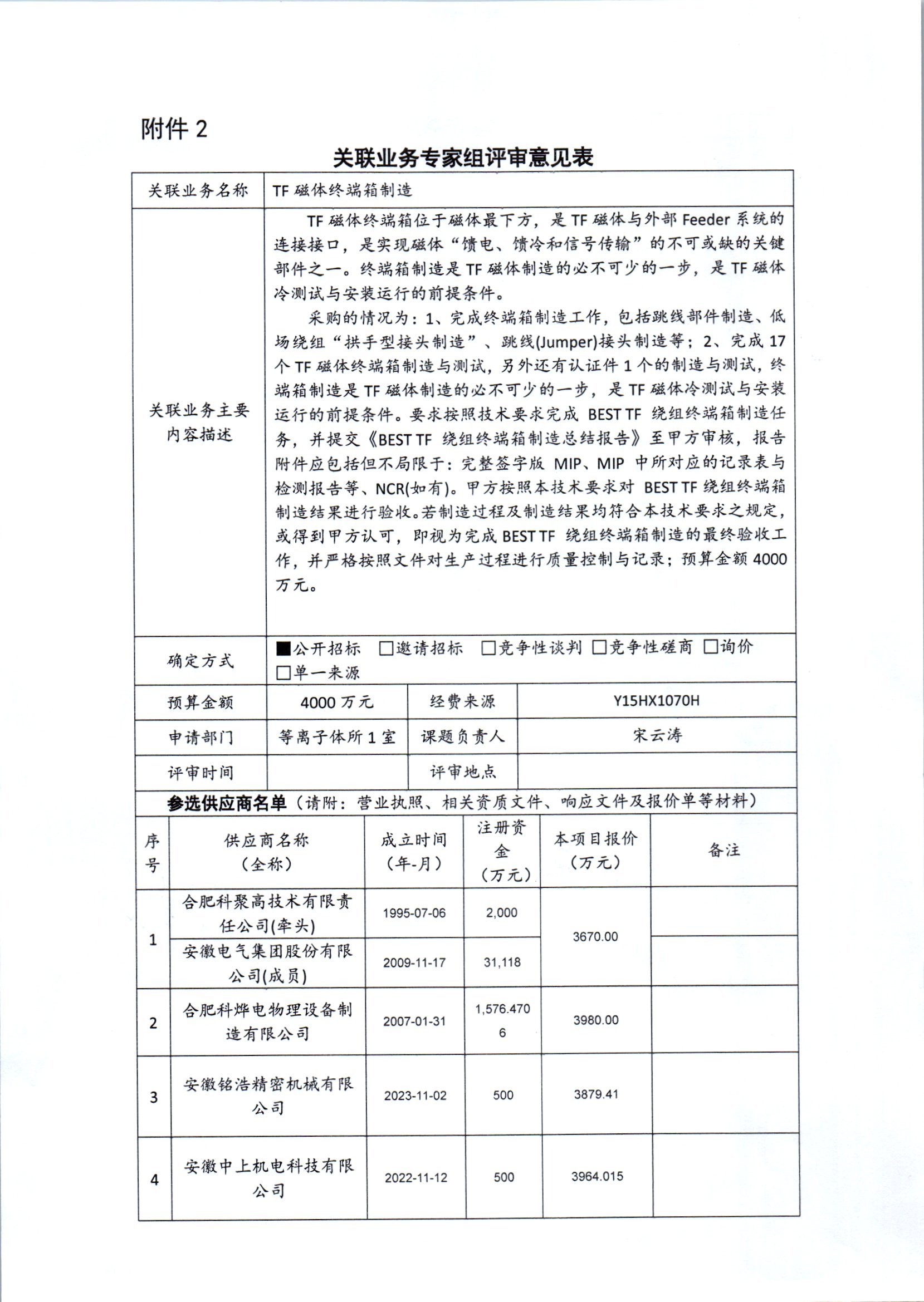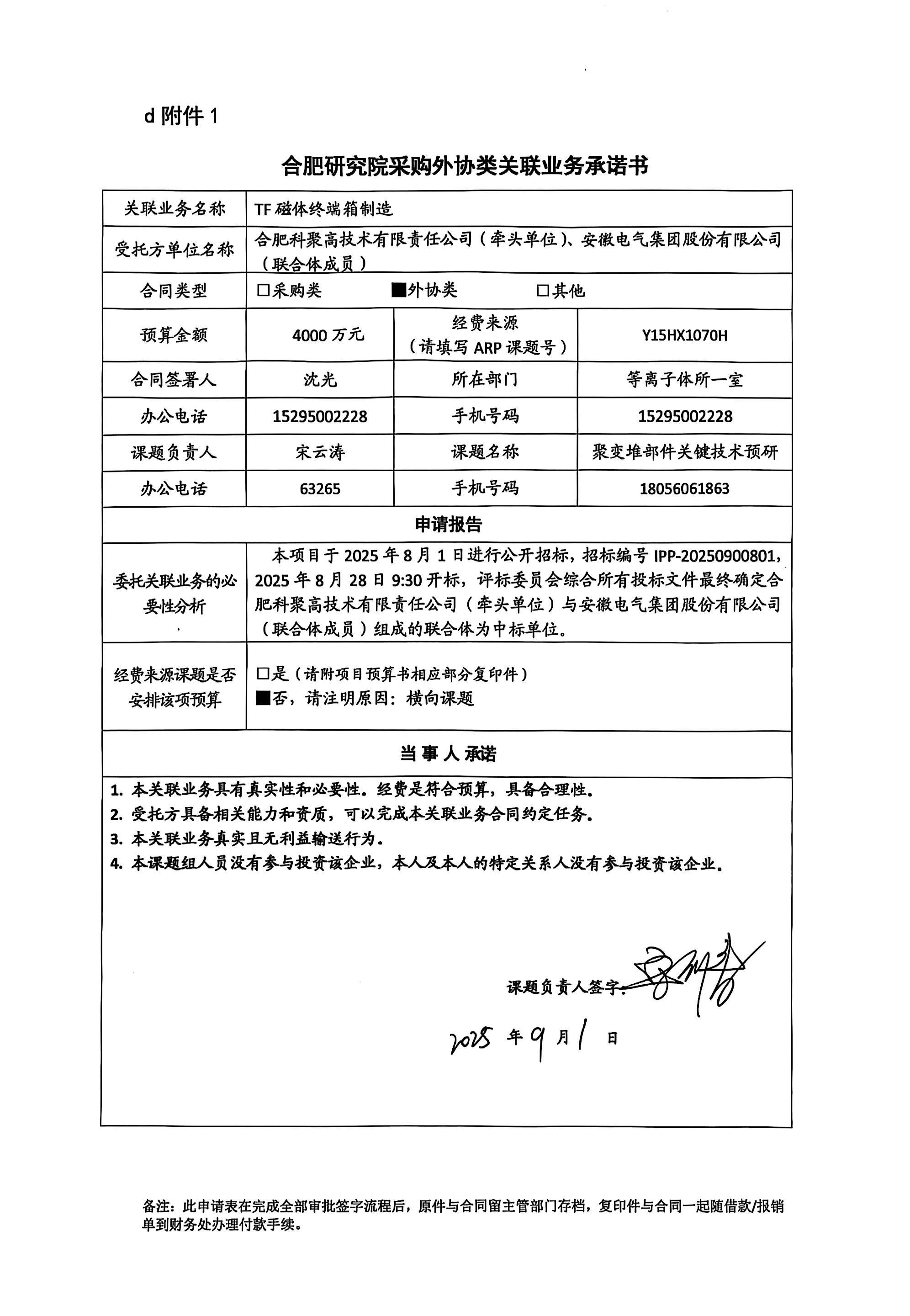 根据《中国科学院关于加强科研项目关联业务管理的暂行规定》(科发条财字〔2015〕125号)、《中国科学院合肥物质科学研究院关于加强科研项目关联业务管理的实施细则》(科合院发资字〔2021〕8号)、《合肥研究院加强关联业务管理暂行办法》(科合院发资字〔2022〕1号)、《合肥物质院加强关联业务管理补充规定》(科合院发资字〔2025〕1号)要求,现就合肥科聚高技术有限责任责任公司作为牵头单位,承担我单位TF磁体终端箱制造进行关联业务公示。