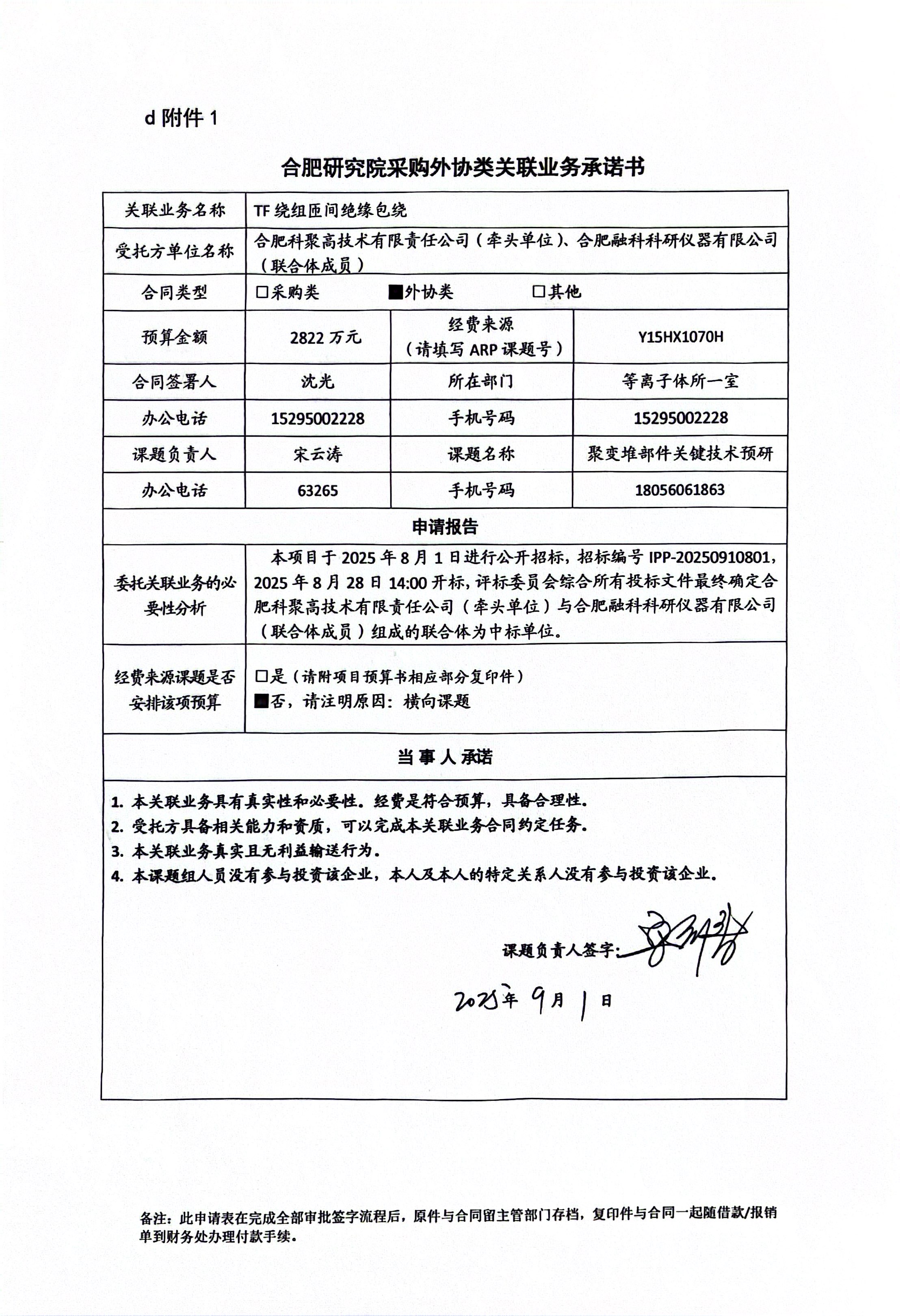 根据《中国科学院关于加强科研项目关联业务管理的暂行规定》(科发条财字〔2015〕125号)、《中国科学院合肥物质科学研究院关于加强科研项目关联业务管理的实施细则》(科合院发资字〔2021〕8号)、《合肥研究院加强关联业务管理暂行办法》(科合院发资字〔2022〕1号)、《合肥物质院加强关联业务管理补充规定》(科合院发资字〔2025〕1号)要求,现就合肥科聚高技术有限责任责任公司作为牵头单位,承担我单位BEST TF绕组匝间绝缘包绕进行关联业务公示。
