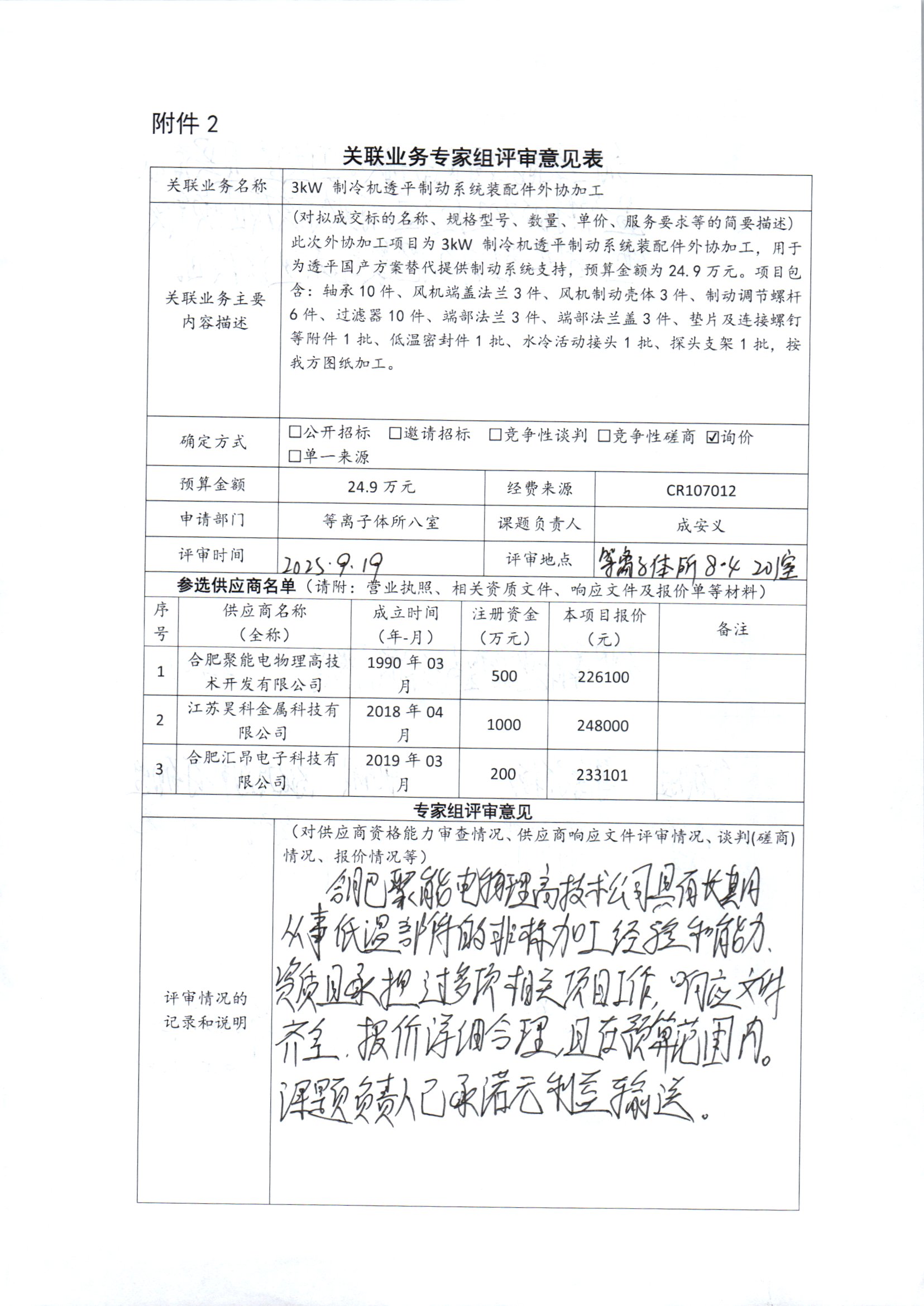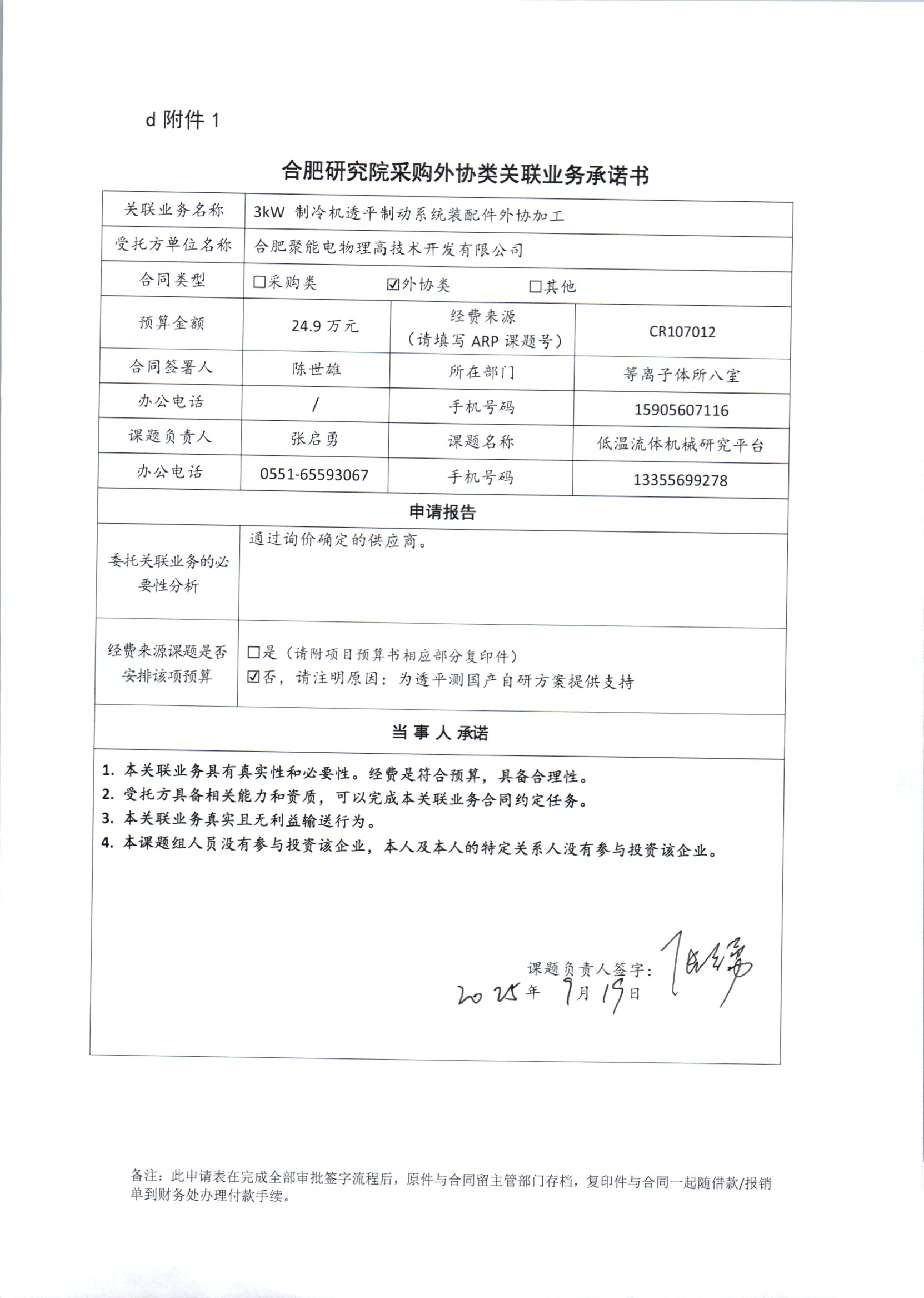 根据《中国科学院关于加强科研项目关联业务管理的暂行规定》(科发条财字〔2015〕125号)、《中国科学院合肥物质科学研究院关于加强科研项目关联业务管理的实施细则》(科合院发资字〔2021〕8号)、《合肥研究院加强关联业务管理暂行办法》(科合院发资字〔2022〕 1号)、《合肥物质院加强关联业务管理补充规定》(科合院发资字〔2025〕1号)要求,现就我院委托合肥聚能电物理高技术开发有限公司进行3kW 制冷机透平制动系统装配件外协加工的关联业务做公示。