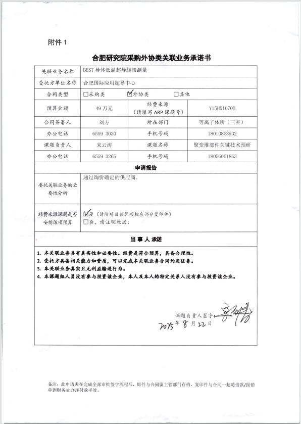 根据《中国科学院关于加强科研项目关联业务管理的暂行规定》(科发条财字〔2015〕125号)、《中国科学院合肥物质科学研究院关于加强科研项目关联业务管理的实施细则》(科合院发资字〔2021〕8号)、《合肥研究院加强关联业务管理暂行办法》(科合院发资字〔2022〕1号)、《合肥物质院加强关联业务管理补充规定》(科合院发资字〔2025〕1号)要求,现就我院委托合肥国际应用超导中心进行BEST导体低温超导线扭矩测量做关联业务公示。